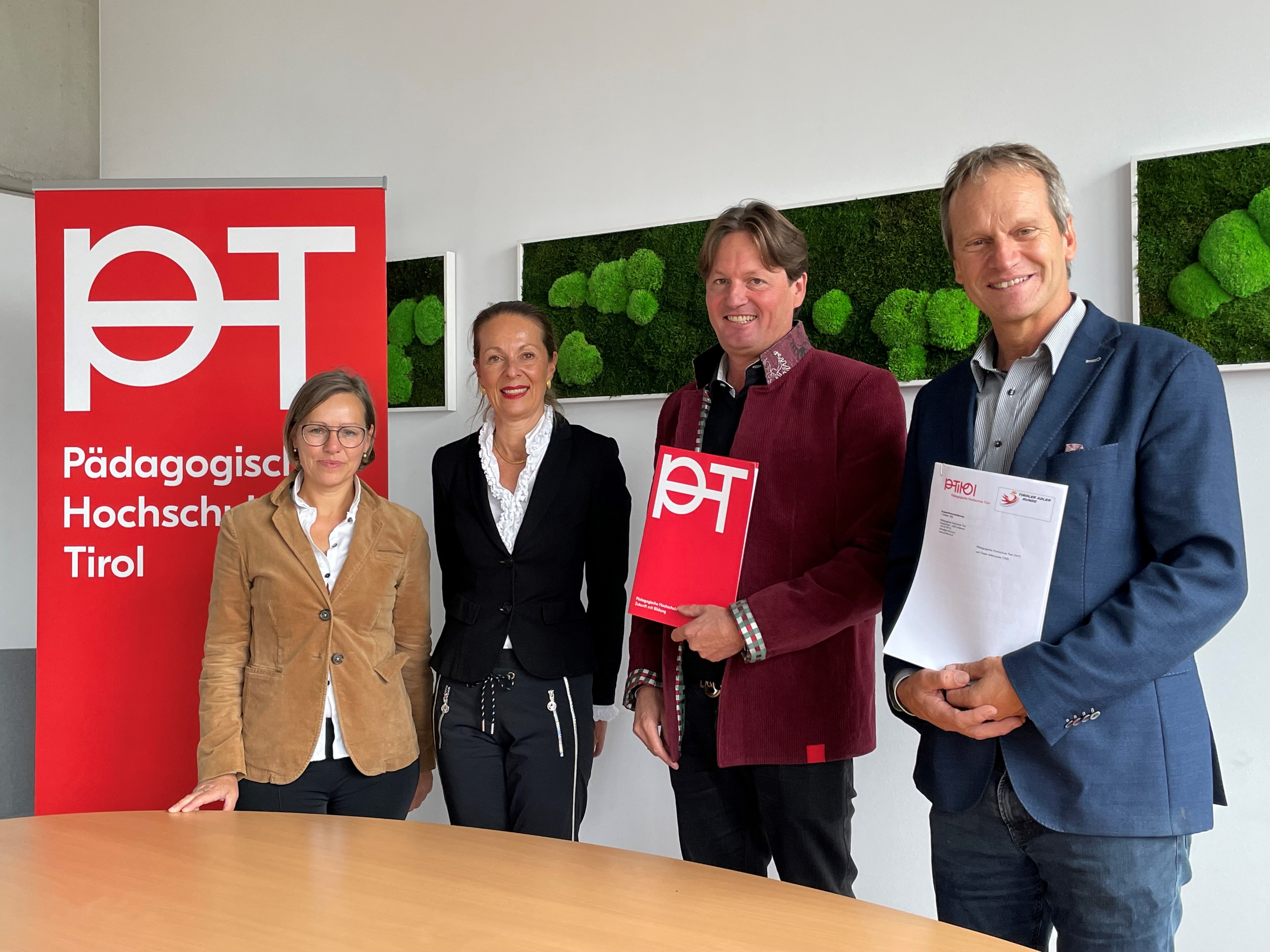 Abschluss Kooperationsvertrag PHT und Tiroler Adler Runde (v.l.): Gabriele Bogner-Steiner (Projektleiterin PHT), Irmgard Plattner (Vizerektorin PHT), Klaus Mark (Präsident der Tiroler Adler Runde), Thomas Schöpf (Rektor PHT)