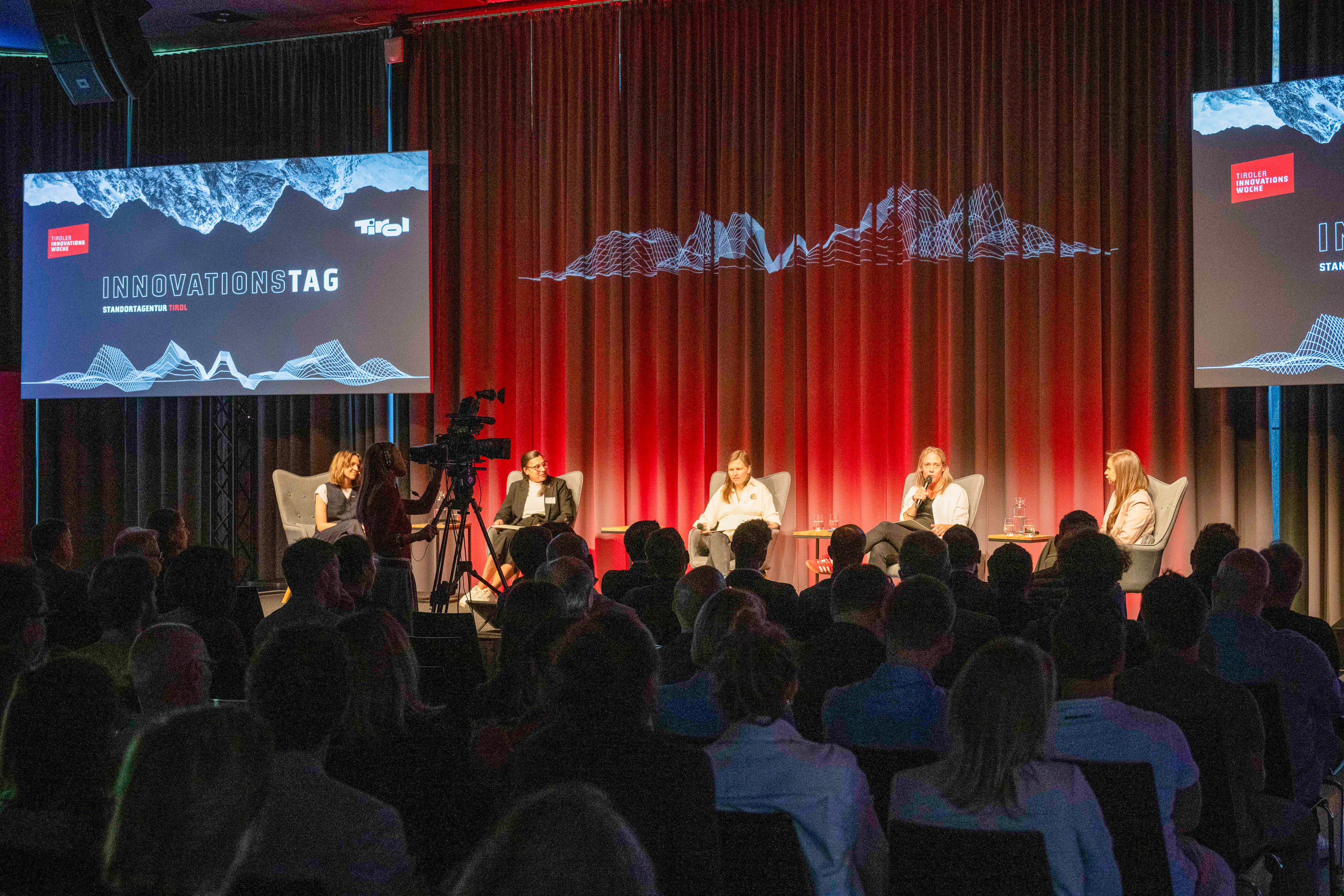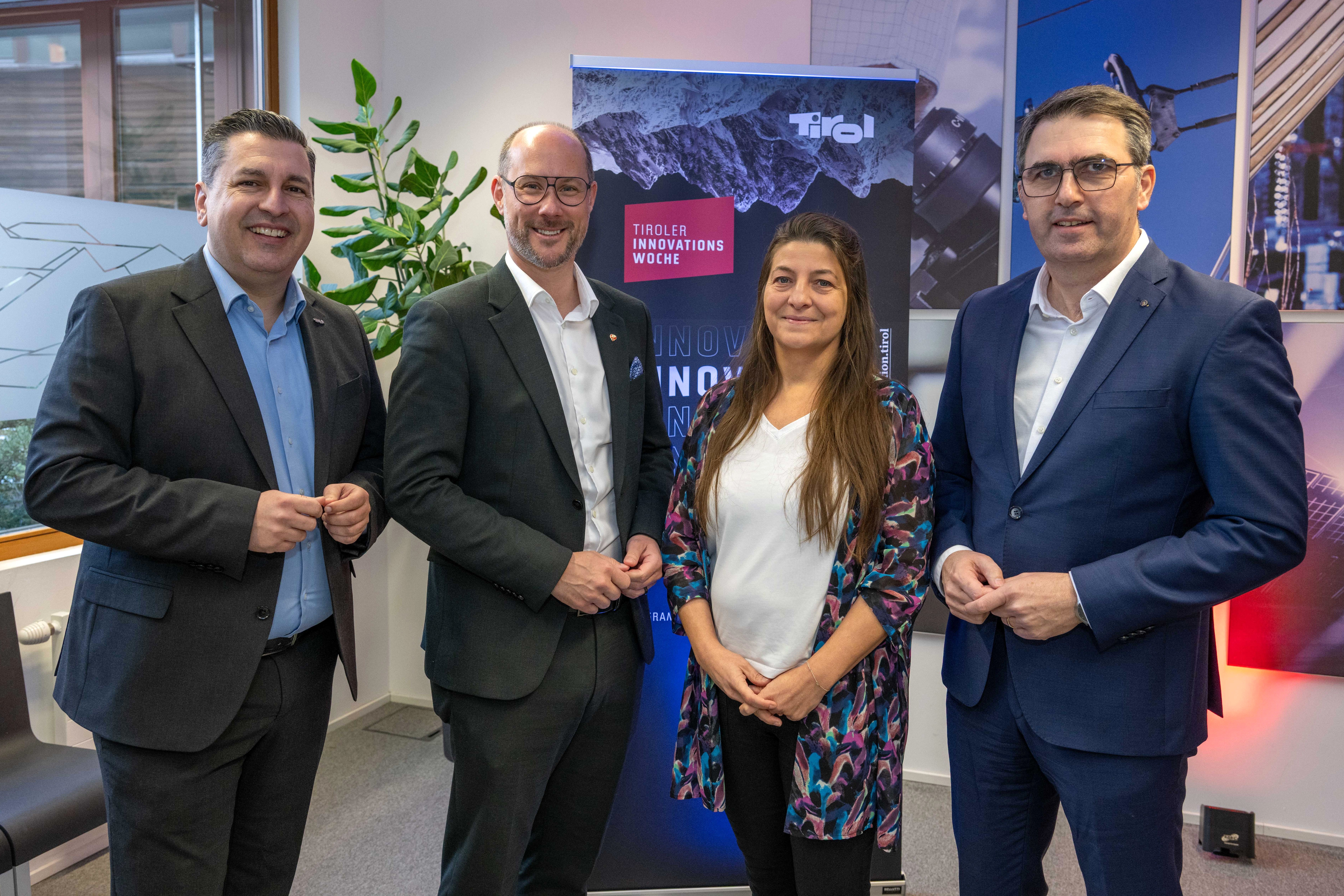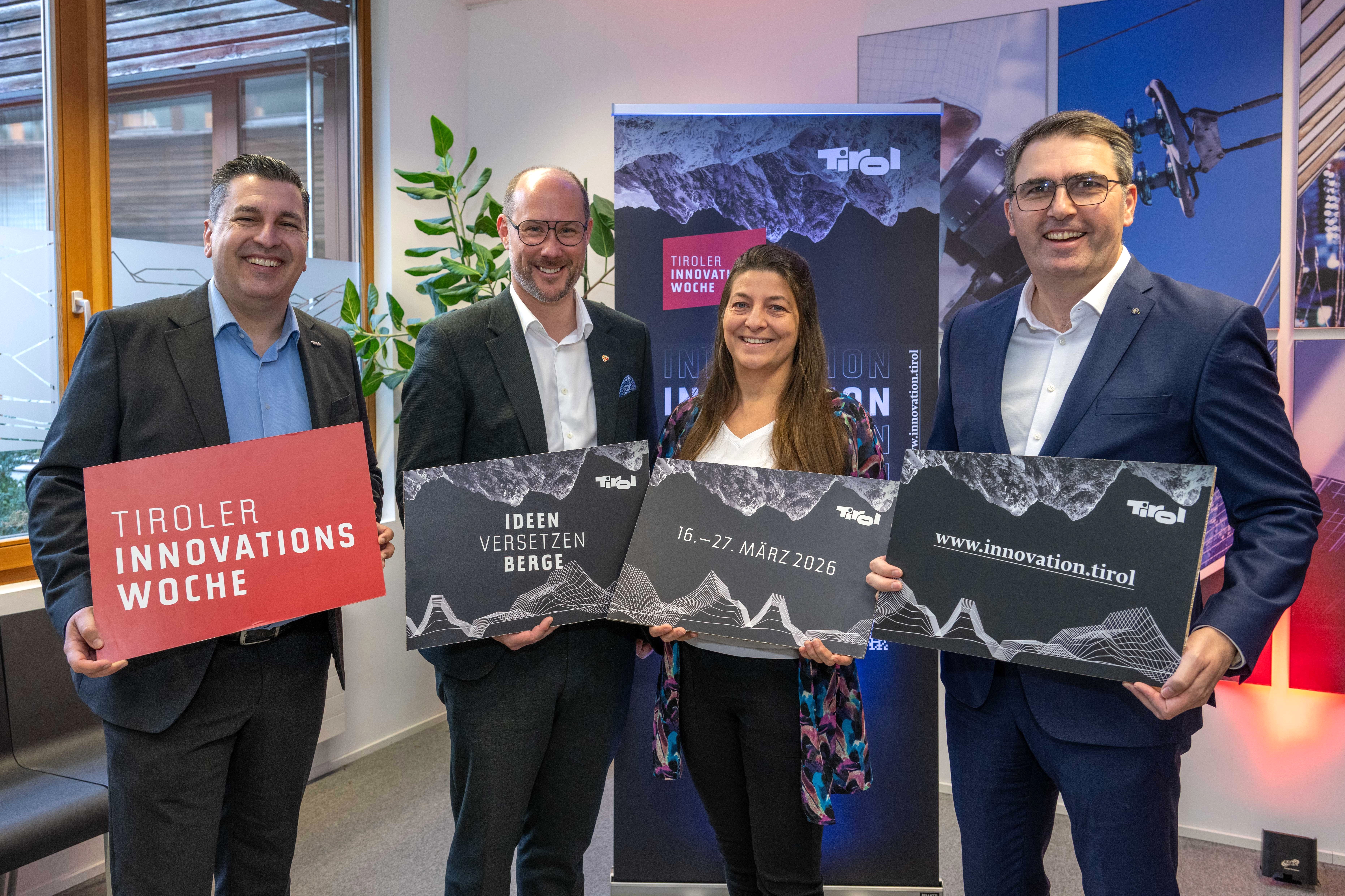 Unter Federführung der Standortagentur Tirol – gemeinsam mit Partner:innen aus Wirtschaft, Wissenschaft und Gesellschaft – zeigt die Tiroler Innovationswoche, wo Innovation in Tirol stattfindet und wie sie von regionalen Betrieben, Forschungseinrichtungen und Initiativen getragen wird. Im Bild v.l.: Marcus Hofer (Geschäftsführer Standortagentur Tirol), Mario Gerber (Landesrat für Wirtschaft, Digitalisierung und Tourismus), Birgit Partl (rauchzeichen kids & Mitveranstalterin Kids Innovation Day 2026) und Anton Rieder (Vizepräsident Wirtschaftskammer Tirol).