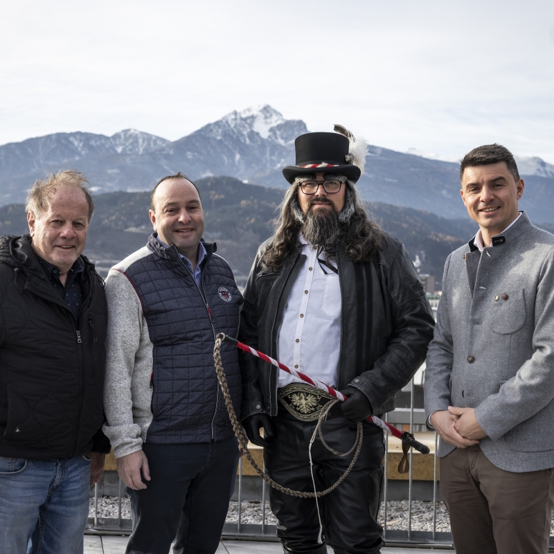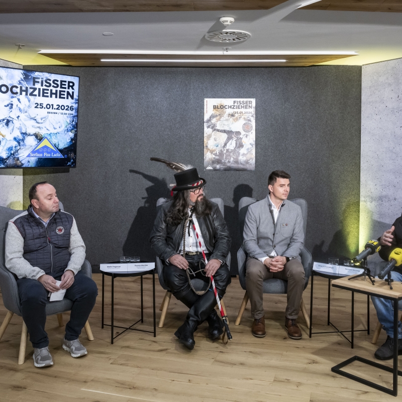v.l.: Bei der Pressekonferenz gaben Martin Pregenzer (Obmann Fisser Blochziehen), Thomas Wachter (stv. Obmann Fisser Blochziehen), Simon Schwendinger (Bürgermeister Fiss) und Hermann Kirschner (stv. Obmann TVB Serfaus-Fiss-Ladis) Einblicke in die Fisser Tradition.