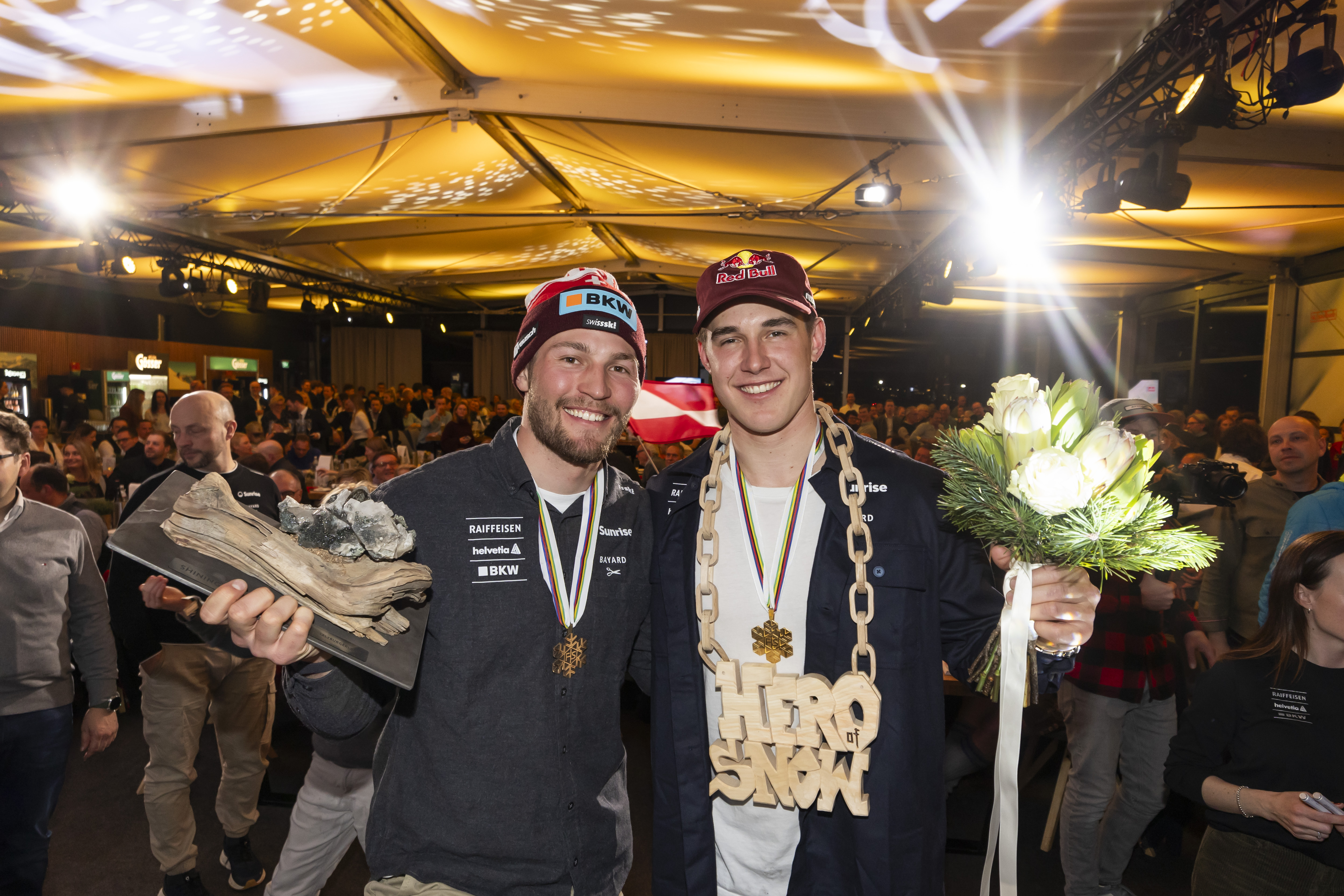 Der 23-jährige Abfahrts-Weltmeister aus der Schweiz, Franjo von Allmen, ÖSV-Ass und Silbermedaillengewinner Vincent Kriechmayr und der Drittplatzierte Alexis Monney aus der Schweiz waren die Stars des Abends und wurden im Home of Snow von Skisportfans für ihre herausragende Leistung ausgelassen gefeiert. Dabei wurde nicht nur auf die grandiosen Erfolge angestoßen, sondern auch die Teamleistung des Skicircus Saalbach Hinterglemm Leogang Fieberbrunn in Anbetracht der laufenden Ski-WM hervorgehoben.