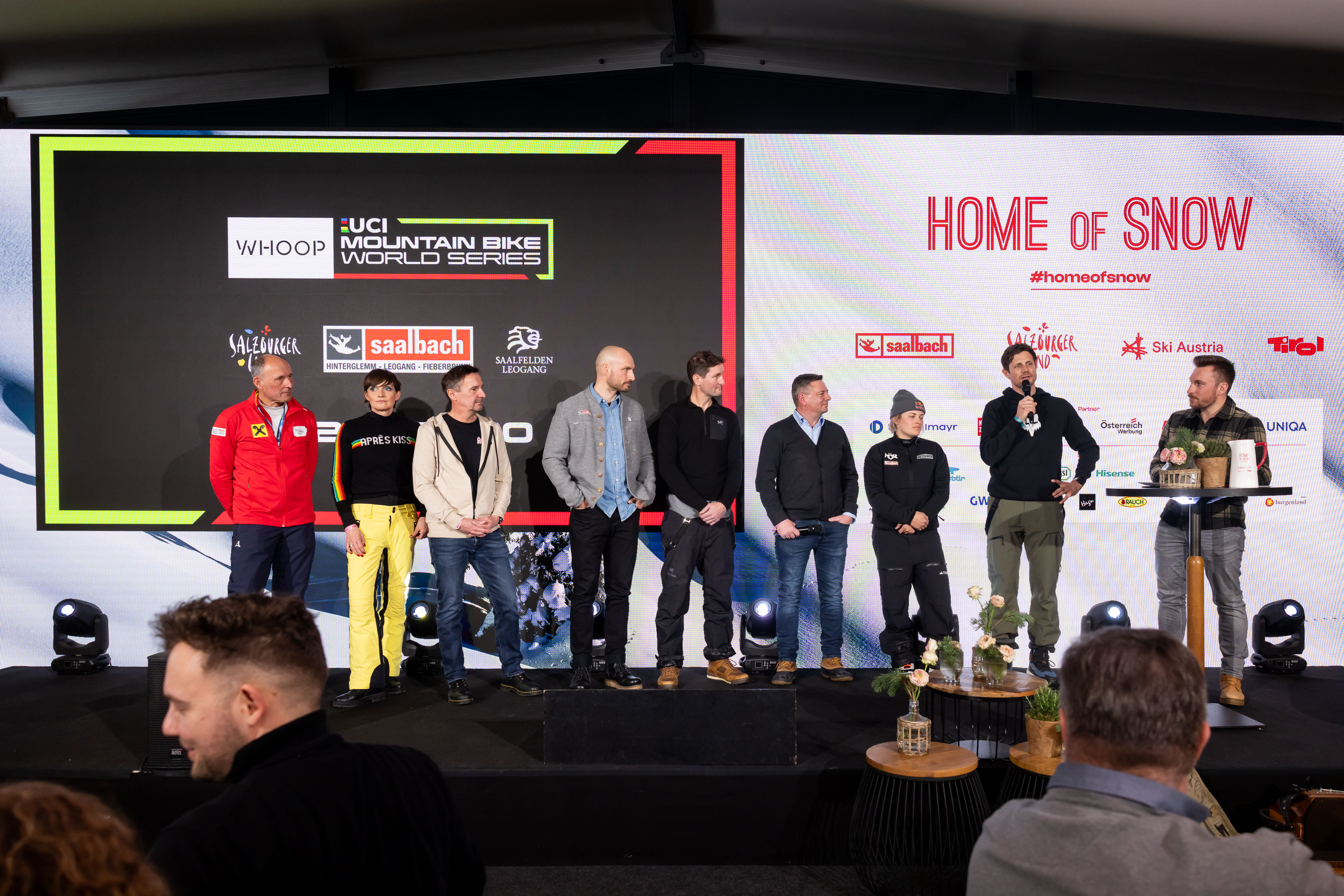 Bereits am Vormittag besiegelten im Home of Snow Bros. Discovery (WBD) Sports und die Region Saalfelden Leogang eine fünfjährige Partnerschaft. Dies ist die erste langfristige Vereinbarung dieser Art zwischen dem Veranstalter der WHOOP UCI Mountain Bike World Series und einer Region. So können von 2025 bis 2030 garantiert erstklassige Mountainbike-Events in Saalbach Hinterglemm Leogang Fieberbrunn, Österreichs größter Bike-Region, stattfinden. Leogang ist dabei ein erfahrener UCI Mountainbike Weltcup-Austragungsort. Zur Verkündung im Home of Snow fanden sich Manuel Hirner (CEO BBSH und Head of UCI Enduro Worldcup Strecke in Saalbach Hinterglemm), Marco Pointner (CEO Saalfelden Leogang Touristik und Veranstalter WHOOP UCI MTB World Series Leogang), Kornel Grundner (CEO Bikepark Leogang und Veranstalter WHOOP UCI MTB World Series Leogang), Chris Ball (VP of Cycling Events bei Warner Bros. Discovery Sports), Valentina Höll (mehrfache UCI Downhill Weltmeisterin, UCI Downhill Weltcup Gewinnerin und UCI Downhill Gesamtweltcupsiegerin), Martin Zauner (Landesrat Salzburg), Leo Bauernberger (CEO SalzburgerLand Tourismus) und Astrid Steharnig-Staudinger (CEO Österreich Werbung) ein.
