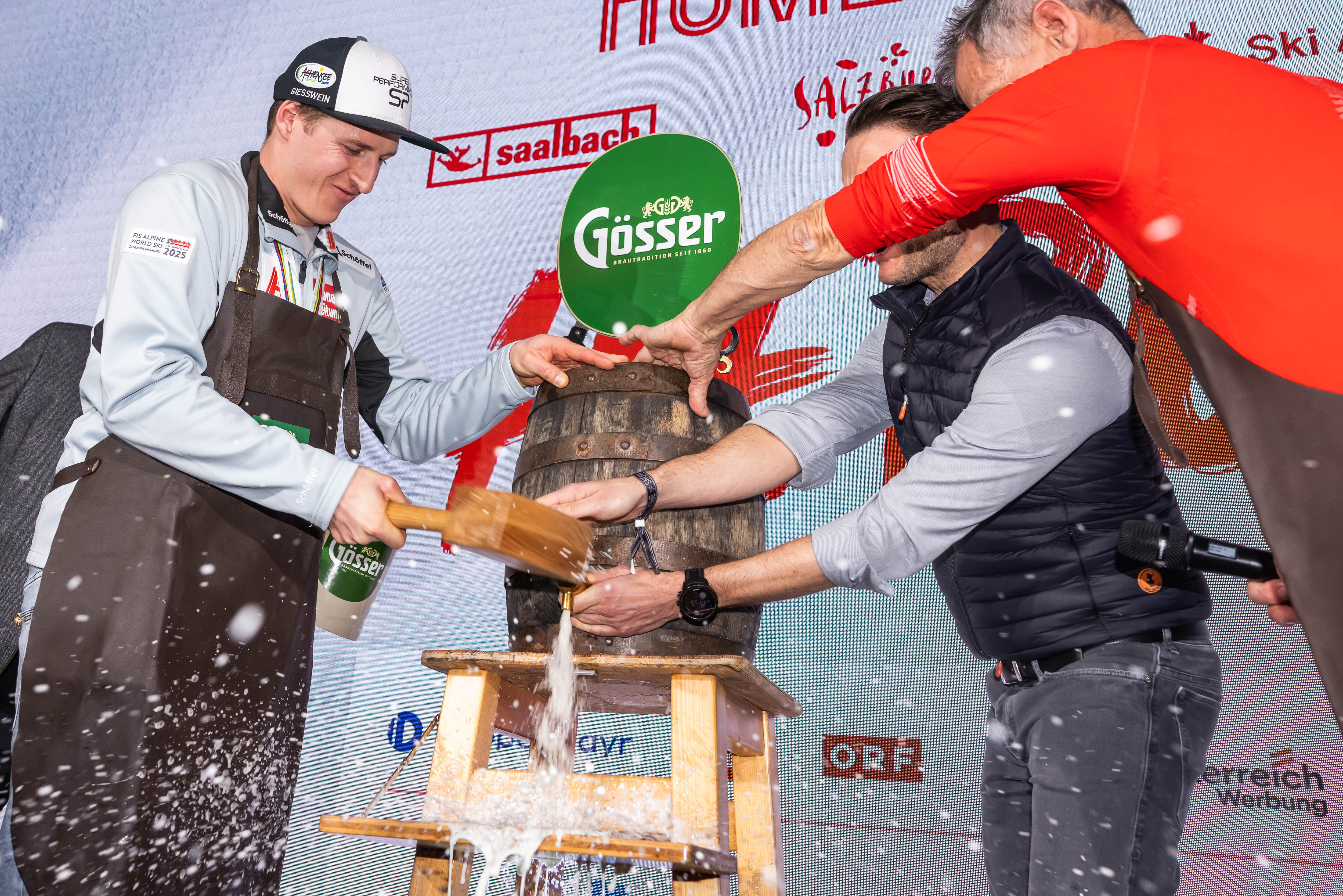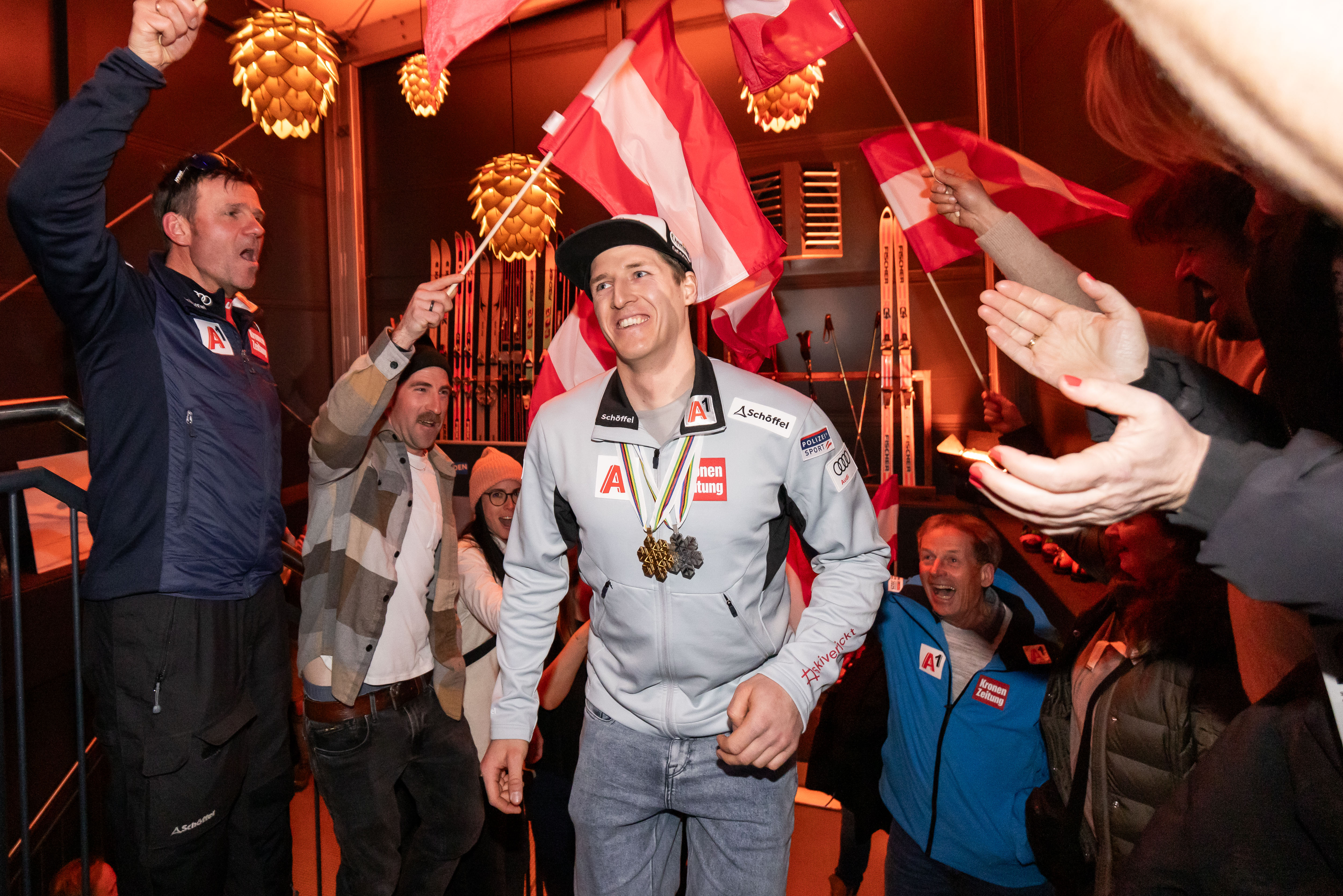 Mit einer grandiosen Fahrt im zweiten Durchgang des Riesentorlaufs bei der Ski-WM in Saalbach sicherte sich der Tiroler Raphael Haaser die Goldmedaille. Gemeinsam mit den Schweizern Thomas Tumler (Silber) und Loic Meillard (Bronze) ließen sich die Helden des WM-Riesentorlaufs beim Sölden-Gurgl-Abend im Home of Snow hochleben.