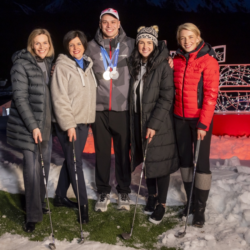 Marlies Raich (Ski-Weltmeisterin), Karin Seiler (Geschäftsführerin Tirol Werbung), Jonas Müller (Silber-Medaillengewinner Rodeln), Stephanie Venier (Ski-Weltmeisterin) und Viktoria Veider-Walser (Geschäftsführerin Kitzbühel Tourismus).