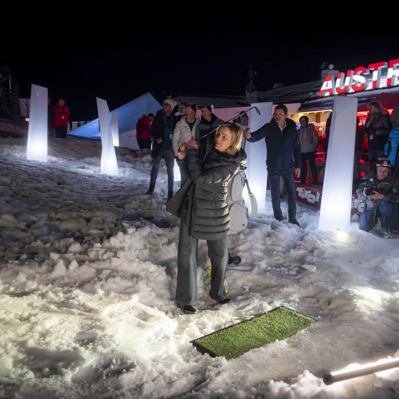 Doppelweltmeisterin Marlies Raich zeigte einen guten Schwung bei der Golf-Challenge auf der Terrasse des Austria Tirol House.