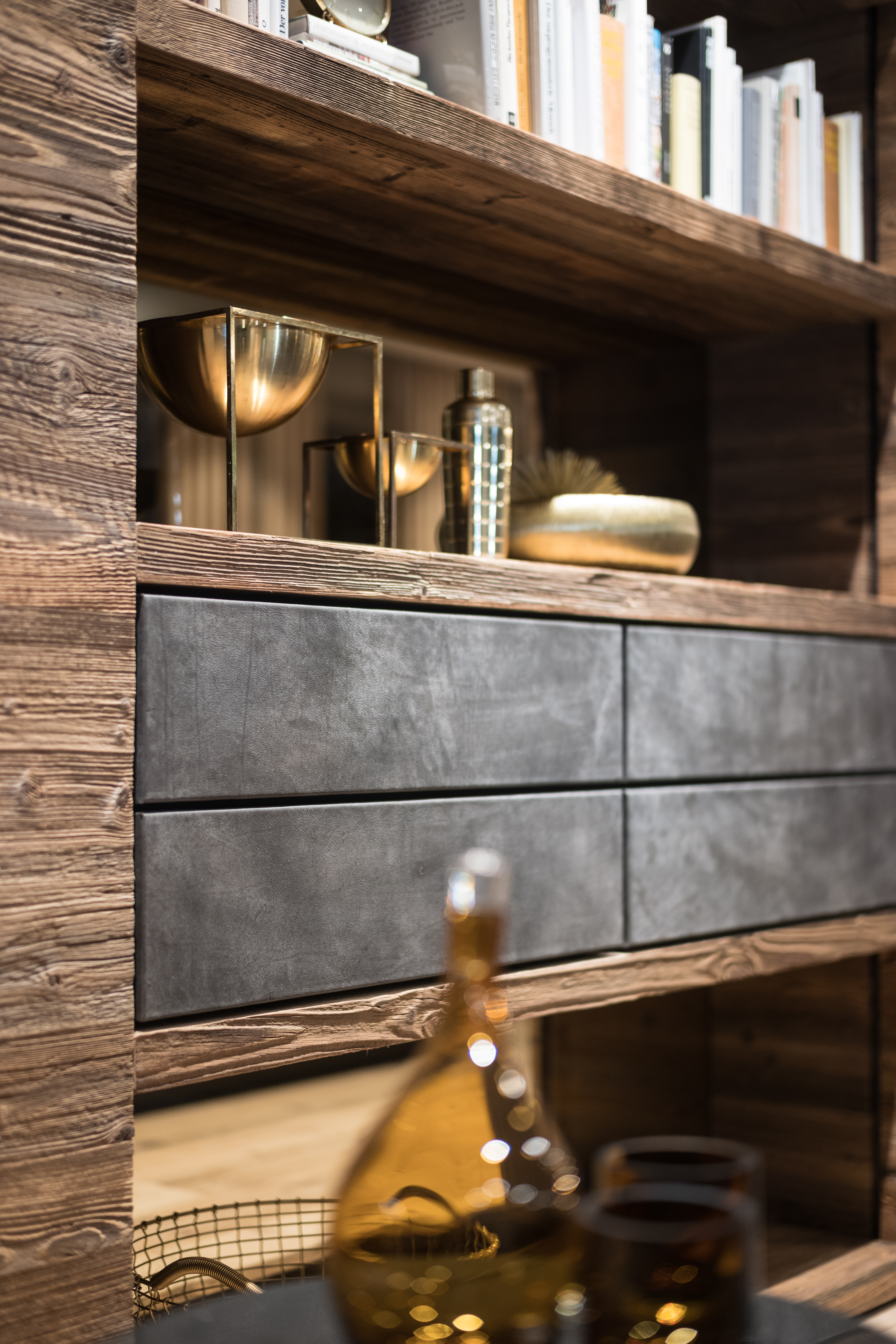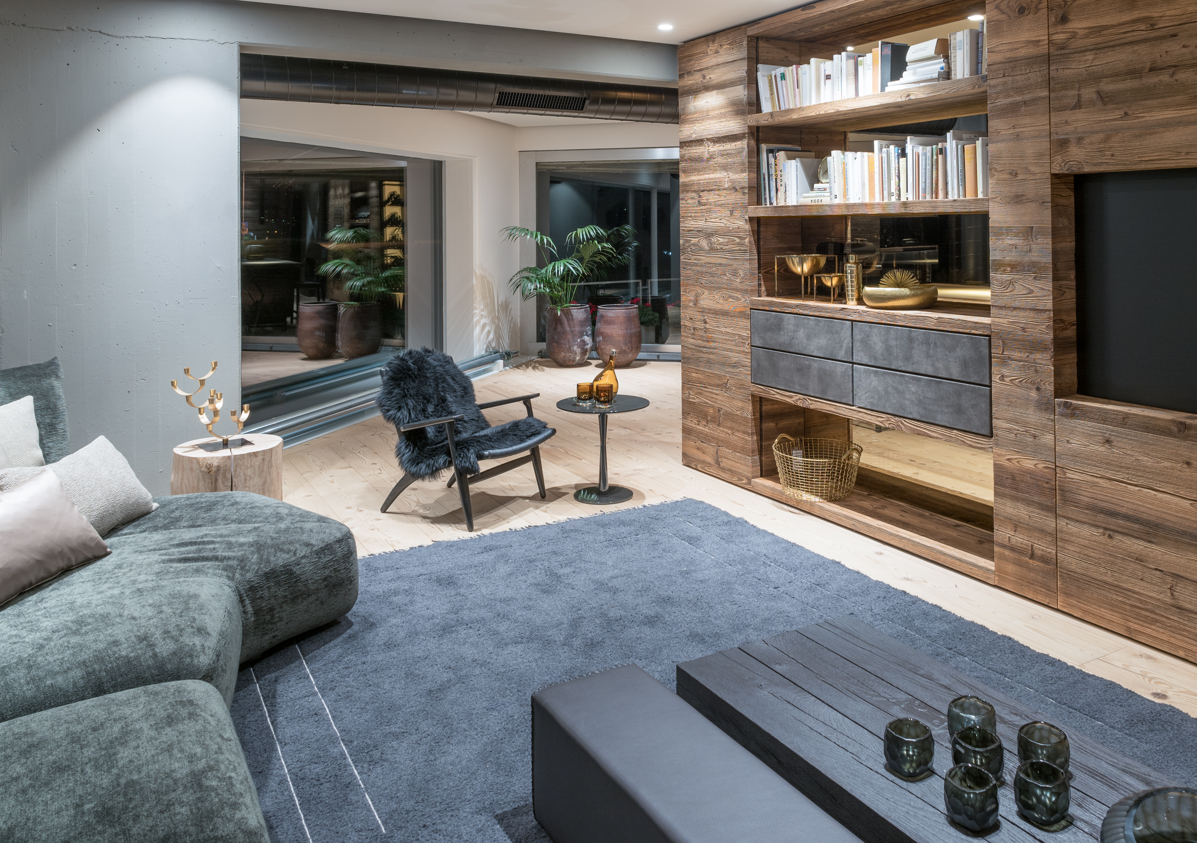 Der Grundriss des Wetscher Chalets ist von einer radikal modernen Optik bestimmt, der alpine Charakter ist vorerst nicht zu erahnen. Kuschelig und heimelig? Die Geradlinigkeit der Planung suggeriert auf den ersten Blick postmoderne „Kühle“. Erst die verwendeten Materialien von Altholz, Leder über Samt und deren haptische Qualitäten sowie aufregenden Oberflächen streichen den alpinen und gemütlichen Wohnstil hervor. Es wird mit Großzügigkeit gespielt, die überall Spuren hinterlässt: in Materialien, Farben und Formen. Was jedoch überwiegt, ist ein freier, offener Flair mit starkem Bekenntnis zum schönen, skulpturalen Einzelmöbelstück. Im Mittelpunkt steht ein luxuriöses, klares Design mit allen technischen Raffinessen.
