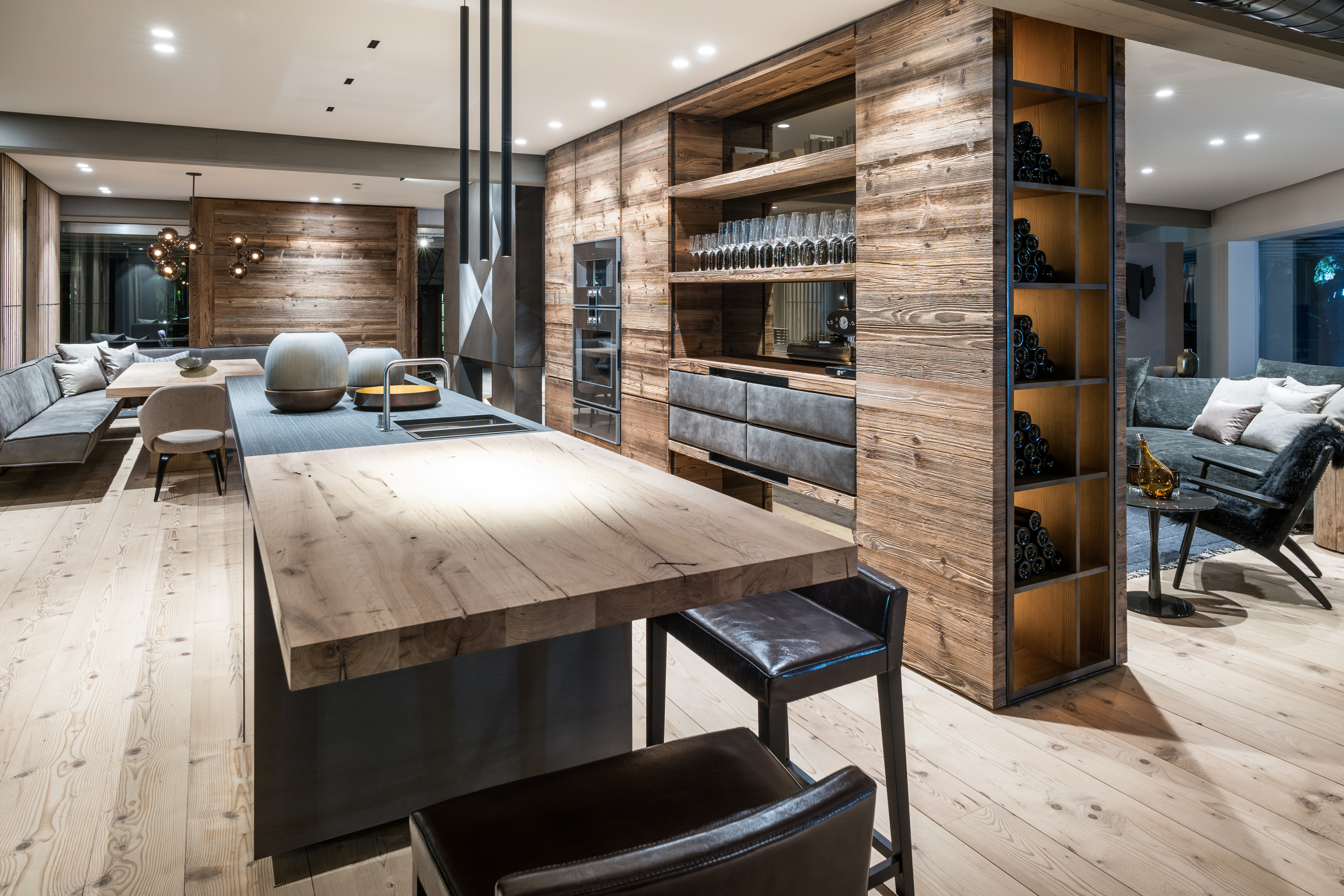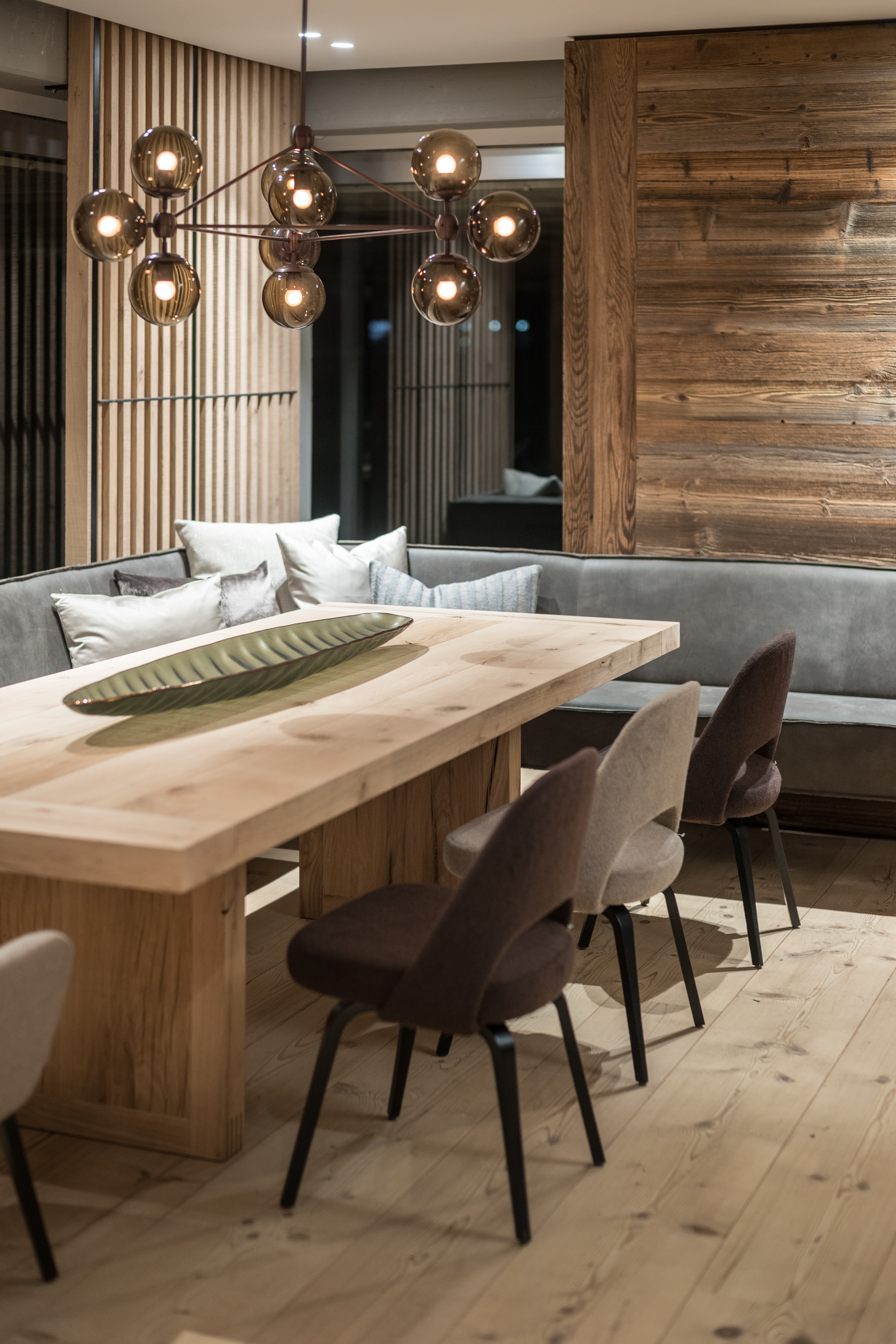 In der neuen Ausstellung haben sich internationale Spitzendesigns von Varenna, Edra oder Roll & Hill eingefunden – und geben sich mit dem kunstvollem Handwerk aus den Wetscher Werkstätten ein überraschendes Stelldichein. So entsteht eine unverwechselbare Raumatmosphäre, die das Wetscher Chalet zu dem macht, was es ist. Eine der angesagtesten Leuchten des amerikanischen Herstellers Roll & Hill hängt da beispielsweise wie selbstverständlich über einem Tisch aus den Wetscher Werkstätten zu Sesseln von Walter Knoll und Raumteilern, die jenen der modernen amerikanischen Villen des letzten Jahrhunderts um nichts nachstehen. Ein Riemenboden aus Nadelholz, das neueste Sofa der Marke Edra und eine Designerküche von Varenna begeistern in Kombination mit einer ganz neuen Interpretation einer Eckbank aus der hauseigenen Tischlerei.