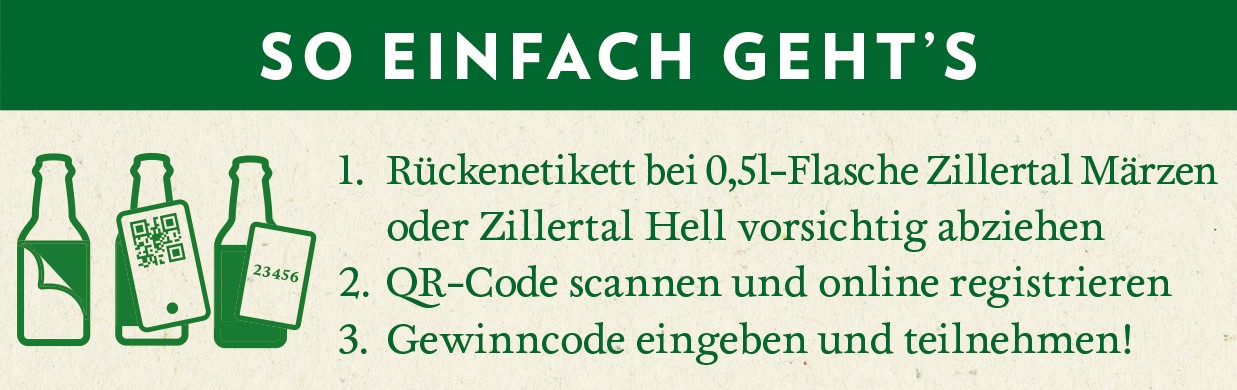 Das Zillertal Bier Gewinnspiel läuft noch bis 17. September 2023 und die Teilnahme ist unkompliziert möglich: Rückenetikett ablösen, QR-Code scannen, online registrieren und Gewinncode eingeben – so einfach nimmt man an der Verlosung teil. Jede 0,5-Liter-Flasche der Sorten „Zillertal Märzen“ oder „Zeller Hell“ erhöht dabei die Erfolgsaussichten auf einen der attraktiven Preise.