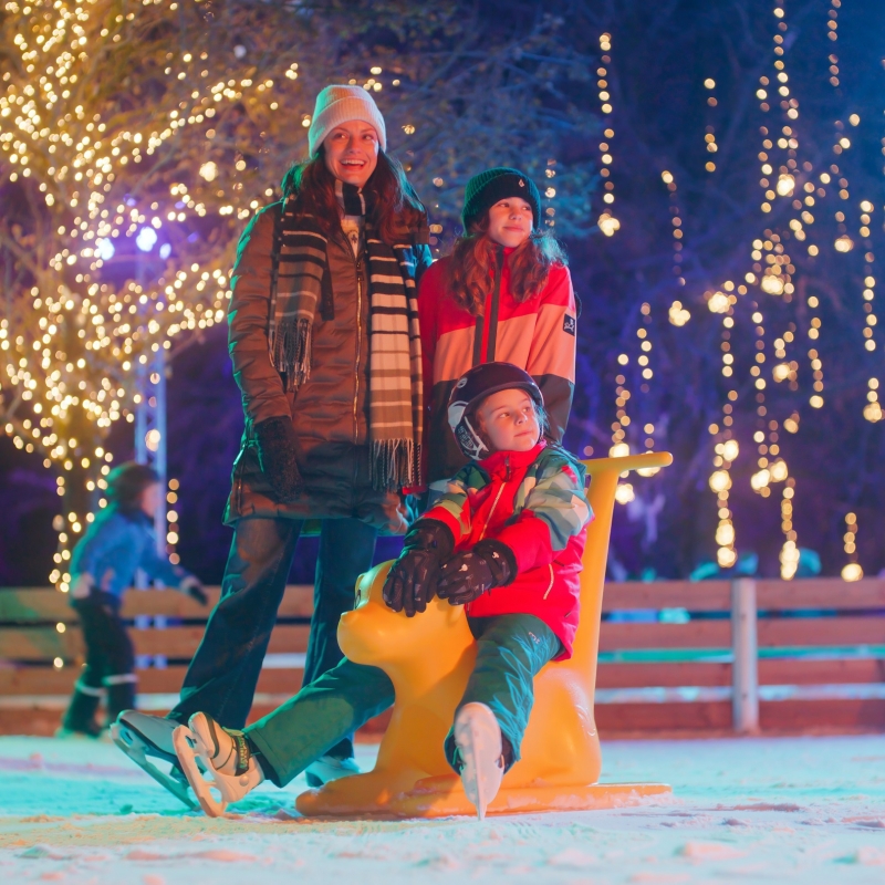 Schlittschuhlaufen im stimmungsvoll beleuchteten Stadtpark Reutte – ein Wintererlebnis für die ganze Familie.