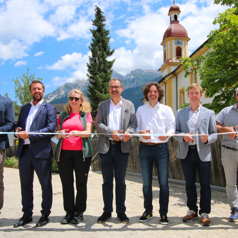 Großer Bahnhof in Neustift i. Stubaital anlässlich der Eröffnung der neuen Fußgängerzone am Franz-Senn-Platz (v.l.): TVB-Obmann Adrian Siller, 1. LHStv. Georg Dornauer, GV Andrea Pfurtscheller-Fuchs, Bgm. Andreas Gleirscher, Architekt Günther Filz, Initiator Christian Pfurtscheller und Ortsausschussobmann Florian Kindl.