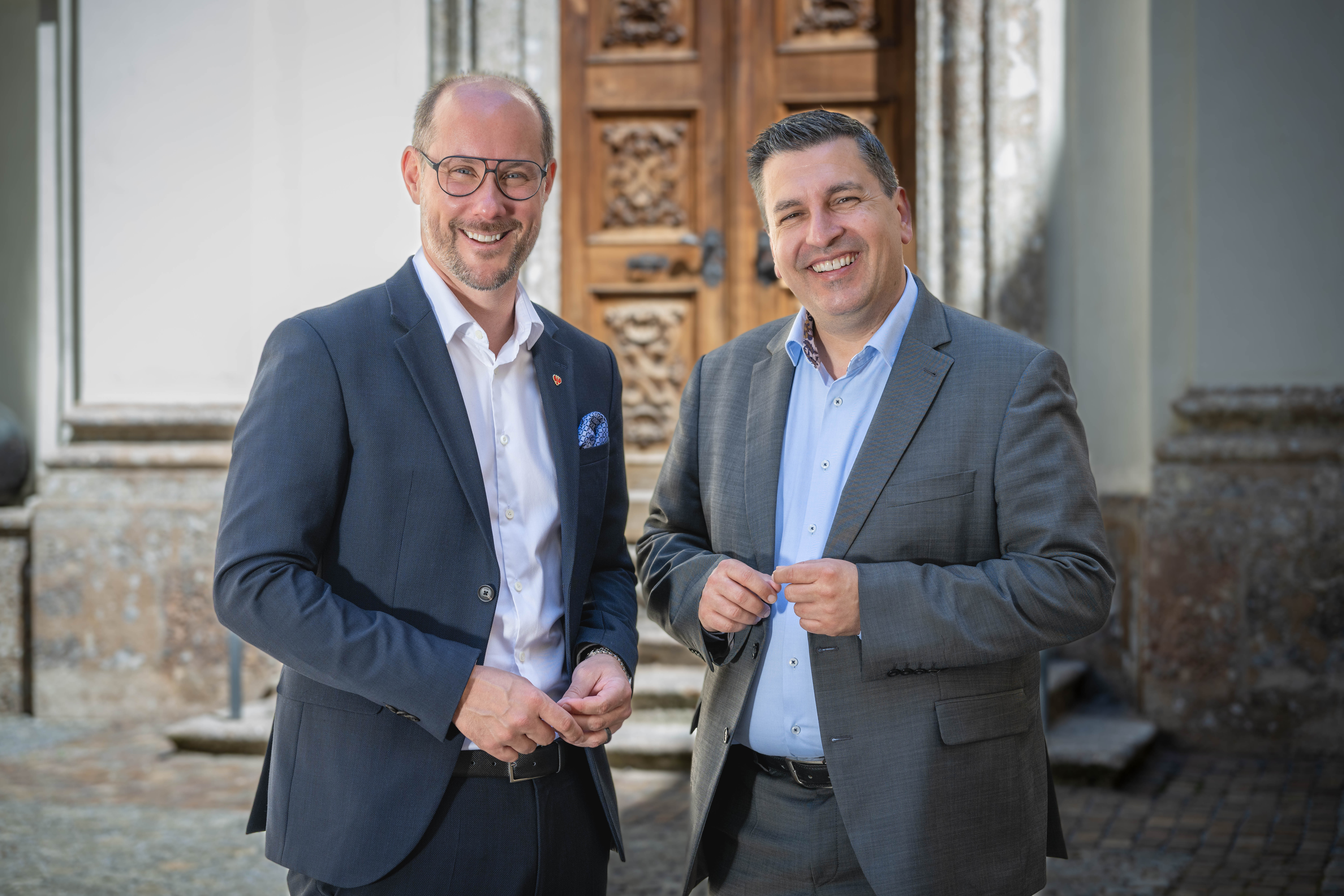 Innovation gemeinsam fördern: Landesrat Mario Gerber und Geschäftsführer der Standortagentur Tirol Marcus Hofer (r.) setzen mit dem Förderprogramm EFRE K-Regio enterprise auf kooperative Projekte von Tiroler Unternehmen. Insgesamt stehen 7,2 Millionen Euro zur Verfügung, um Innovation, Wachstum und regionale Wertschöpfung am Wirtschaftsstandort Tirol voranzutreiben.