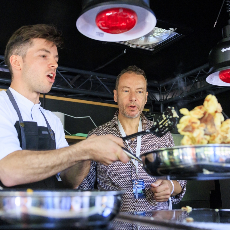 Tiroler Spitzenkoch Michael Ploner zeigt einem französischer Journalist wie er seinen Kaiserschmarrn zubereitet.