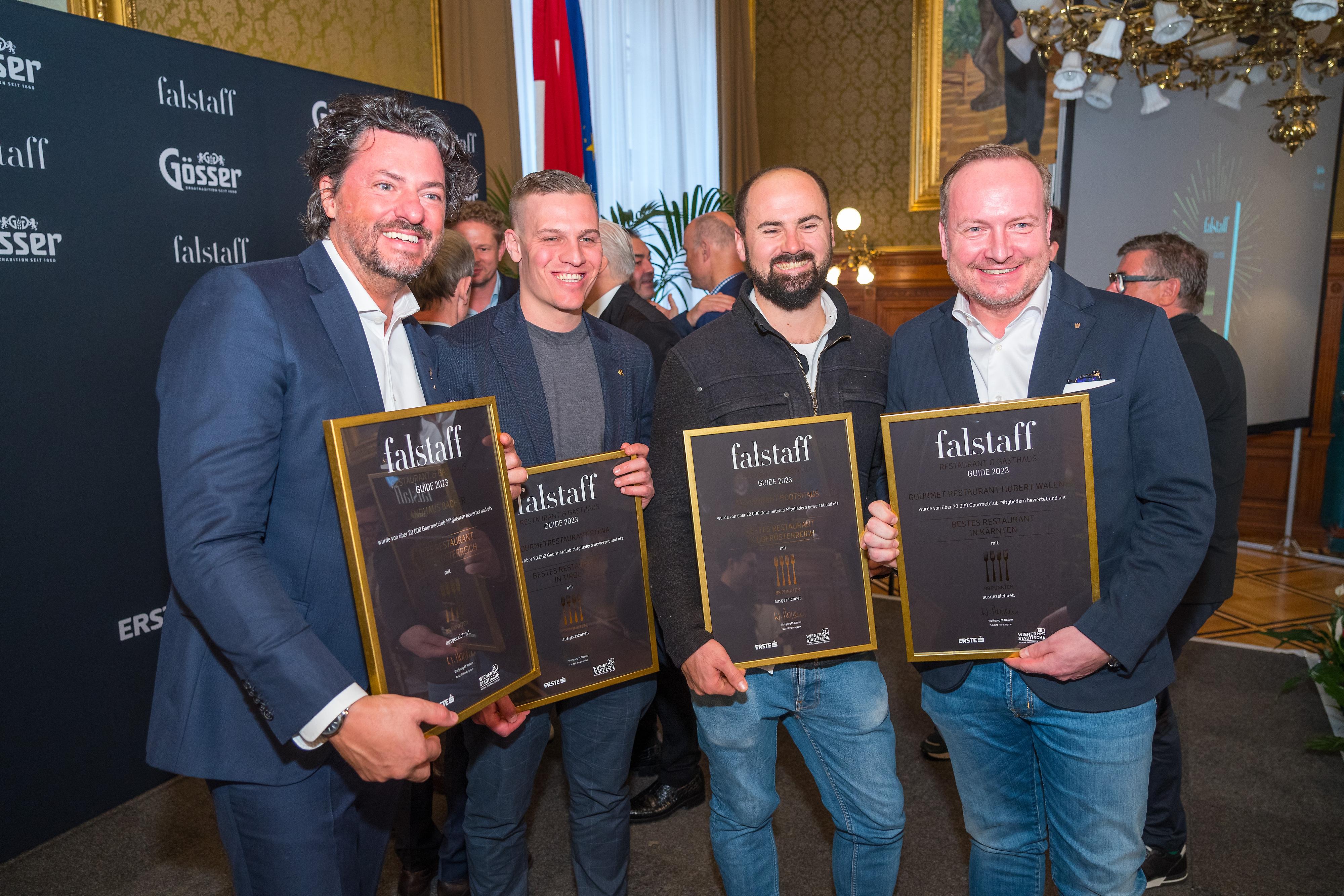 Bundesland-Sieger unter sich (v.l.): Thomas Dorfer (Landhaus Bacher, NÖ), Benjamin Parth (Gourmetrestaurant Stüva, Tirol), Lukas Nagl (Bootshaus, OÖ) und Hubert Wallner (Gourmet Restaurant Hubert Wallner, Kärnten).