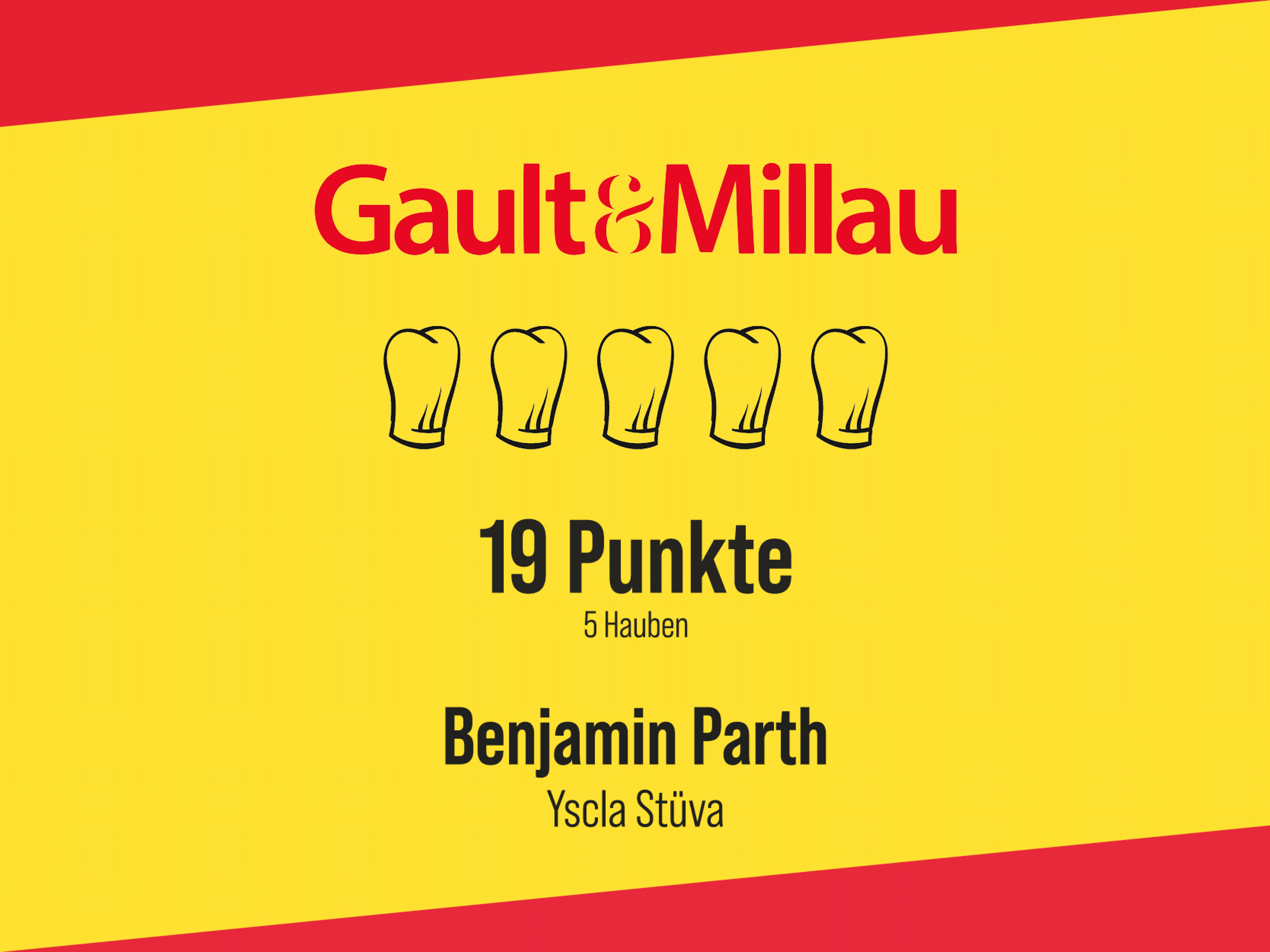 Der renommierte österreichische Gourmet-Guide Gault&Millau hat Benjamin Parth für sein Gourmetrestaurant Stüva im 4****S Boutique Hotel YSCLA in Ischgl bei der Vorjahresverleihung zum ersten Mal die Höchstwertung von 5 Hauben und 19 Punkten verliehen. Bei der kürzlichen Präsentation des Gault&Millau Restaurantguides 2024 wurde die Bestplatzierung für Parth von den Herausgebern des Guides, Martina und Karl Hohenlohe, erneut bestätigt. Neben Benjamin Parth wurden nur sieben weitere Spitzenköche in ganz Österreich mit 19 Punkten und allen fünf von fünf maximal zu erreichenden Hauben ausgezeichnet.