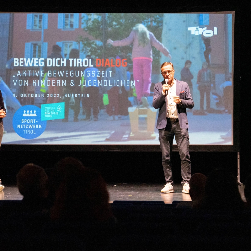 Thomas Rohregger (li.) und Josef Margreiter bei der Eröffnung des „Beweg Dich Tirol Dialogs“ zum Thema „Aktive Bewegungszeit von Kindern und Jugendlichen“ im Kultur Quartier Kufstein.