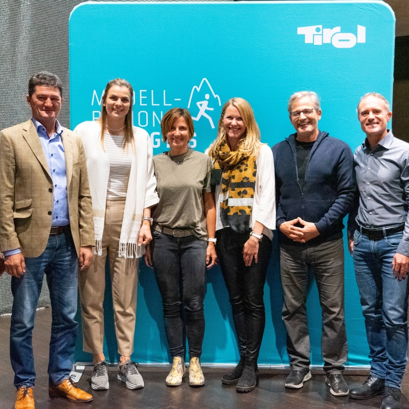 Im Zuge des Tourstopps in Kufstein fand der erste „Beweg Dich Tirol Dialog“ zum Thema „Aktive Bewegungszeit von Kindern und Jugendlichen“ statt. (v.l.): Thomas Rohregger (ehemaliger Rennradprofi), Reinhard Eberl (ehemaliger österreichischer Skispringer und Vorstand der Abteilung Sport des Landes Tirol), Anna-Maria Kogler (Sports Research Lab Tirol), Andrea Graus (ehemalige Rennradprofi), Eva Dollinger (ehemalige österreichische Triathletin und Olympia Teilnehmerin), Werner Kirschner (Institut für Sportwissenschaften der Universität Innsbruck), Christian Wührer (Projektleiter, Tirol Werbung) und Josef Margreiter (GF Lebensraum Tirol Holding).