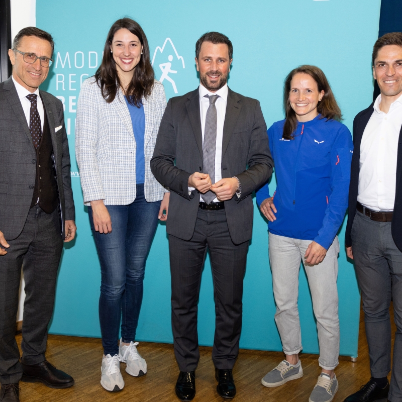 (v.l.): Josef Margreiter (GF Lebensraum Tirol Holding), Sophia Kircher (Erste Vizepräsidentin des Tiroler Landtags), Georg Dornauer (1. Landeshauptmann-Stellvertreter und Sportlandesrat), Anna Stöhr (ehemalige österreichische Sportkletterin und AHS-Lehrerin) und Thomas Rohregger (ehemaliger Rennradprofi, Sportnetzwerk Tirol) waren beim 3. „Beweg Dich Tirol Dialog“ in Telfs mit dabei.