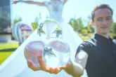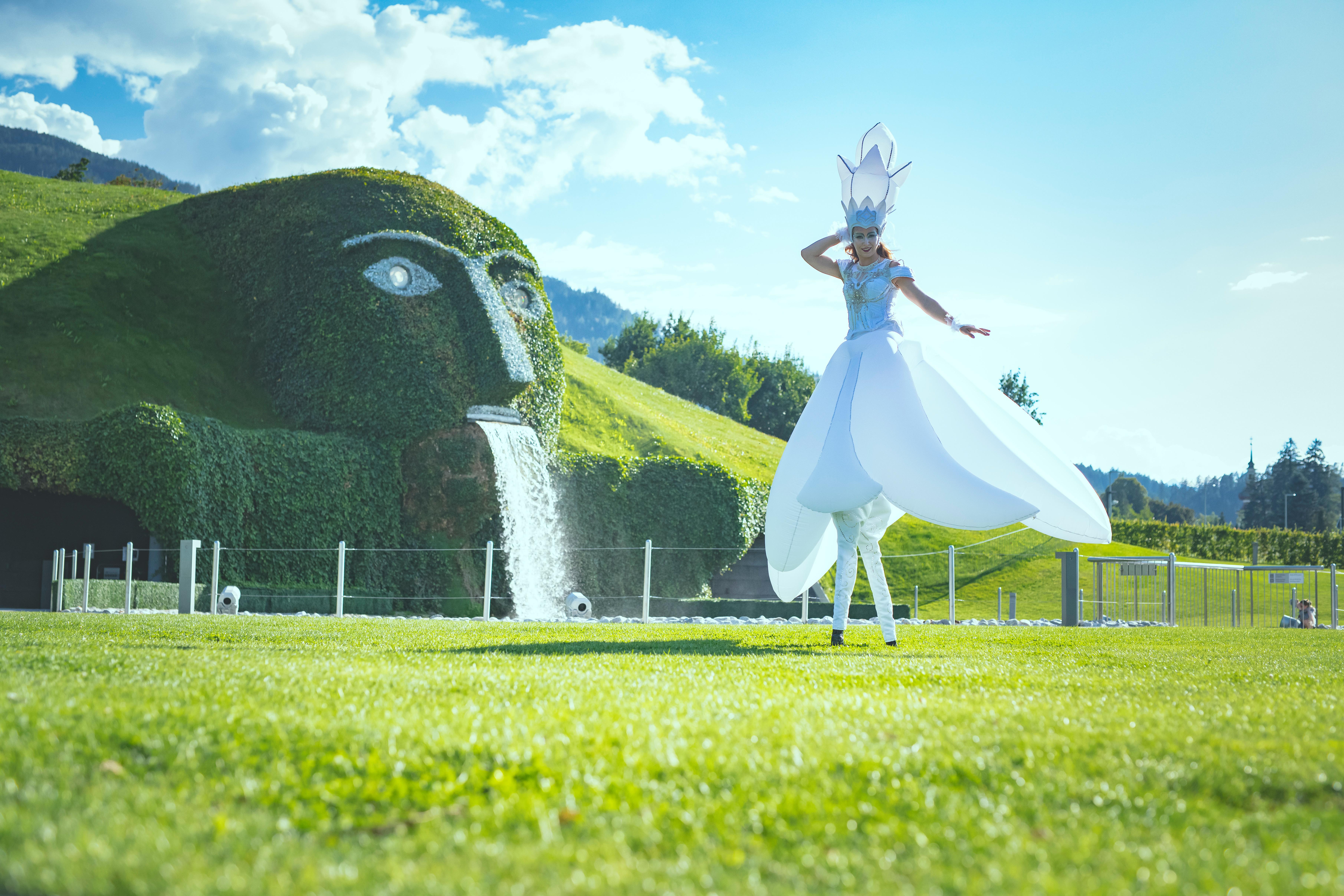 Eine Riesin im Garten des Riesen? Die Besucher der Swarovski Kristallwelten werden ihren Augen kaum trauen, wirkt dieses erstaunlich große und doch zarte Wesen doch wie aus einer anderen Dimension. Miriam van der Neut verzaubert nicht nur durch ihre Erscheinung, sondern verbreitet kristalline Magie mit Kristallen von Swarovski, die sie an die Besucher verteilt.