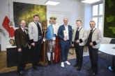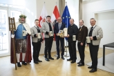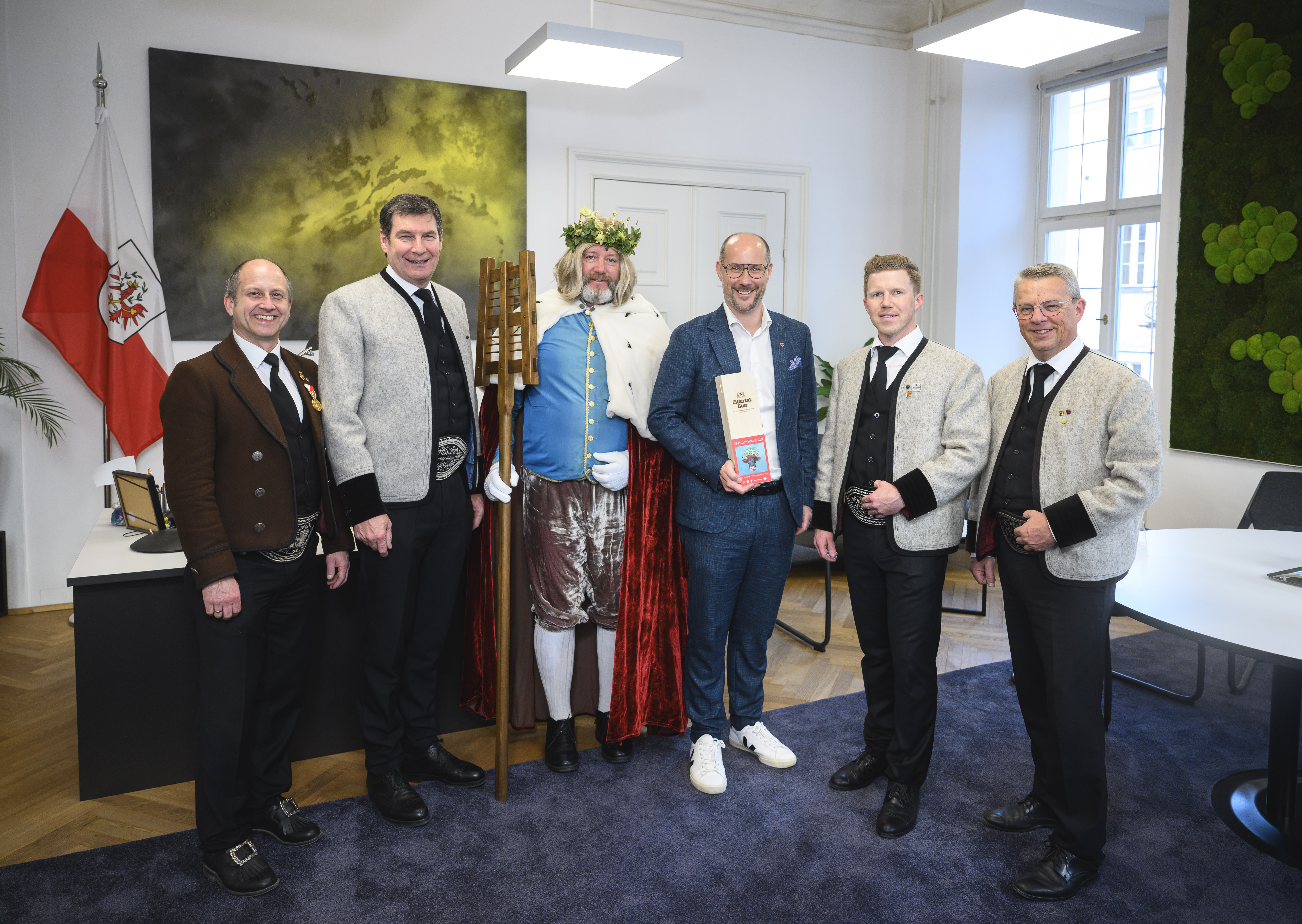 Eine Abordnung, bestehend aus Bierkönig Gambrinus, Martin Lechner (Geschäftsführer Zillertal Bier), Christian Daum (Geschäftsführer TVB Zell-Gerlos, Zillertal Arena) sowie Robert Pramstrahler (Bürgermeister Gemeinde Zell am Ziller) und Alexander Schatz (Obmann Tiroler Landestrachtenverband), überreichte Landeshauptmann Anton Mattle sowie Vertreter:innen der Tiroler Landesregierung persönlich die Einladung zum diesjährigen Gauder Fest.