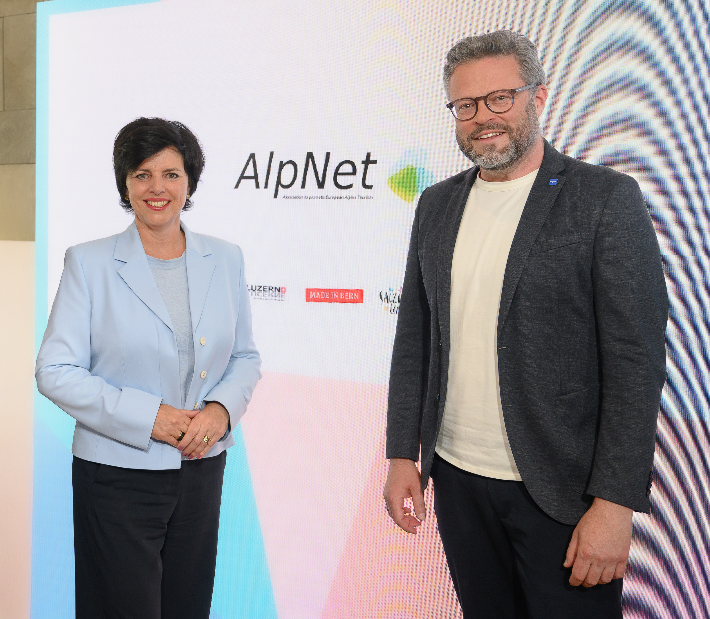 Karin Seiler, Präsidentin von AlpNet und Geschäftsführerin der Tirol Werbung, und Stefan Egenter, Geschäftsführer von Allgäu Tourismus, bei der gemeinsamen Präsentation des Alpenmanifests – dem neuen Bekenntnis von neun führenden Tourismusregionen zu mehr Nachhaltigkeit und Verantwortung im Alpentourismus.
