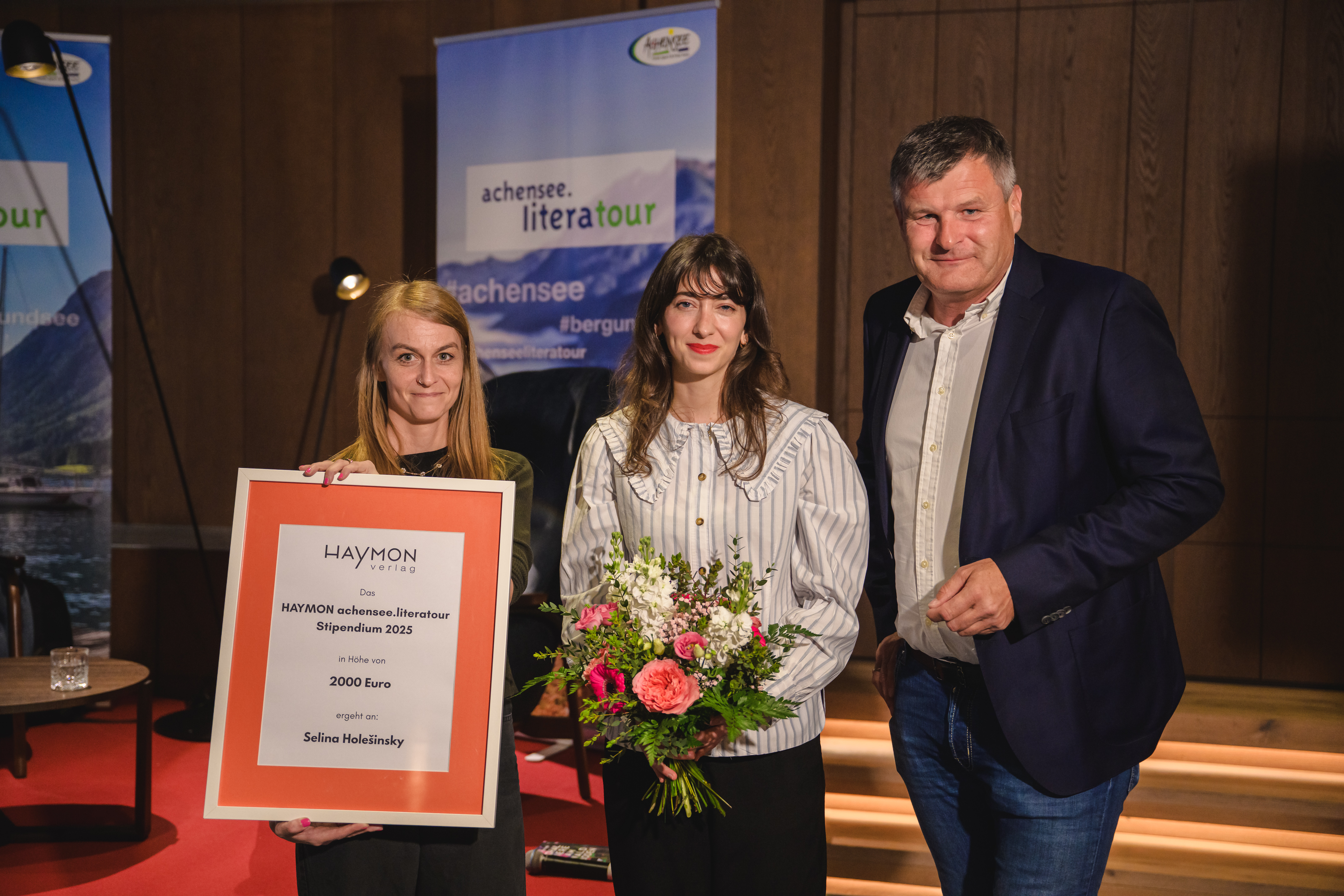 Bereits Tradition hat die Vergabe eines Stipendiums im Rahmen des viertägigen Festivals. Das heurige Haymon achensee.literatour Aufenthaltsstipendium ging an die junge Autorin Selina Holešinsky, die mit ihrem Roman „Schaltiere am Waldboden“ das Publikum sowohl im Rahmen der Eröffnung als auch bei der Lesung im Seehotel Einwaller beeindruckte.