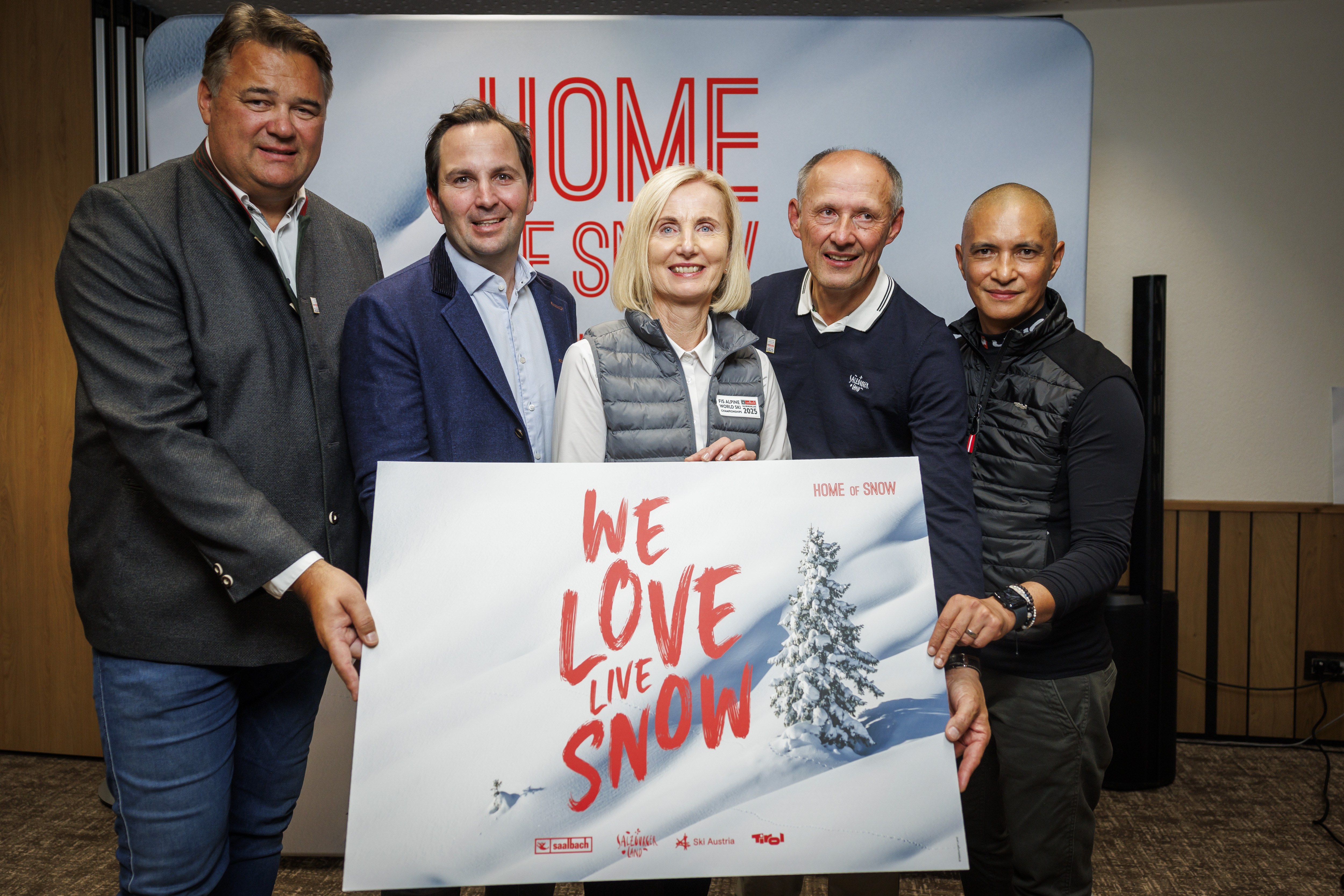 (v.l.): Wolfgang Breitfuß (Geschäftsführer des Tourismusverbandes Saalbach Hinterglemm), Christian Scherer (Vorsitzender der Geschäftsführung & Generalsekretär des ÖSV), Christiane Gasser (Projektleiterin Home of Snow), Roswitha Stadlober (Präsidentin des ÖSV), Patricio Hetfleisch (CMO & Prokurist Tirol Werbung, Leitung Marketing und Kommunikation der Marke Tirol) und Leo Bauernberger (Geschäftsführer von SalzburgerLand Tourismus) präsentierten gemeinsam das Home of Snow.