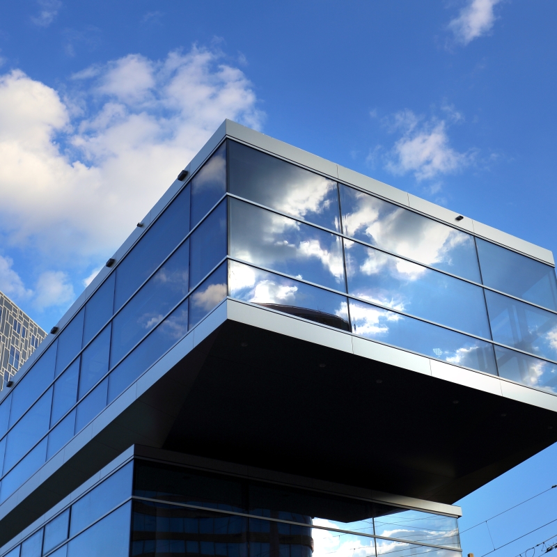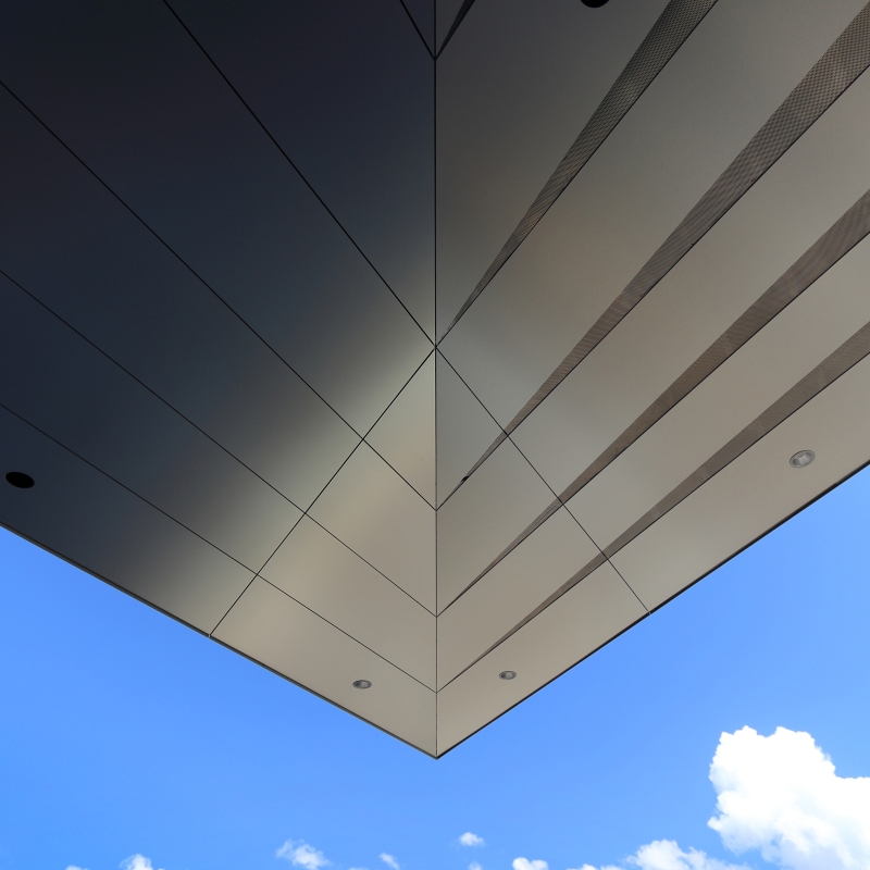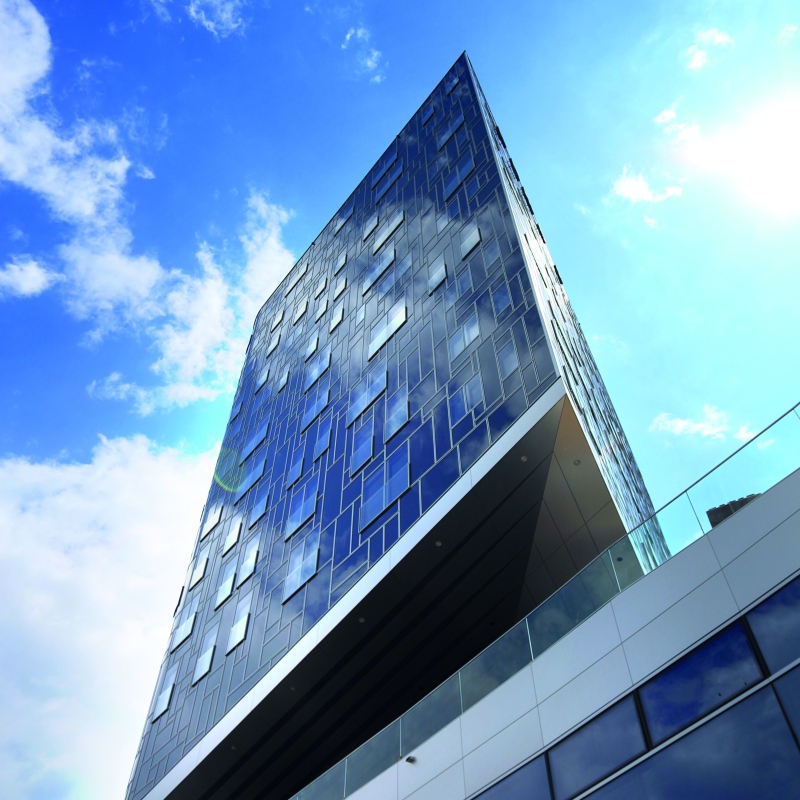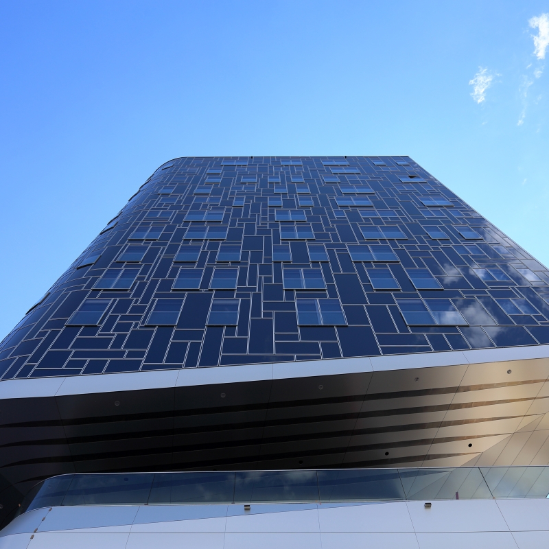 Die Fassade des Wohnturms setzt sich aus rund 8.000 in Aluminium gefassten, leicht gewölbten gläsernen Elementen zu einem geometrischen Puzzle zusammen und spiegelt seine Umgebung aus allen Winkeln wider.