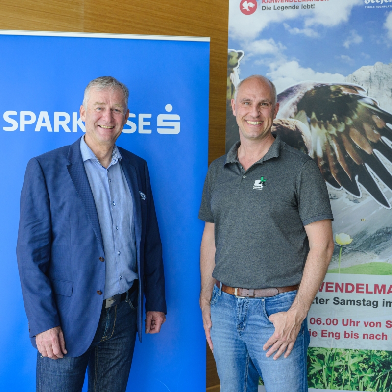 Hermann Nagiller (Sparkassen Landesverband Tirol und Vorarlberg, li.) hat den Karwendelmarsch bereits bewältigt und Anton Heufelder (Naturpark Karwendel) kennt die Region wie seine Westentasche.