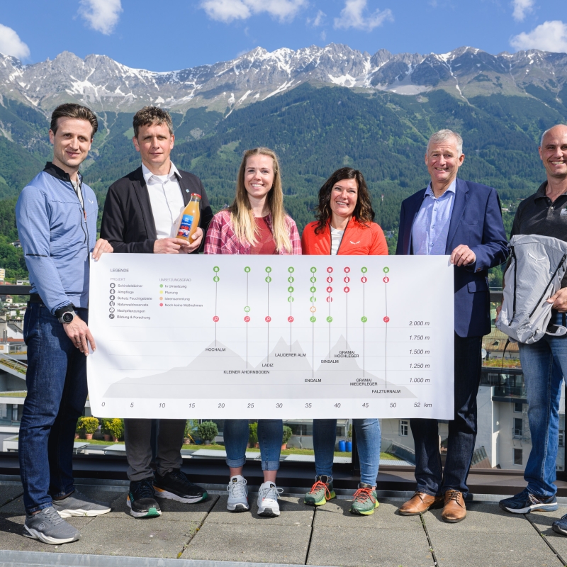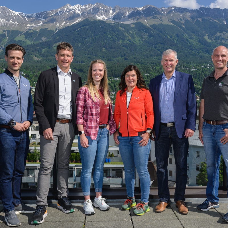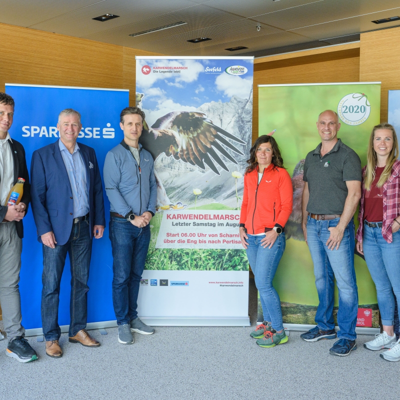 Der Karwendelmarsch 2023 soll „Spuren der Nachhaltigkeit“ hinterlassen, die Verantwortlichen und ihre Partner stehen dafür ein (v.l.): Elias Walser (Geschäftsführer Tourismusverband Region Seefeld), Björn Rasmus (Geschäftsführer BIO vom BERG), Natalie Koller (Salewa Marketing & Event Specialist), Maria Wirtenberger (Stv. Geschäftsführerin Achensee Tourismus), Hermann Nagiller (Geschäftsführer Sparkassen-Landesverband für Tirol und Vorarlberg) sowie Anton Heufelder (Geschäftsführer Naturpark Karwendel).