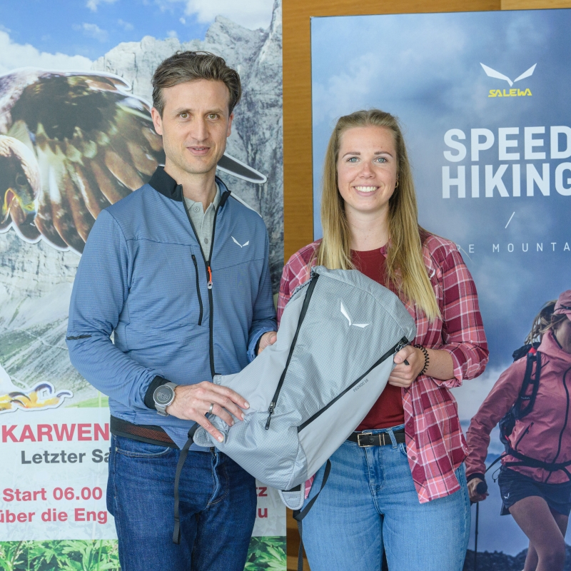Vom Start in Scharnitz weg bestens ausgestattet: Elias Walser (Seefeld – Tirols Hochplateau) bedankt sich bei Natalie Koller (Salewa) für die jahrelange Unterstützung.