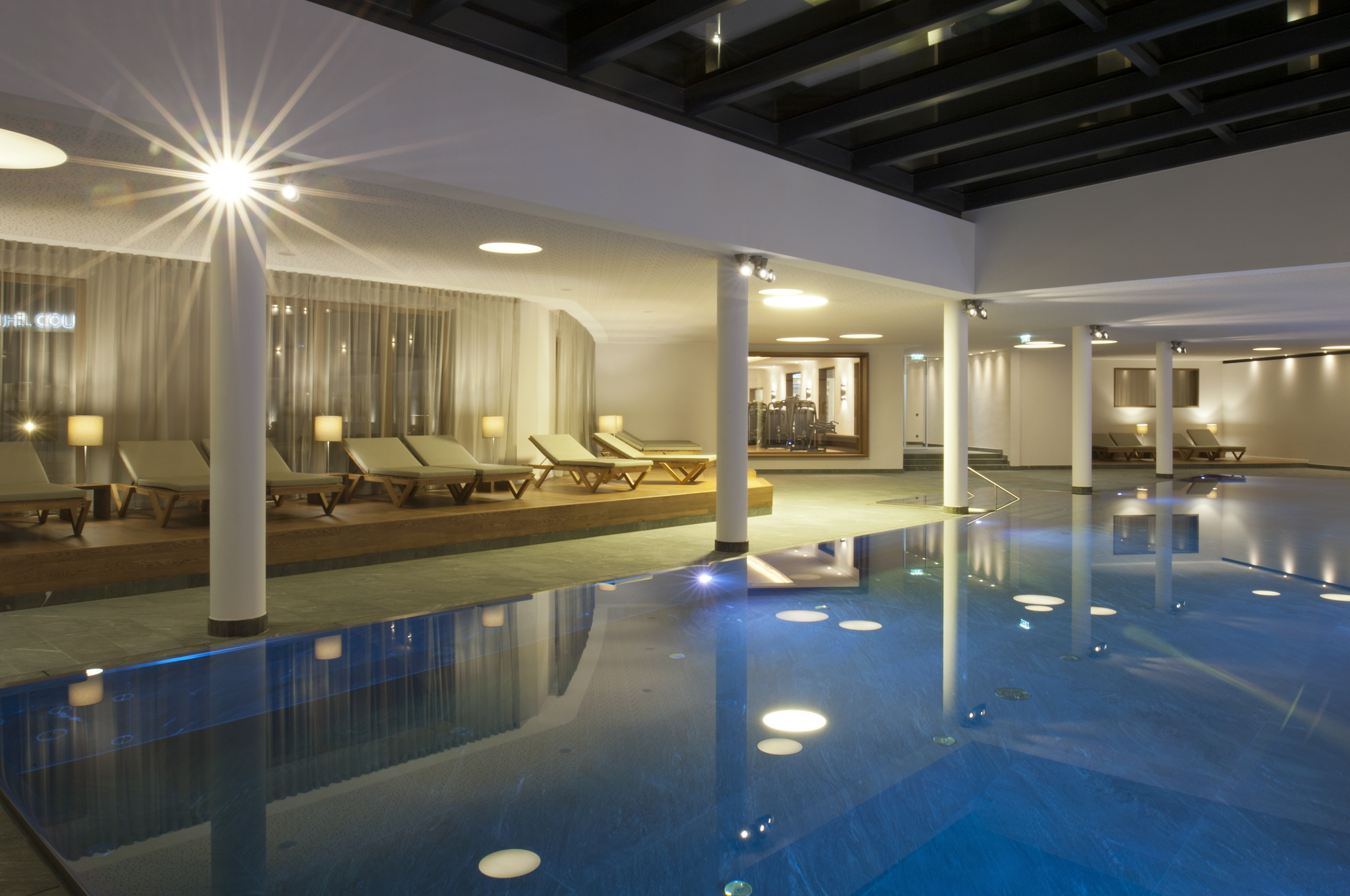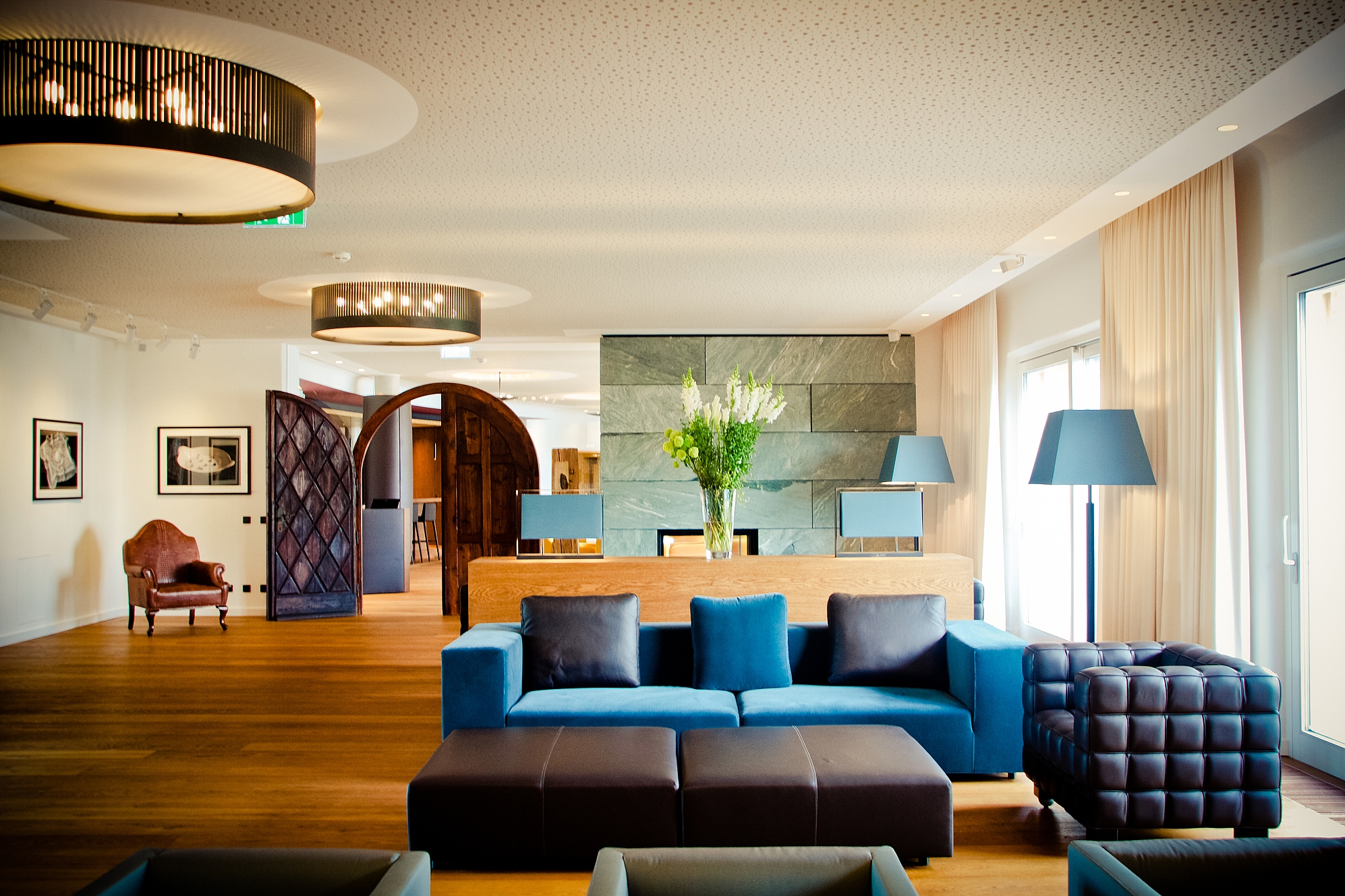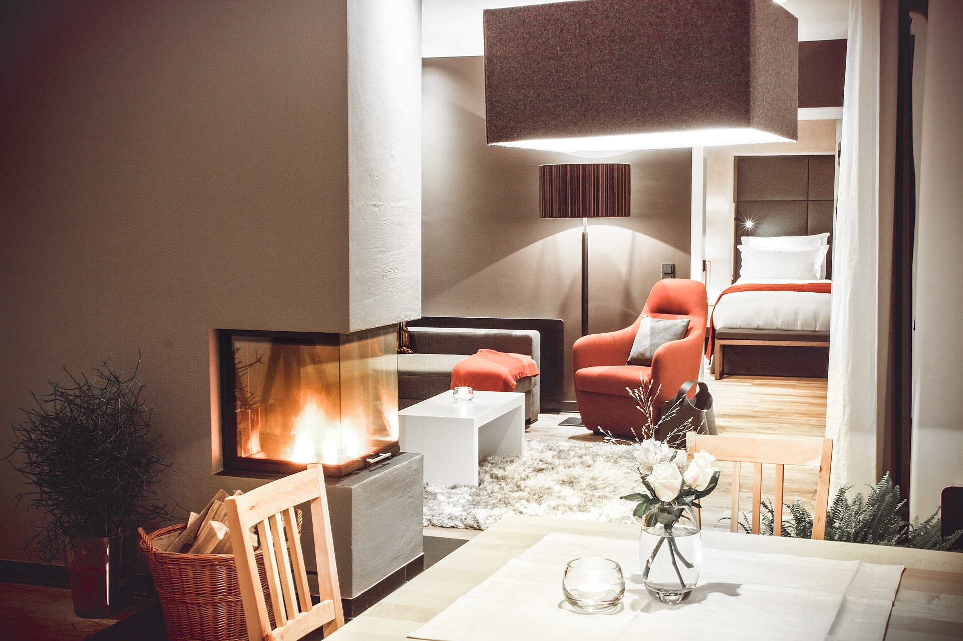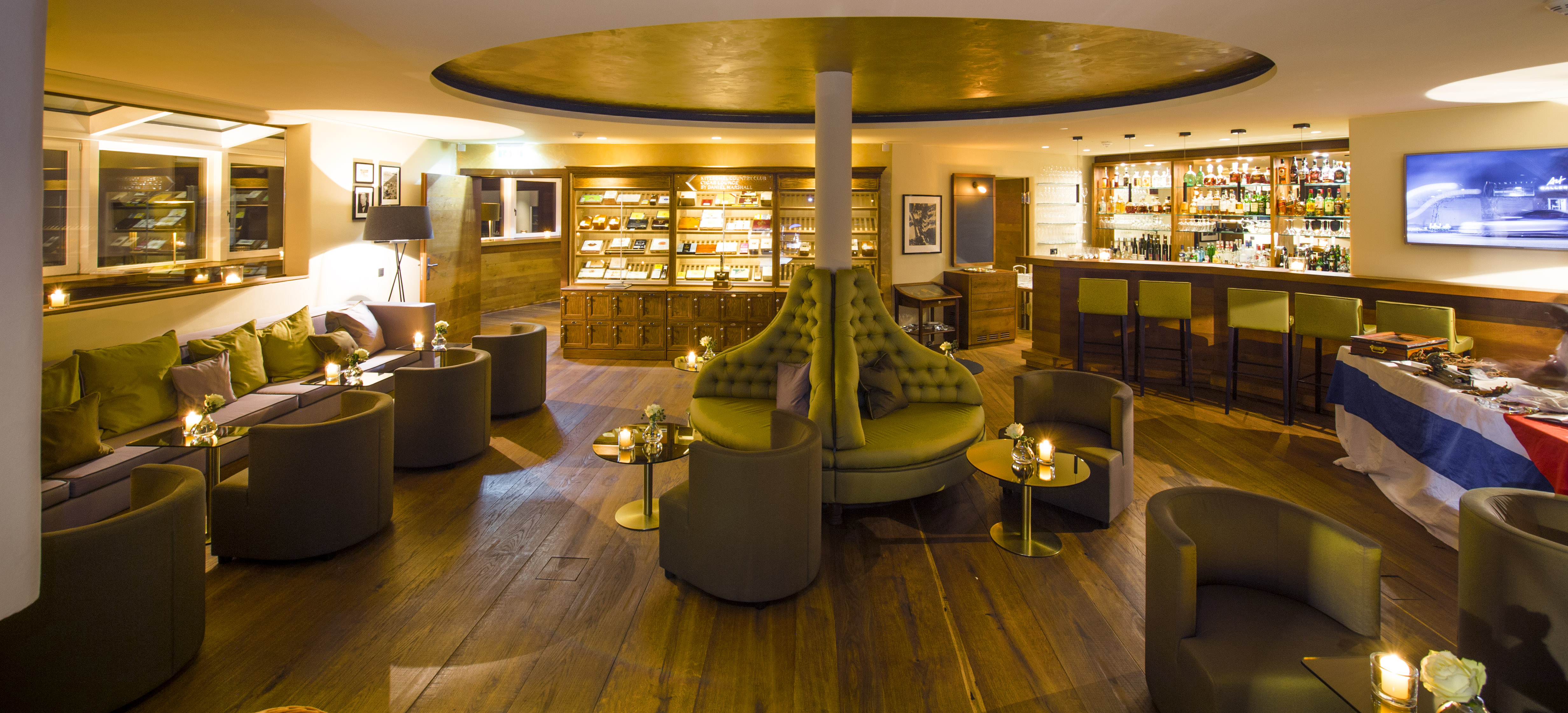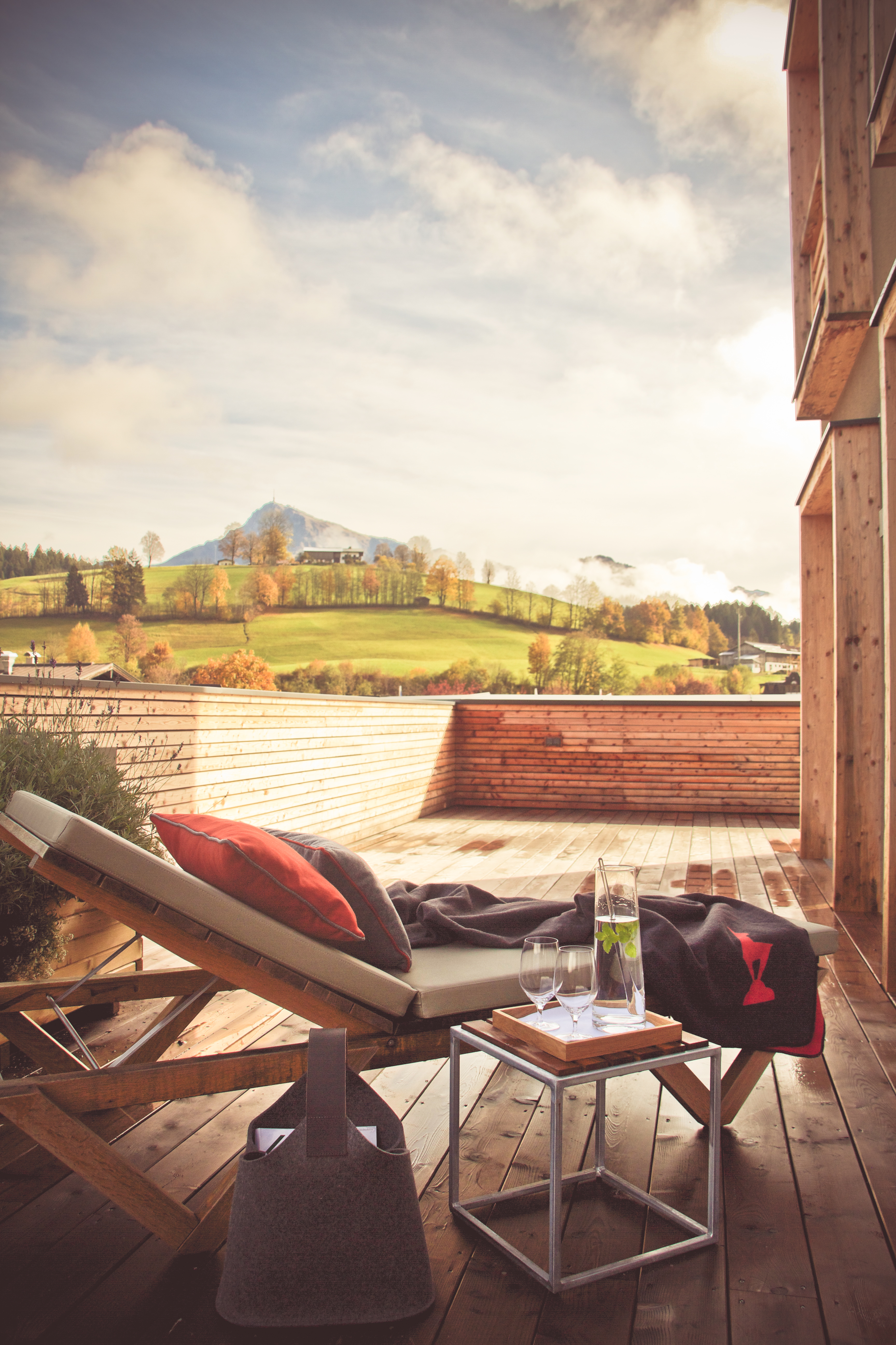 The cigar lounge, replete with a humidor and private cigar lockboxes has a fantastic view of the Wilde Kaiser, Kitzbühler Horn, southern mountains, Hahnenkamm, and Rauen Kopf peaks. The breathtaking panorama can also be enjoyed from the adjoining 1000-square-meter terrace. This is where the day comes to a close, with a hand-rolled cigar, fine spirits from the lounge bar, and the fire crackling in the open fireplace.