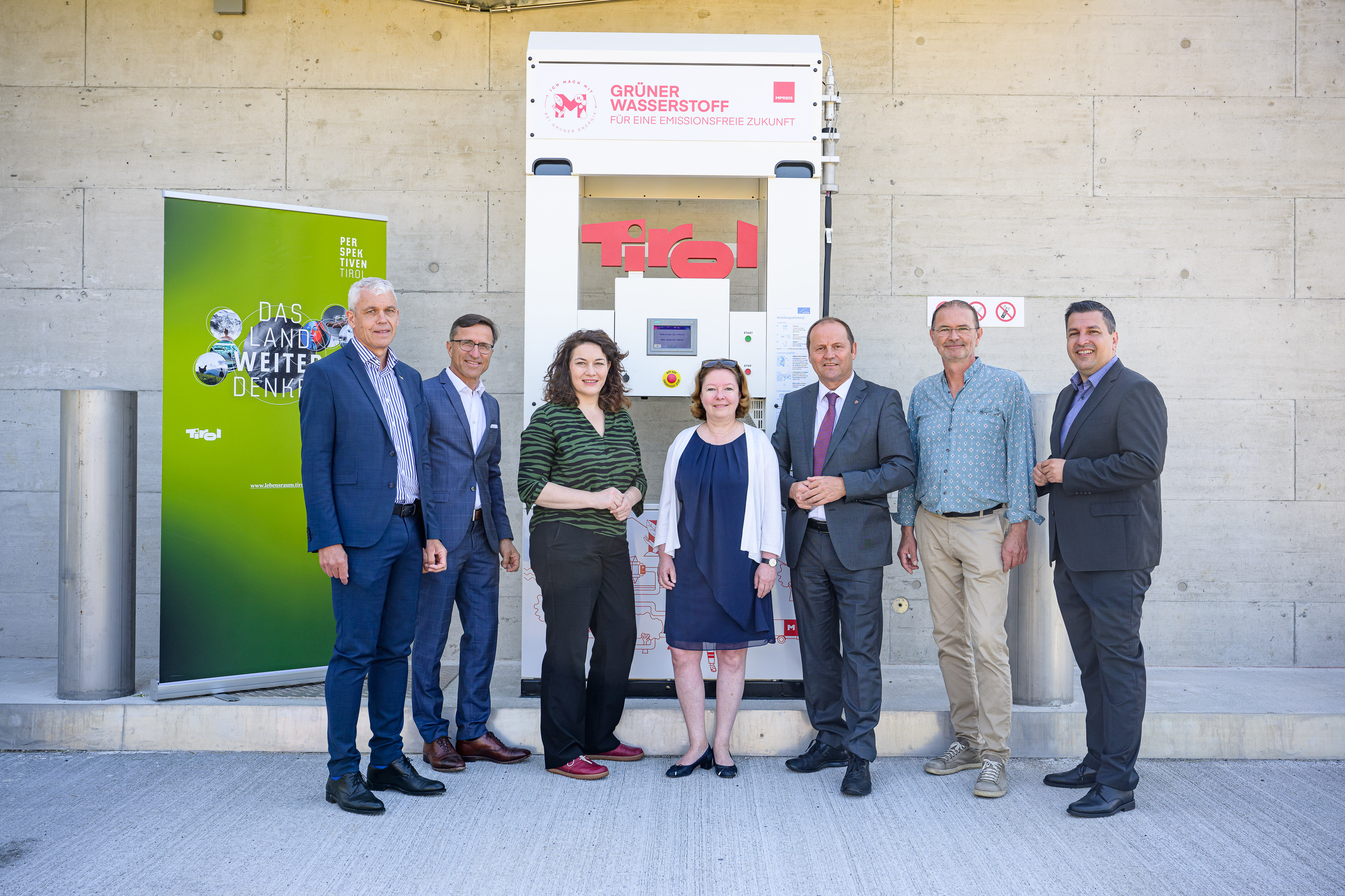 (v.li.) Wolfram Gehri (Postbus AG), Josef Margreiter (Lebensraum Tirol Holding), LH-Stv.in Ingrid Felipe, Kerstin Neumayer (Geschäftsführerin MPREIS), LH-Stv. Josef Geisler, Ewald Perwög (Projektleiter MPREIS Wasserstoff), Marcus Hofer (Geschäftsführer Standortagentur Tirol)
