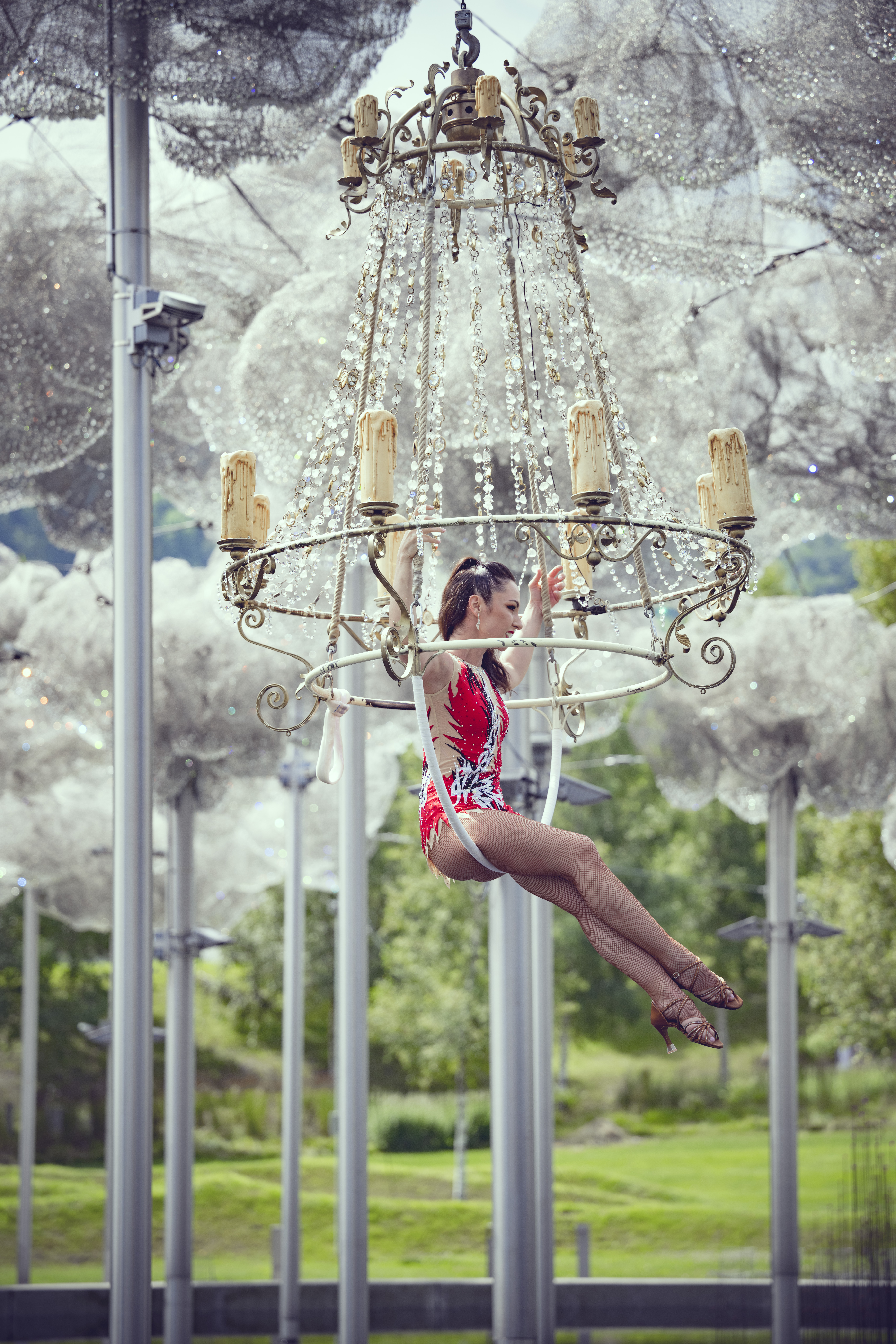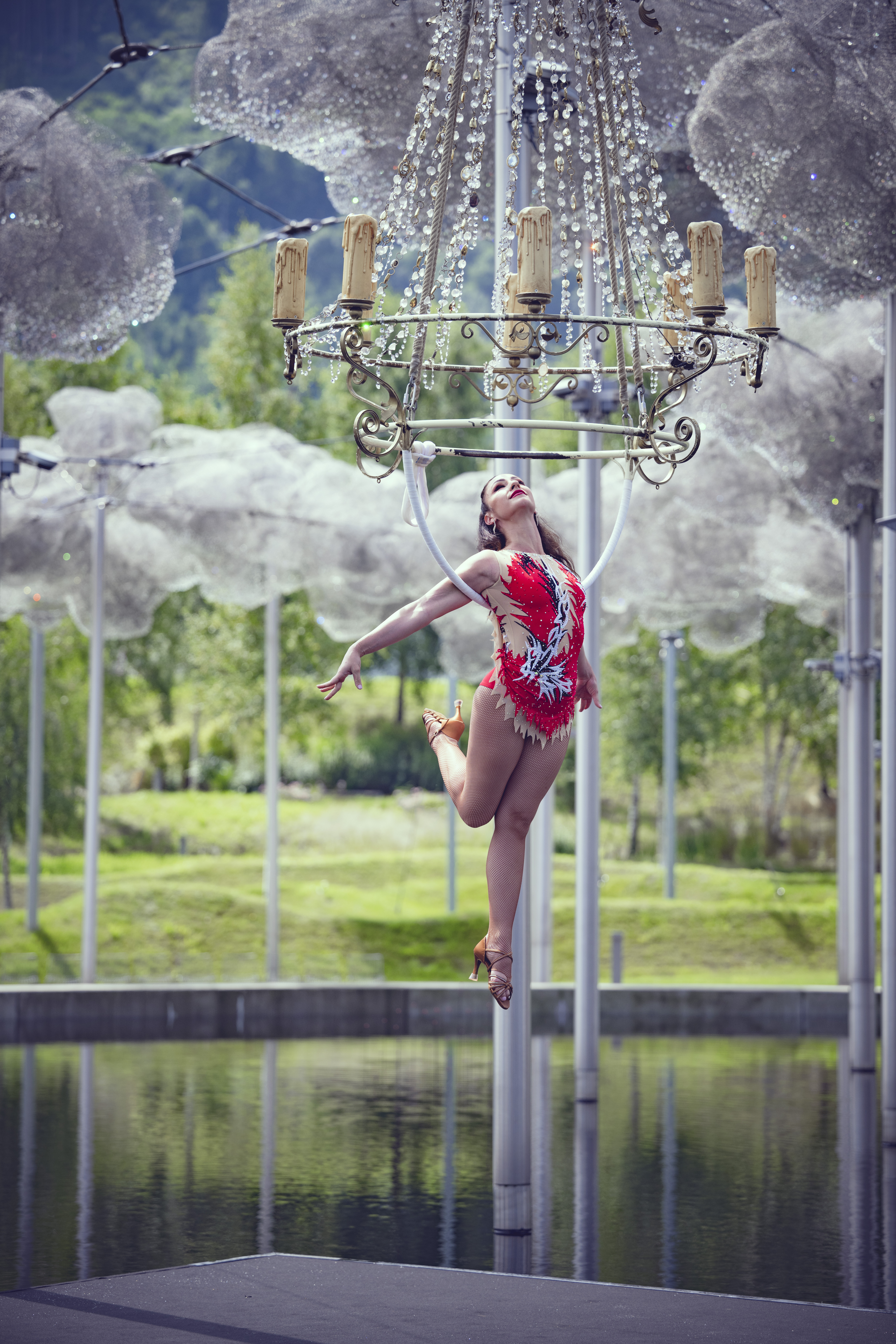 Es strahlt und funkelt, wenn die italienische Artistin Shannon sich in den Kristallluster begibt, der hoch in der Luft über dem Spiegelwasser unter der Kristallwolke hängt. Die Akrobatin verzaubert die Zuschauer mit Grazie und Anmut. In immer neuen Figuren verrenkt sie sich und verschmilzt mit ihrem einzigartigen Requisit zu einer Einheit. Körperkunst, technische Präzision und wahre Schönheit vereinen sich zu einer ganz besonderen Darbietung.