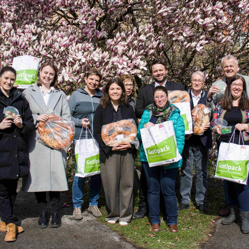 Georg Willi (li.), Natalie Treitinger (7.v.l.), Manuel Flatscher (5.v.r.), Hubert Innerebner (3.v.r.) und Mathias Mölk (r.) freuen sich über die gemeinsame Aktion.