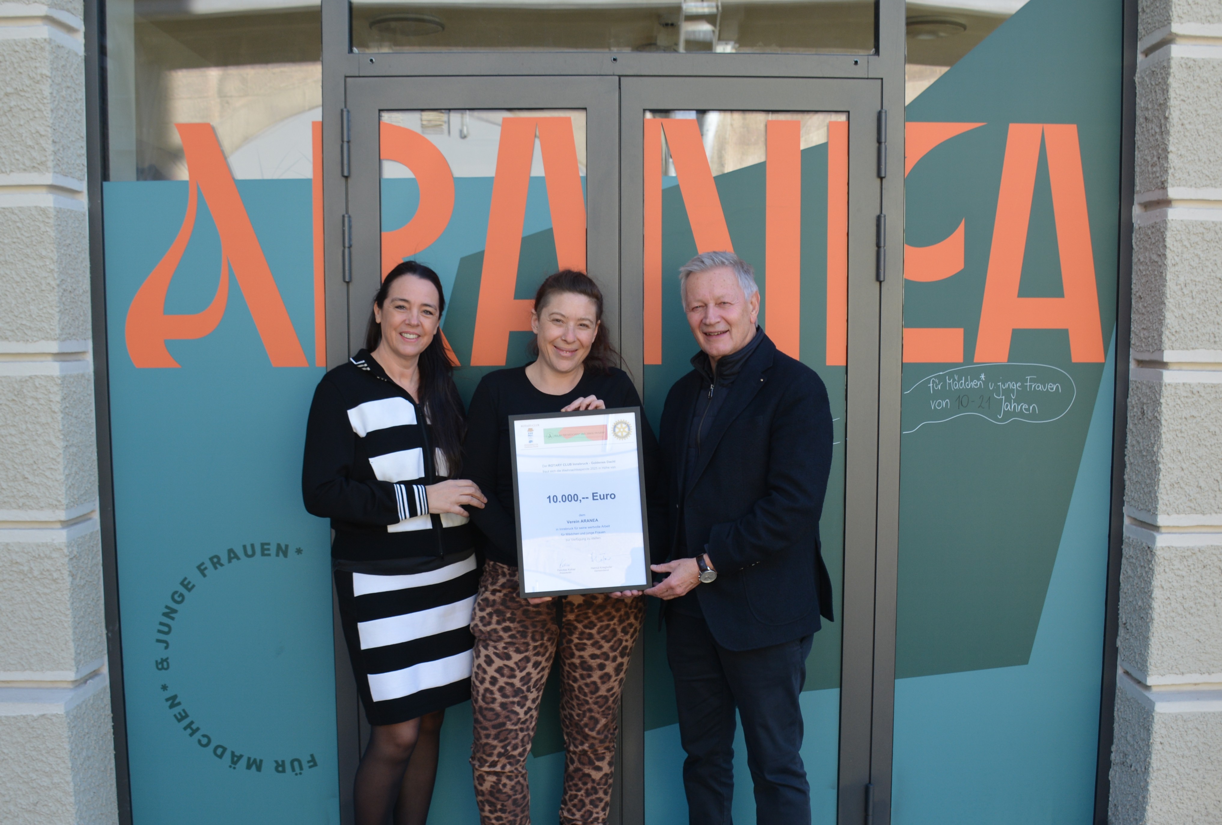 Der Verein Aranea betreibt das einzige Mädchenzentrum Tirols mit einer niederschwelligen Anlauf- und Beratungsstelle für Mädchen und junge Frauen im Alter von 10 bis 25 Jahren. Die Nachfrage nach Unterstützung ist groß – die finanziellen Mittel hingegen werden zunehmend knapper. Um die wertvolle Arbeit von Aranea zu unterstützen, übergab nun der Rotary Club Innsbruck-Goldenes Dachl seine diesjährige Weihnachtsspende in Höhe von 10.000 Euro an diesen Innsbrucker Verein.