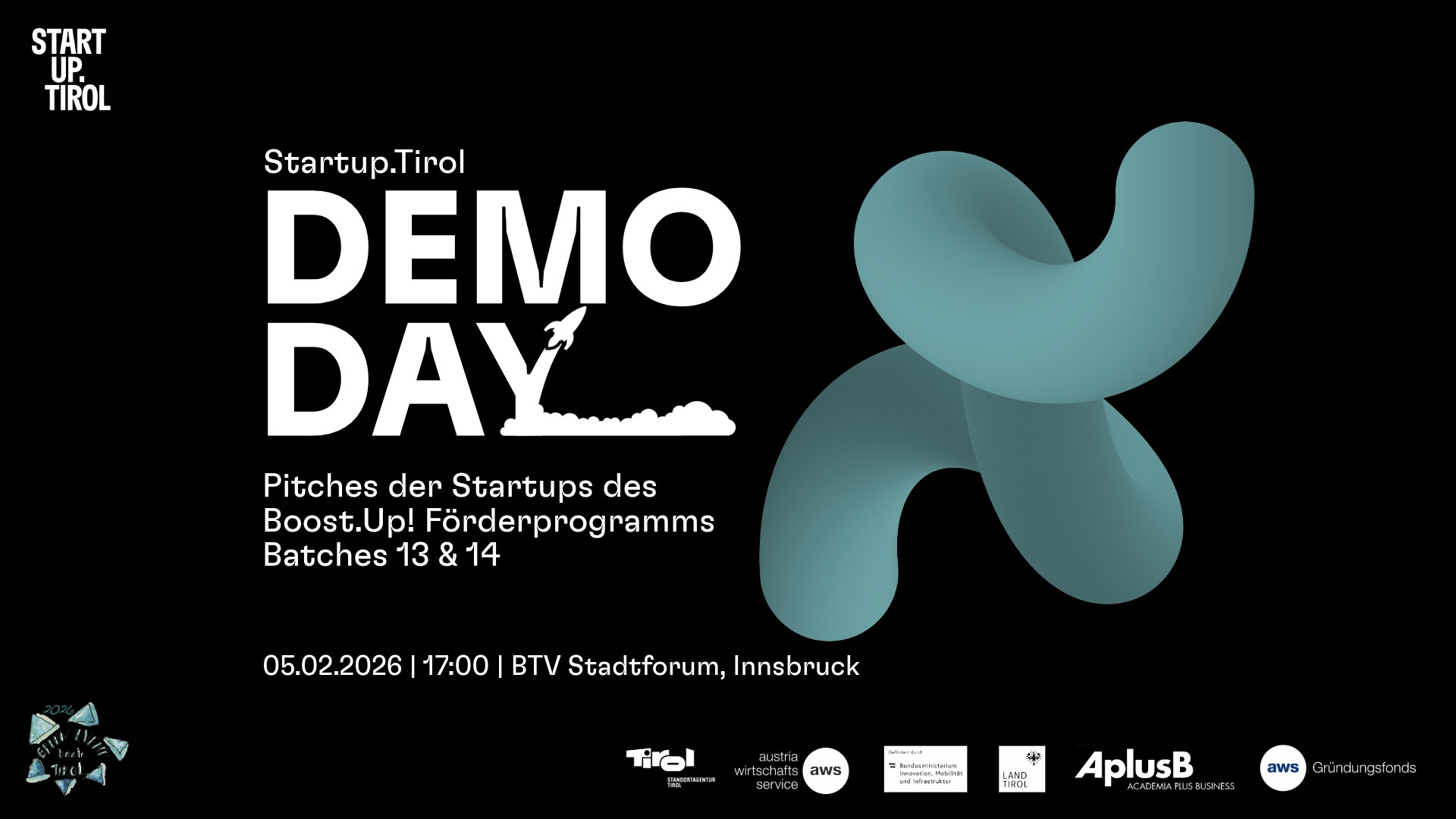 Startup.Tirol wird wird durch die Austria Wirtschaftsservice GmbH im Rahmen des AplusB-Scale-up-Programms des Bundesministeriums für Innovation, Mobilität und Infrastruktur und durch das Land Tirol gefördert. Gesellschafter:innen sind Standortagentur Tirol, Universität Innsbruck, Medizinische Universität Innsbruck, Management Center Innsbruck, Fachhochschule Kufstein, UMIT Tirol, Wirtschaftskammer Tirol und Verein Startup.Tirol.