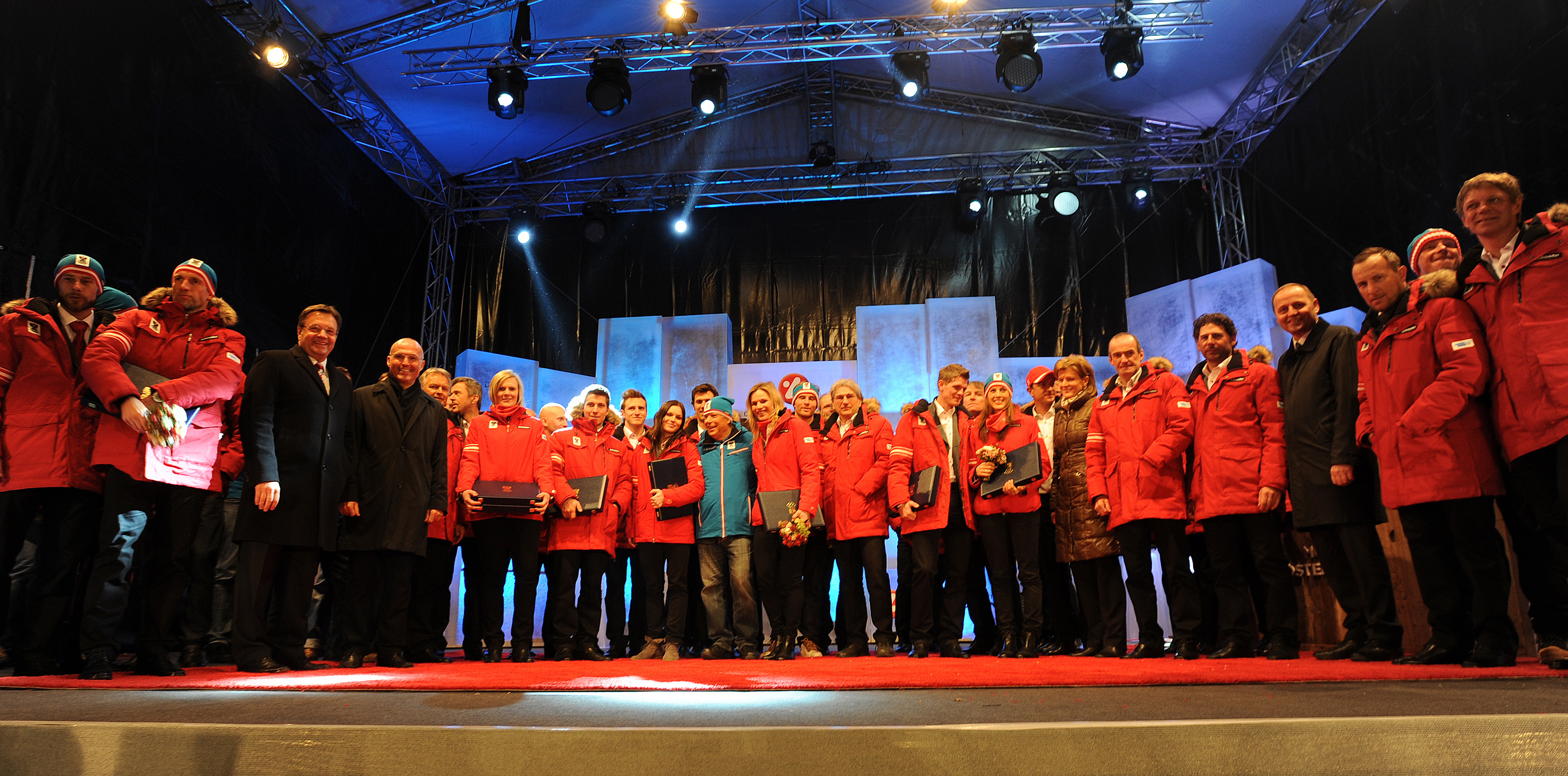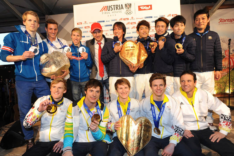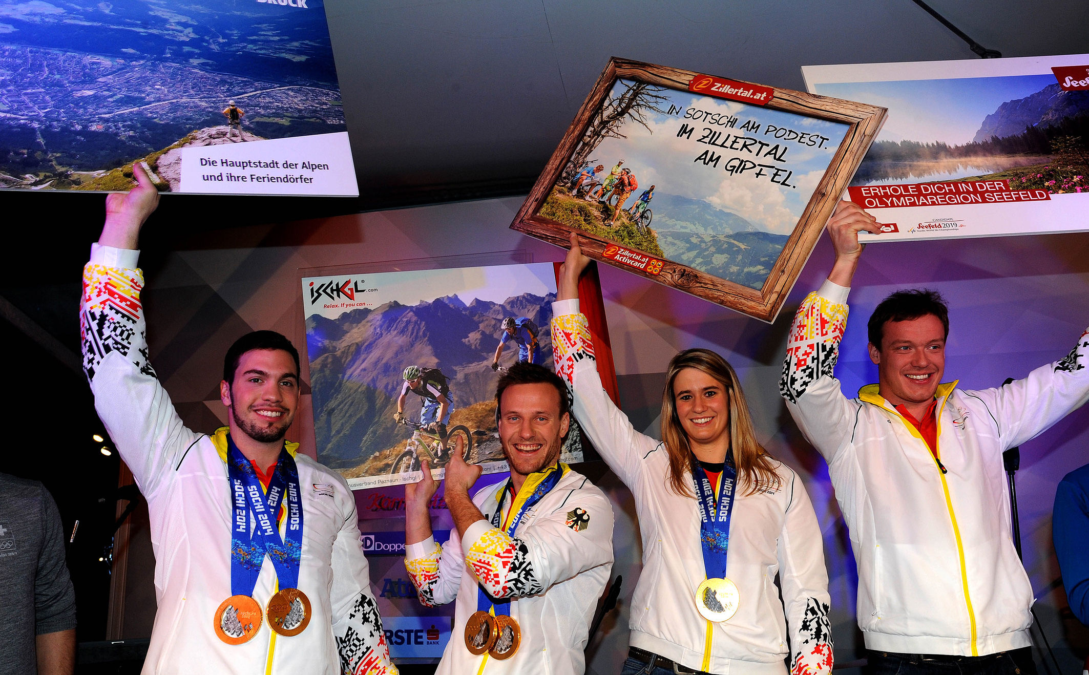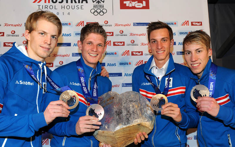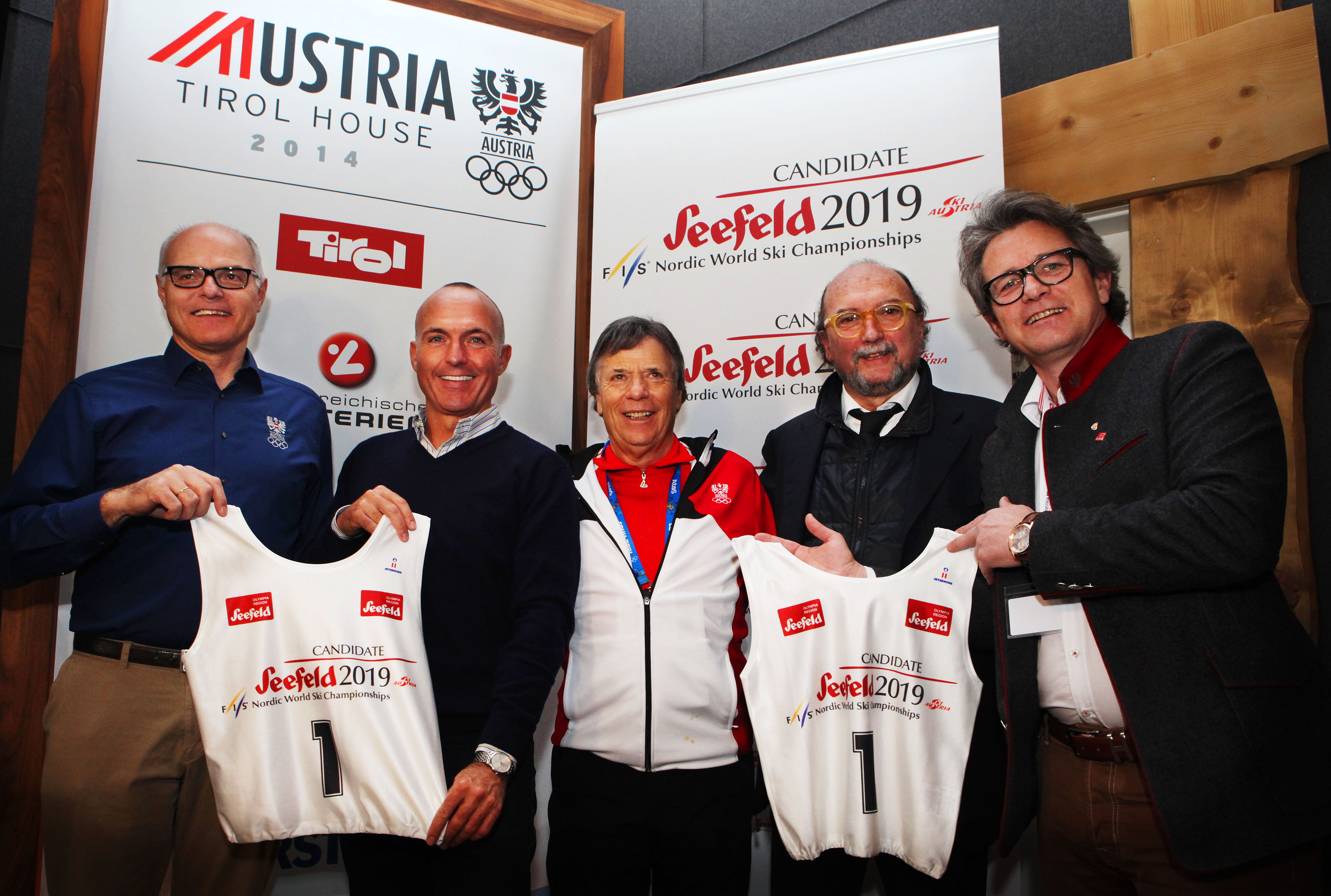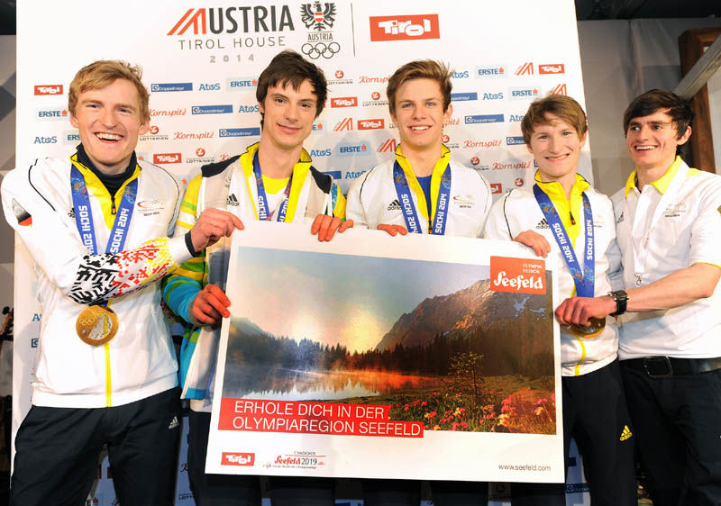 Das deutsche Team (v.li.) Severin Freund, Andreas Wank, Andreas Wellinger, Marinus Kraus und Richard Freitag erhielt einen Urlaubsgutschein für die Olympiaregion Seefeld und verbindet dies gleich mit einem Trainingslager, zumal Seefeld sich für die Austragung der Nordischen Ski-Weltmeisterschaft 2019 bewirbt.