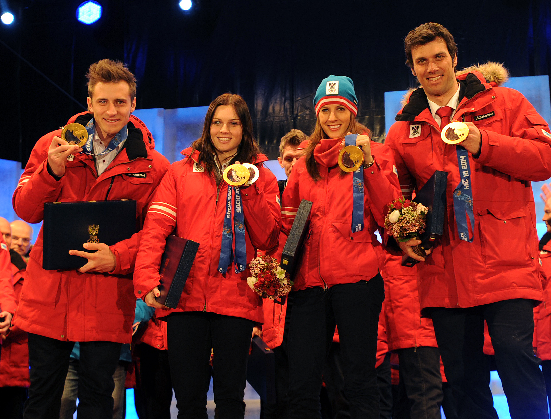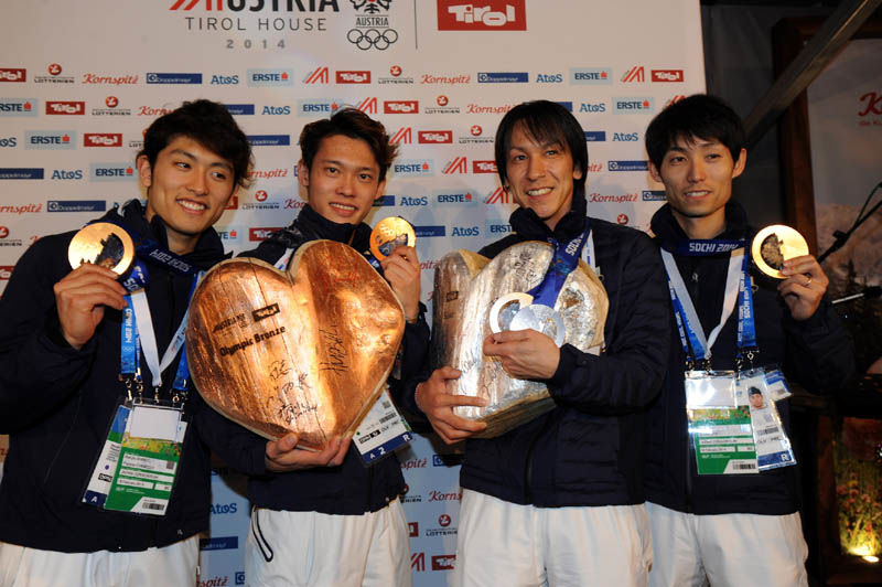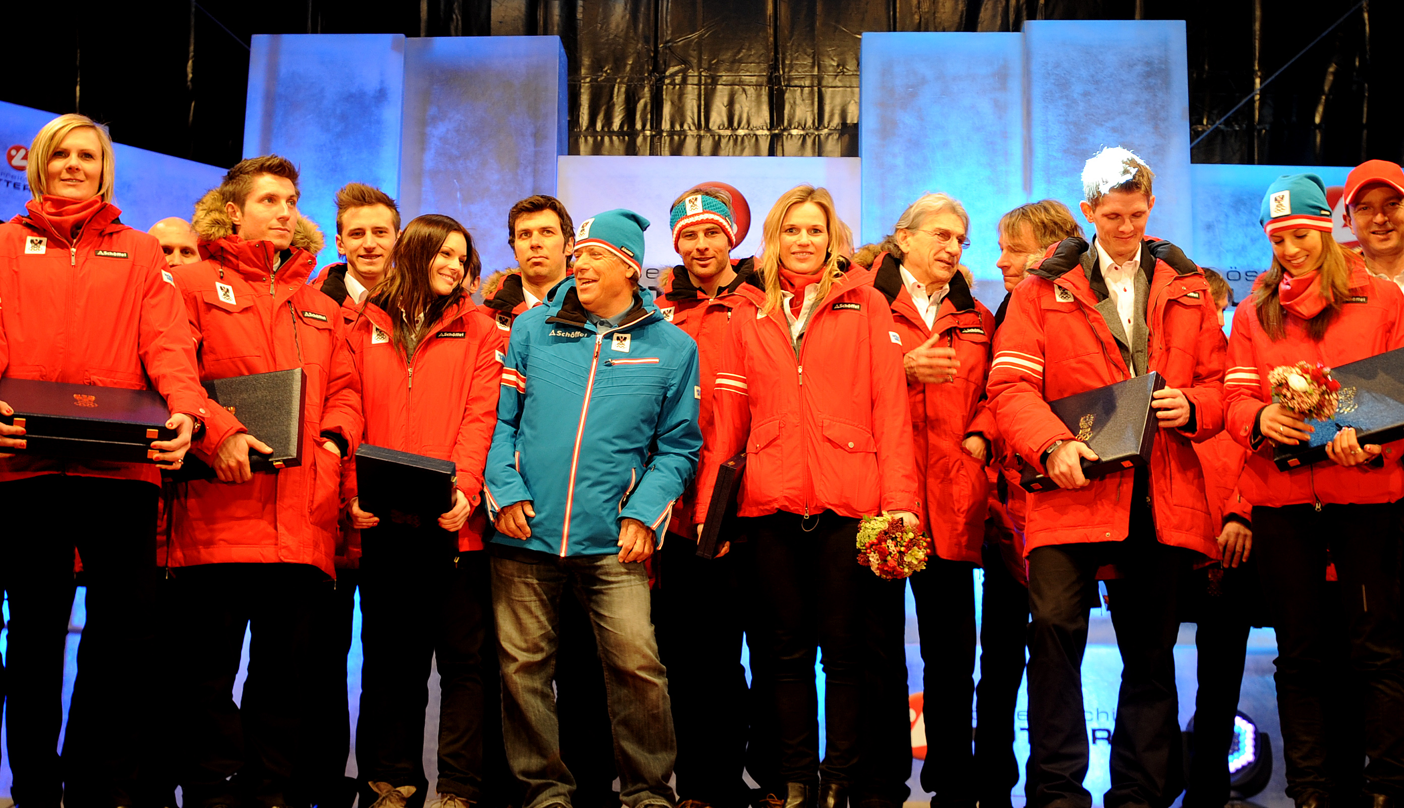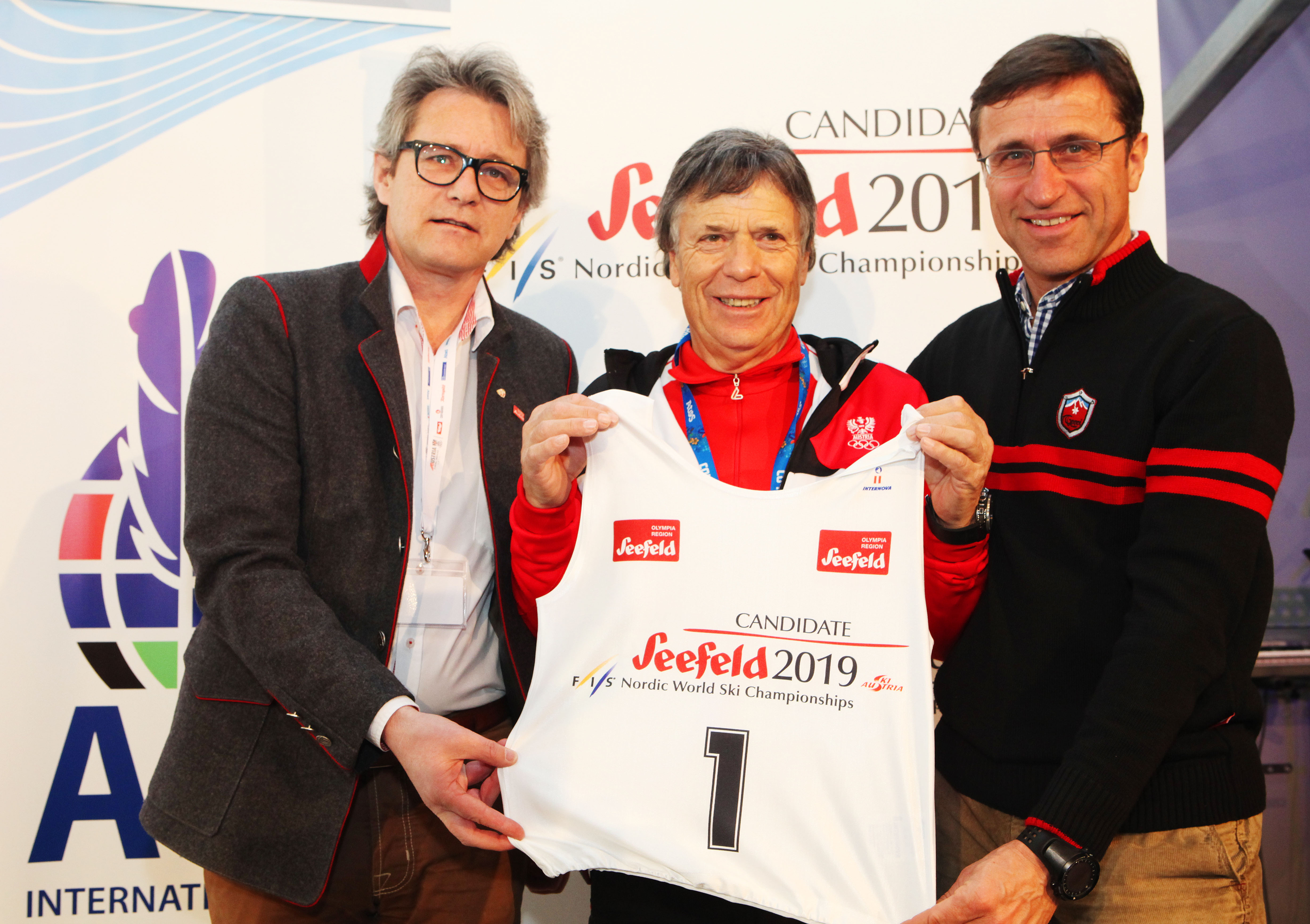 Das deutsche Team (v.li.) Severin Freund, Andreas Wank, Andreas Wellinger, Marinus Kraus und Richard Freitag erhielt einen Urlaubsgutschein für die Olympiaregion Seefeld und verbindet dies gleich mit einem Trainingslager, zumal Seefeld sich für die Austragung der Nordischen Ski-Weltmeisterschaft 2019 bewirbt.