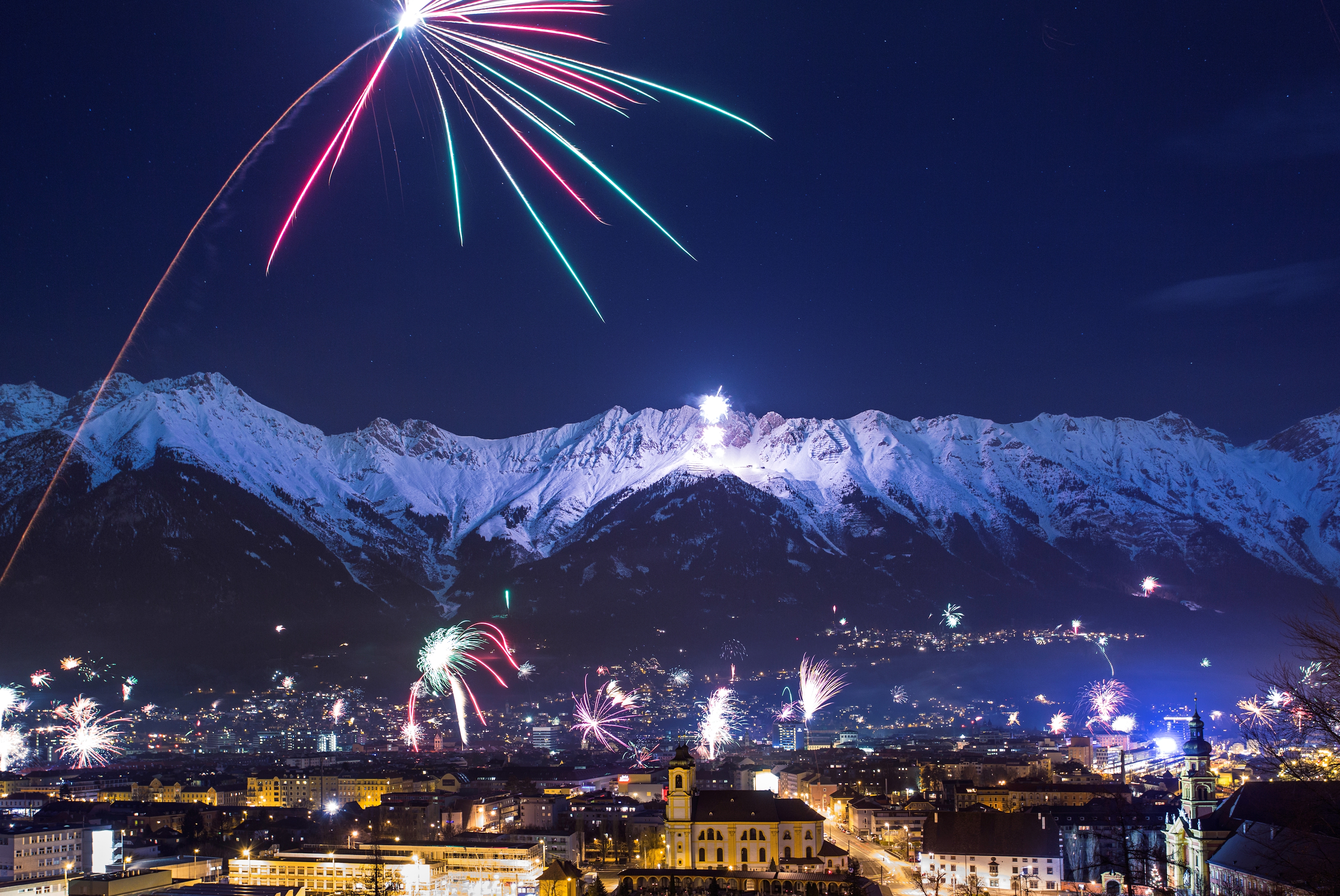 Bergsilvester in der StadtDie Stadt und die Berge – in Innsbruck kein Gegensatz, sondern zwei Dinge, die zusammengehören. Beeindruckende Gipfel geben den Häuserfassaden einen einmaligen Rahmen, während sich im Stadtzentrum unzählige Restaurants, hippe Cafés und trendige Läden aneinanderreihen. Zum Jahreswechsel verwandelt sich die Innenstadt in eine riesige Partyzone. Ab 21.00 Uhr sorgen Open-Air Livemusik und Showprogramme für Stimmung, die sich bis Mitternacht zum Höhepunkt steigert: 2018 wird mit einem spektakulären Feuerwerk begrüßt, das mit den imposanten Gipfeln der Nordkette im Hintergrund zum einzigartigen Erlebnis wird. Punkt Mitternacht erklingt in der ganzen Stadt der Straßenwalzer „An der schönen blauen Donau“ und lässt das Partyvolk in schwungvollem Dreivierteltakt ins neue Jahr tanzen - mit Blick auf das beeindruckende Feuerwerk, das die Berge hell erleuchtet.