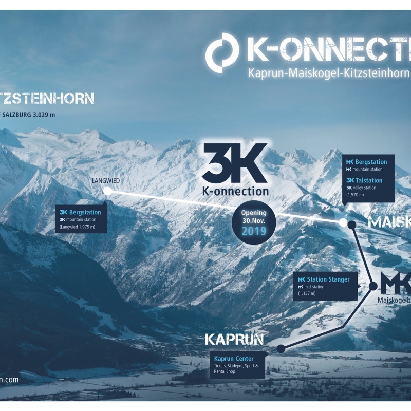 Mit der Eröffnung der 3K K-onnection, Salzburgs erster Dreiseilumlaufbahn und Herzstück der K-ONNECTION, werden das Kapruner Ortszentrum, der Familienberg Maiskogel und das 100 % schneesichere Gletscherskigebiet Kitzsteinhorn zu einer Einheit verbunden. Dieser Zusammenschluss bietet erstmals in Kaprun Ski-in-Ski-out zum und vom Gletscher sowie eine einzigartige Panoramafahrt mit neuen faszinierenden Perspektiven.
