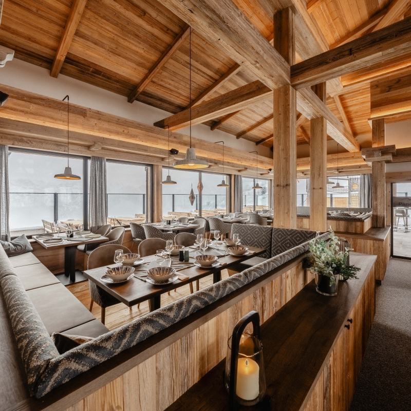 Der neu gestaltete Bedienungsbereich des Panorama Restaurants Kreuzjoch verbindet Tradition und Moderne.