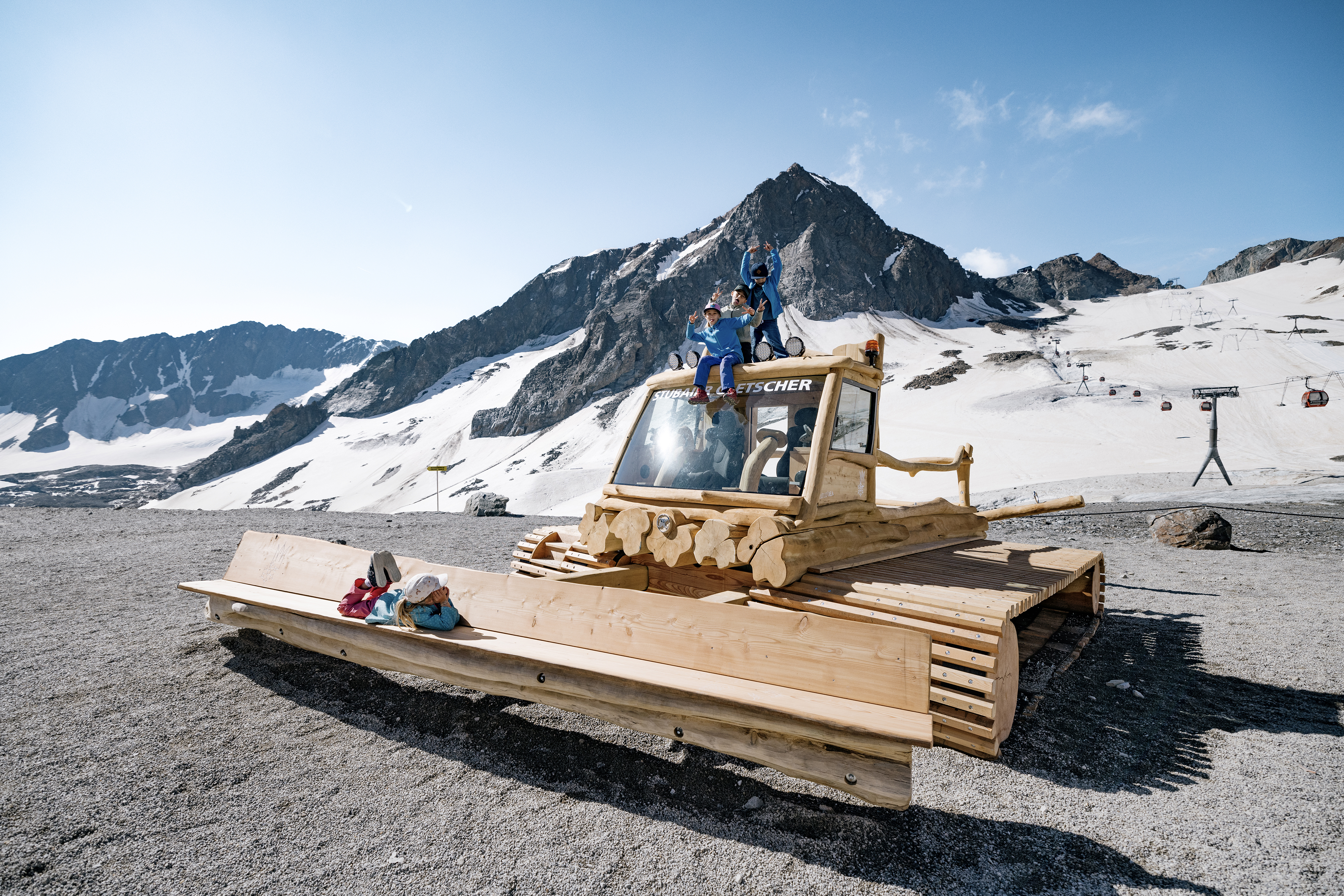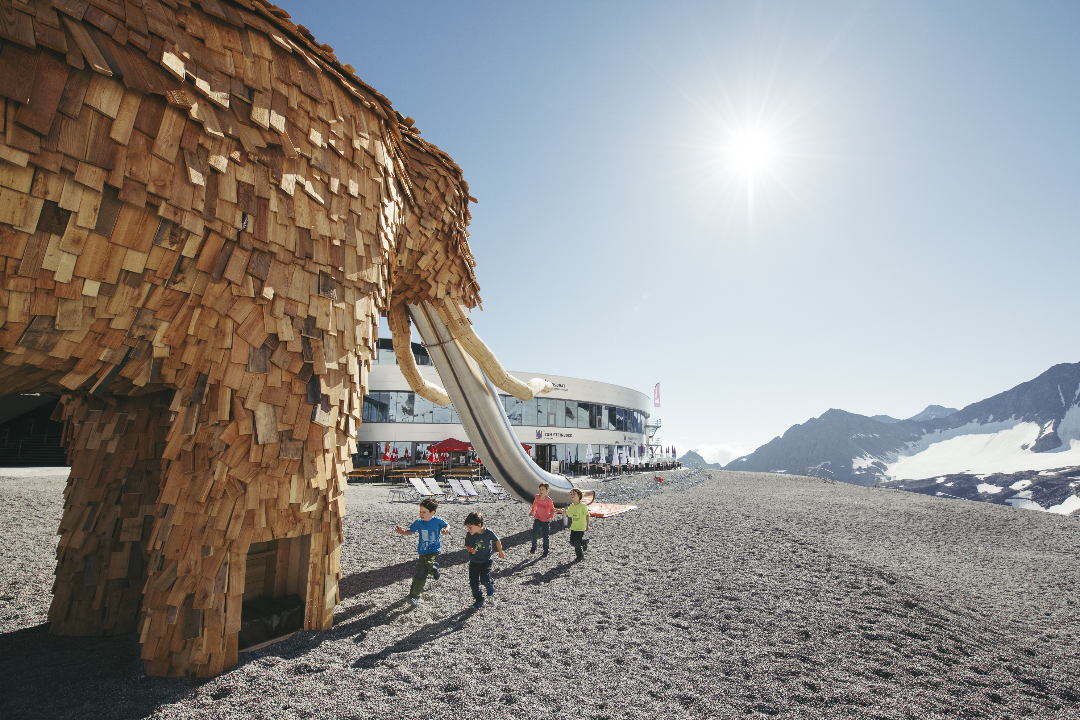 Der Abenteuerspielplatz am Stubaier Gletscher auf knapp 3.000 Metern Seehöhe bietet den Kindern während der Sommermonate vielfältige Spielmöglichkeiten. An der Bergstation der Eisgratbahn stehen das Riesen-Mammut und eine Pistenraupe aus Holz in Originalgröße als Spielestationen bereit, auf denen die Kinder klettern, rutschen und wippen können. Ein weiteres Highlight am Stubaier Gletscher ist die Gipfelplattform TOP OF TYROL auf 3.210 Metern Seehöhe. Von dort aus ergibt sich bei gutem Wetter ein weitreichender Ausblick bis hin zu den Dolomiten in Südtirol.