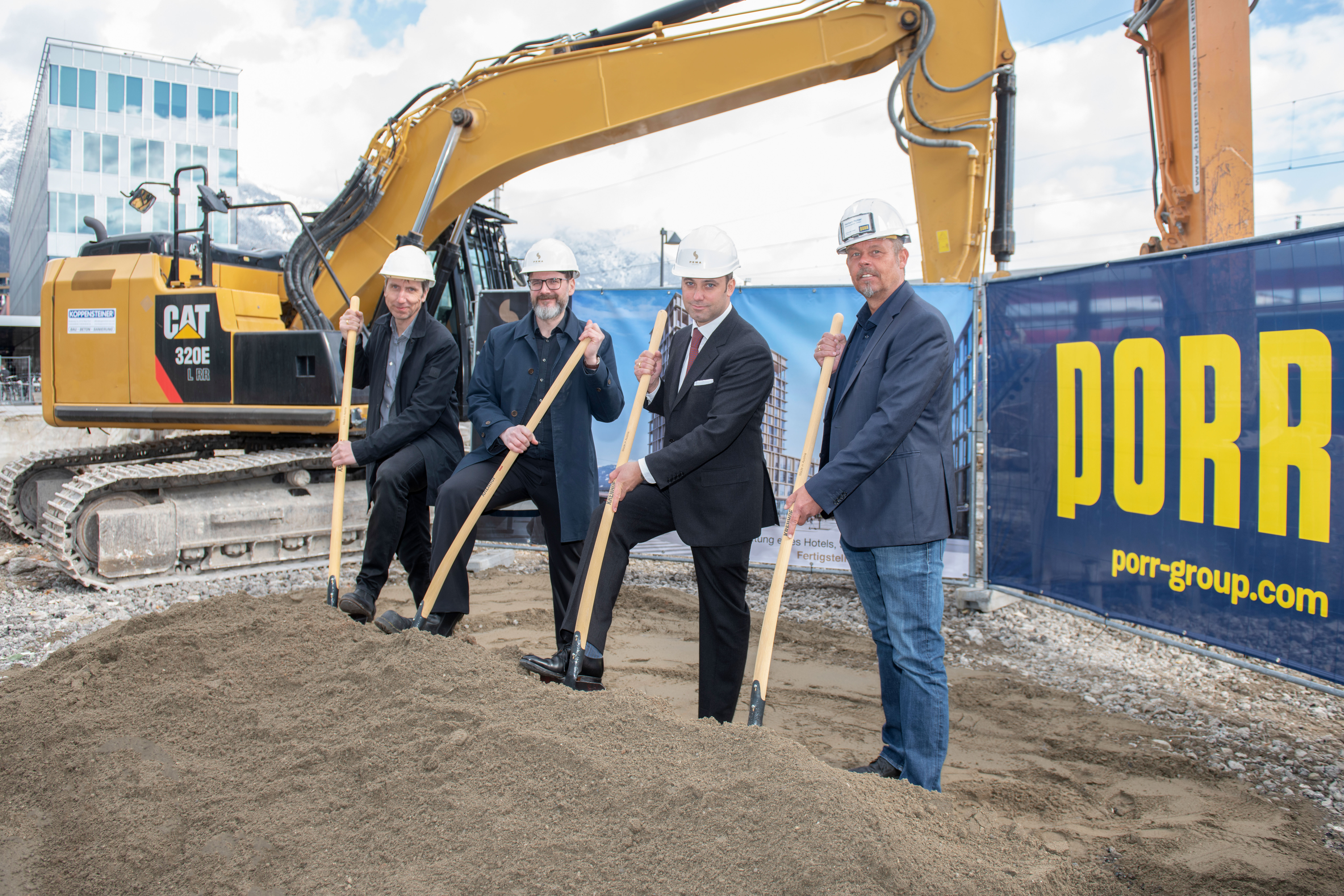 Spatenstich für das Projekt P3 in Innsbruck (v.l.n.r.): Die Architekten Alois Zierl und Michael Heinlein, Markus Schafferer (geschäftsführender Gesellschafter der PEMA Holding) und Herbert Pichler (PORR, Techn. NL-Leiter Tirol/Vorarlberg).