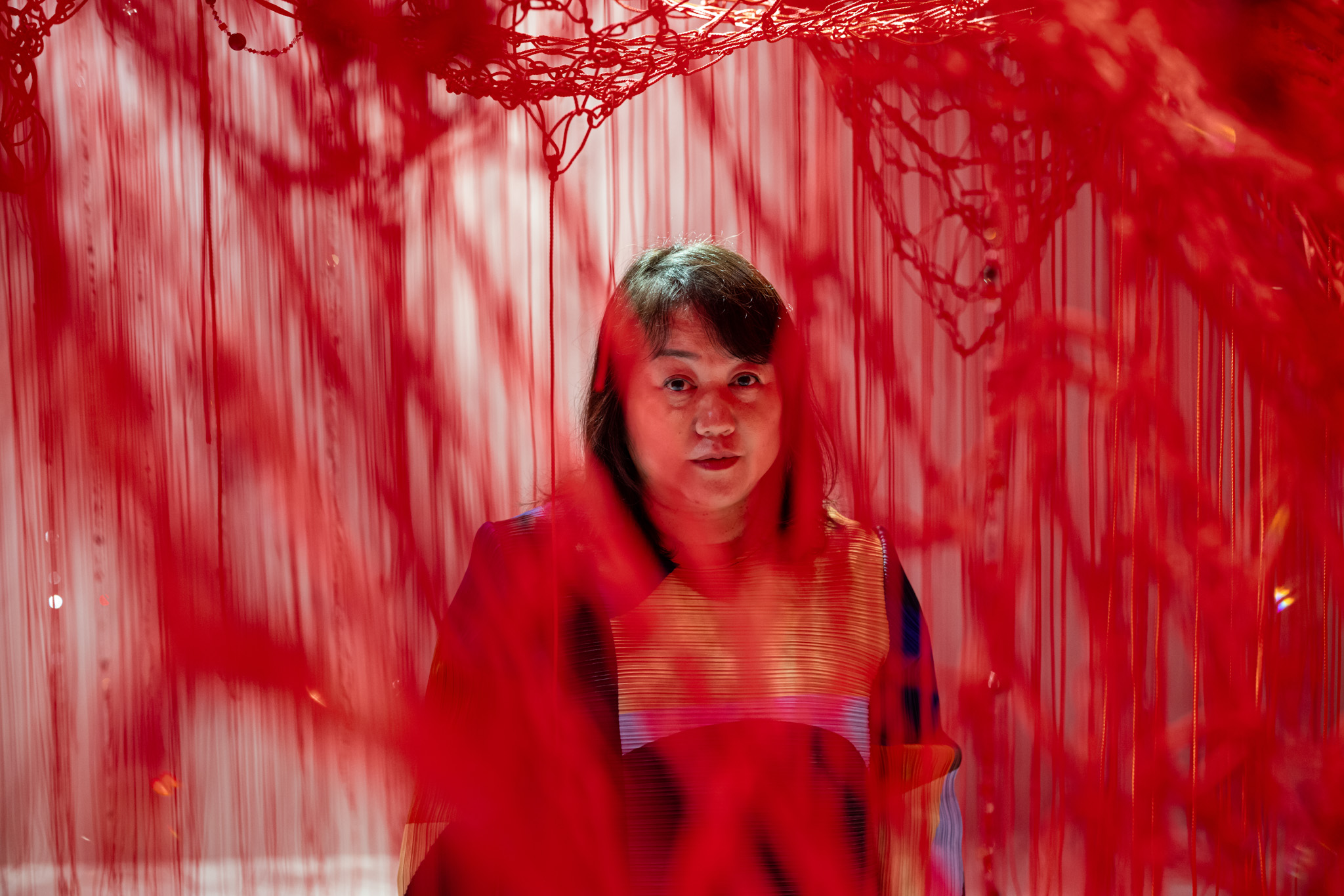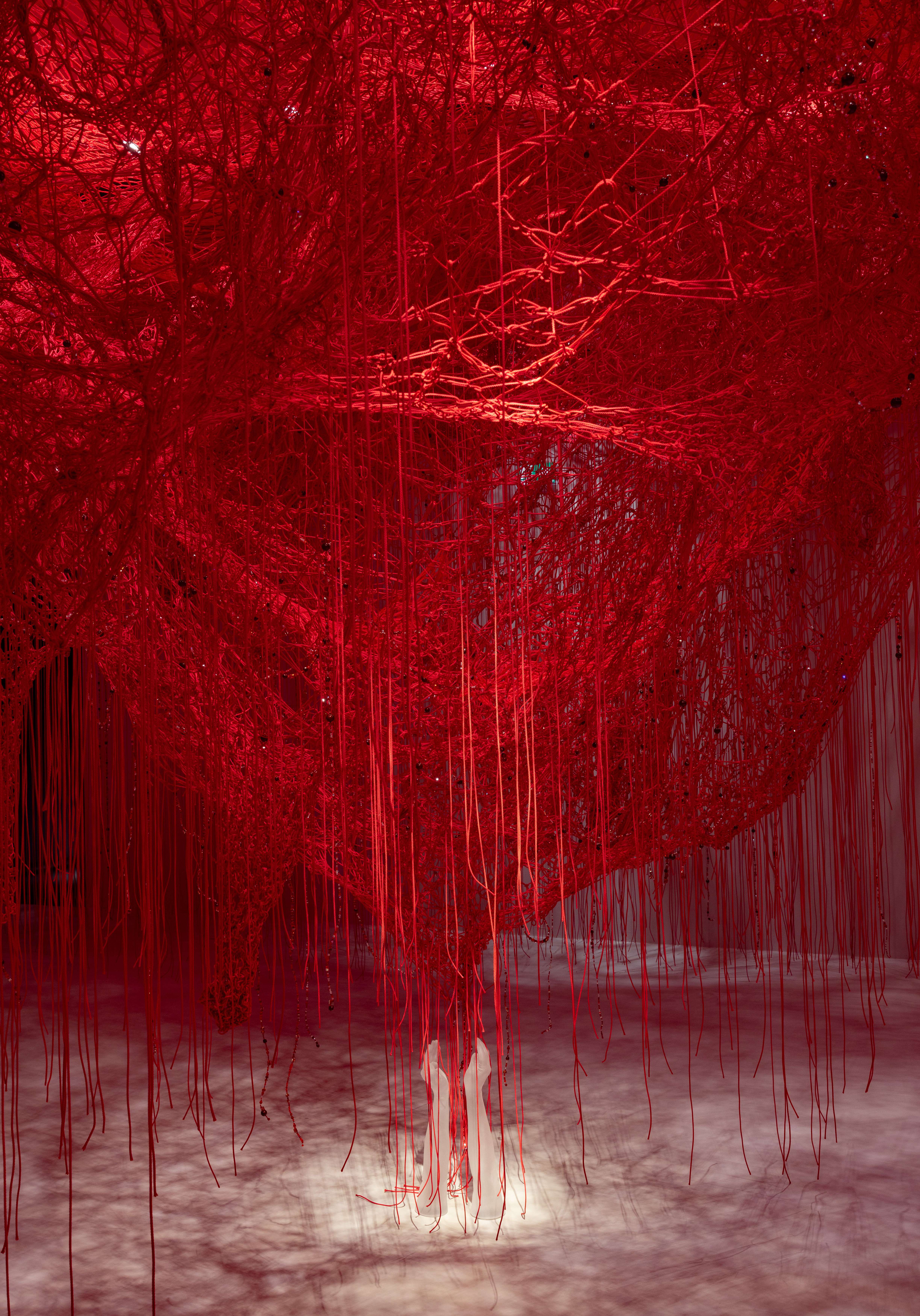 In „Crystallizing Identity“ verwendet Chiharu Shiota zum ersten Mal Kristall in einem ihrer Kunstwerke. Mit diesem facettenreichen Material setzt sie sich damit auseinander, wie wir ganz wir selbst sein und gleichzeitig tiefe und ehrliche Beziehungen zu anderen Menschen eingehen können. Diese komplexe wie faszinierende, vielschichtige Installation nimmt Bezug auf die japanische Legende vom roten Faden. Diese über Generationen hinweg erzählte Geschichte besagt, dass Menschen, die füreinander bestimmt sind, ihr Leben lang durch unsichtbare rote Fäden miteinander verbunden sind. Verwirklicht wird dieses Konzept durch ein Netz aus roten Wollfäden, in das feine Kristallperlen eingewebt sind. Die Fäden laufen schließlich zusammen und verbinden sich zu zwei Füßen, zwei Armen und der Hand der Künstlerin, die von der Swarovski Manufaktur gefertigt wurden.