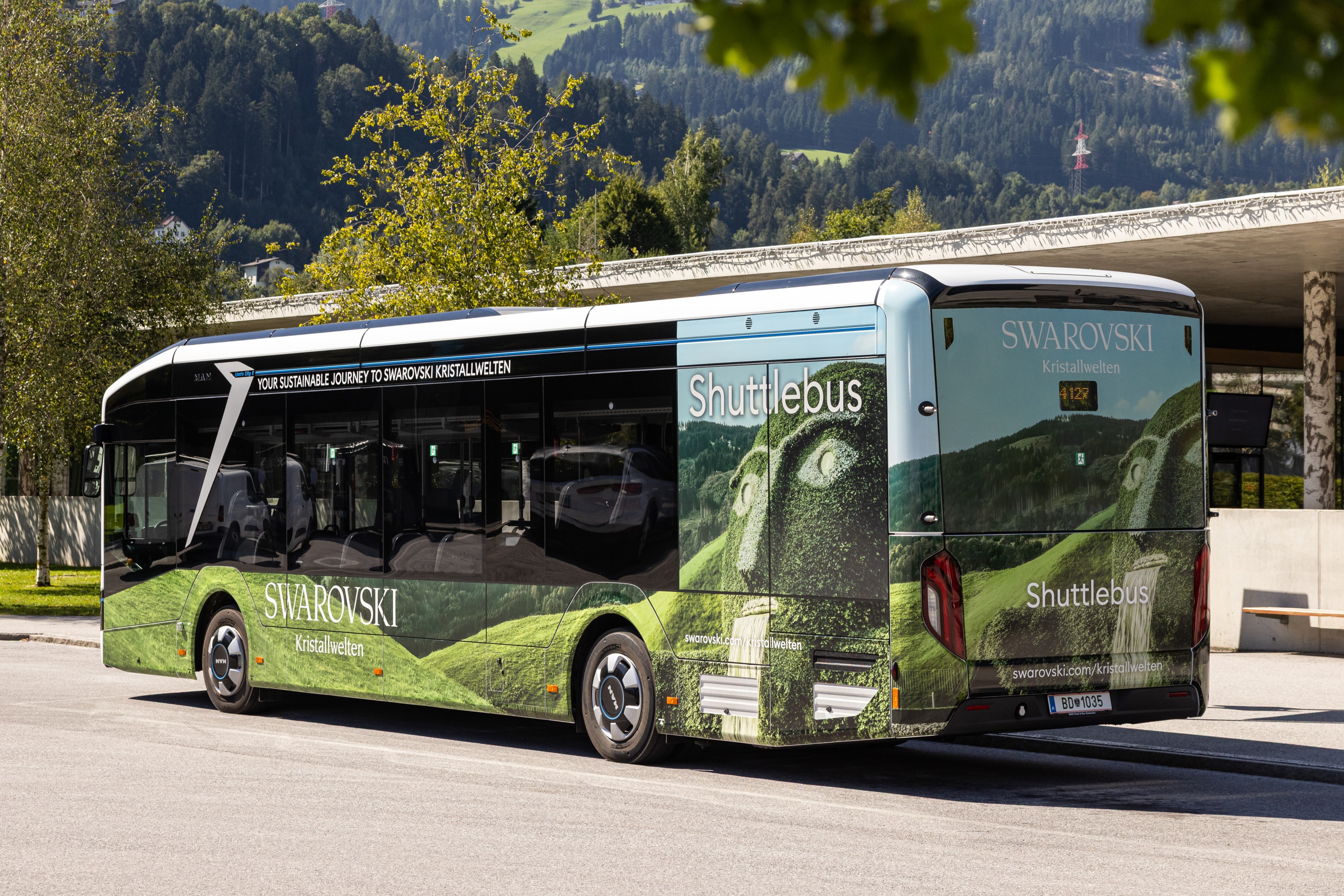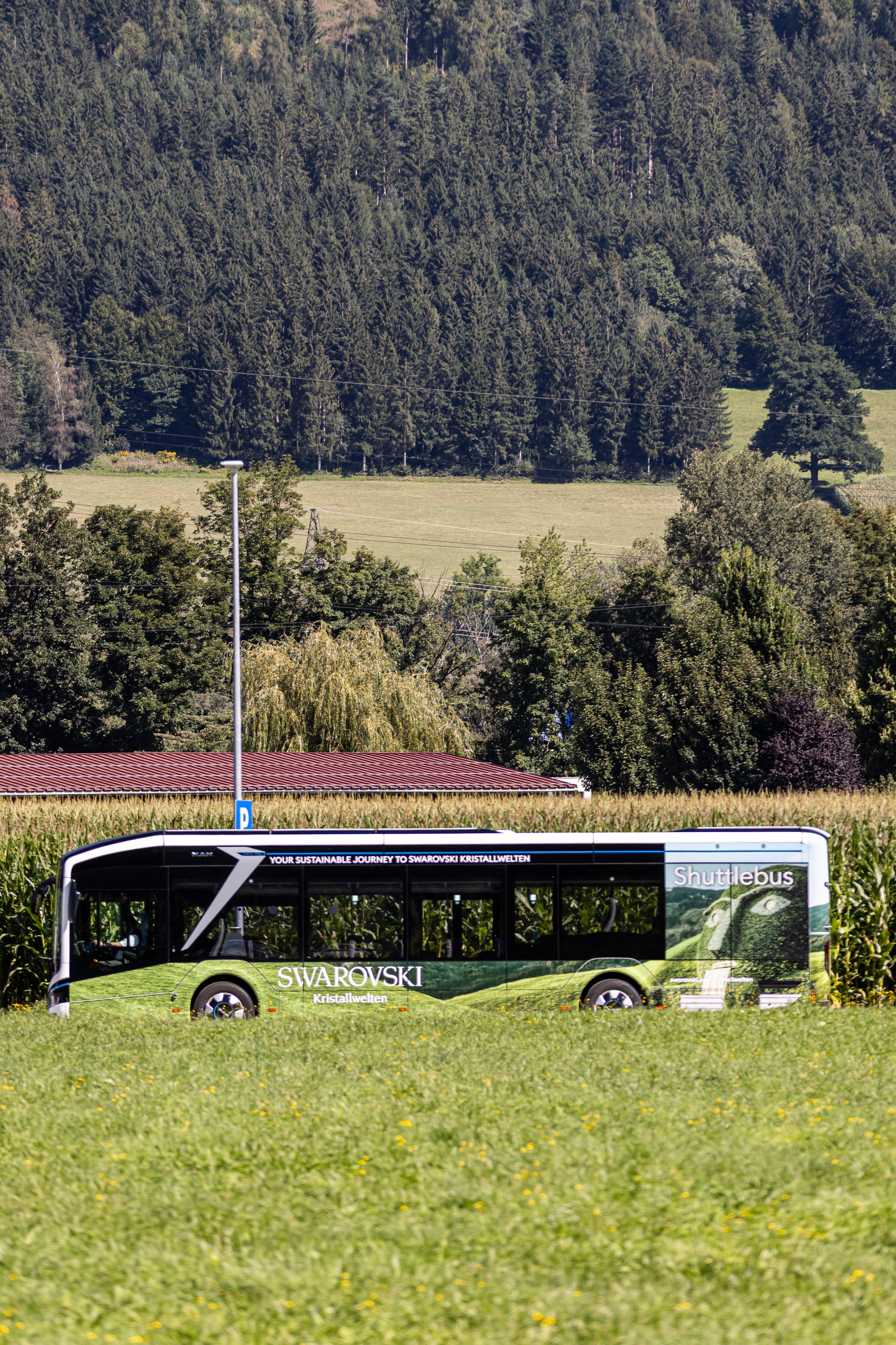 Mit über 3.600 Fahrten pro Jahr zwischen dem Innsbrucker Hauptbahnhof und den Swarovski Kristallwelten in Wattens ist der Shuttlebus eine wichtige Verbindung für Besucher*innen der beliebten Ausflugsdestination. Der neue E-Bus wird von Postbus betrieben, bietet 42 Sitz- und 24 Stehplätze und spart jährlich rund 65 Tonnen CO₂ ein.