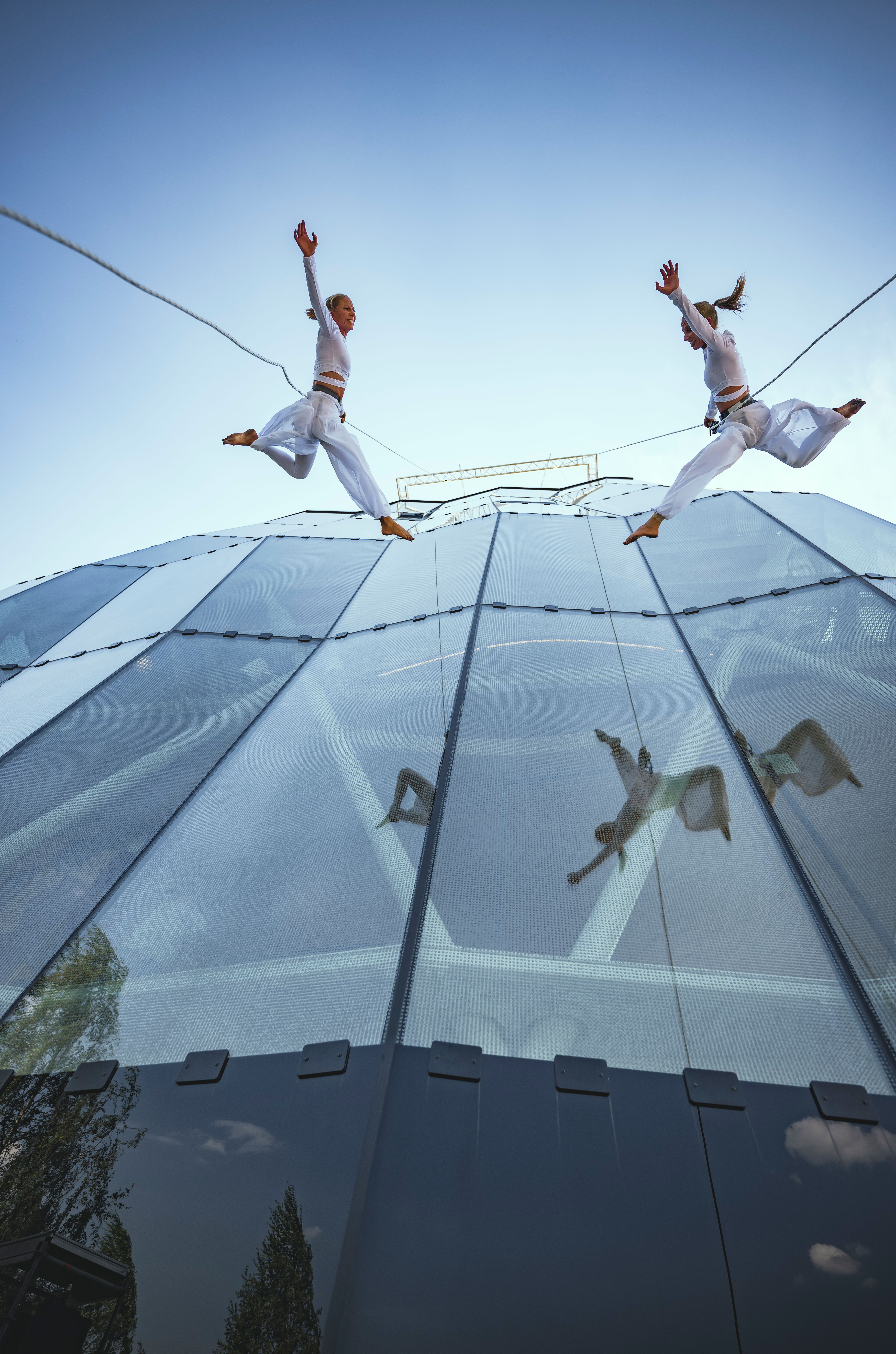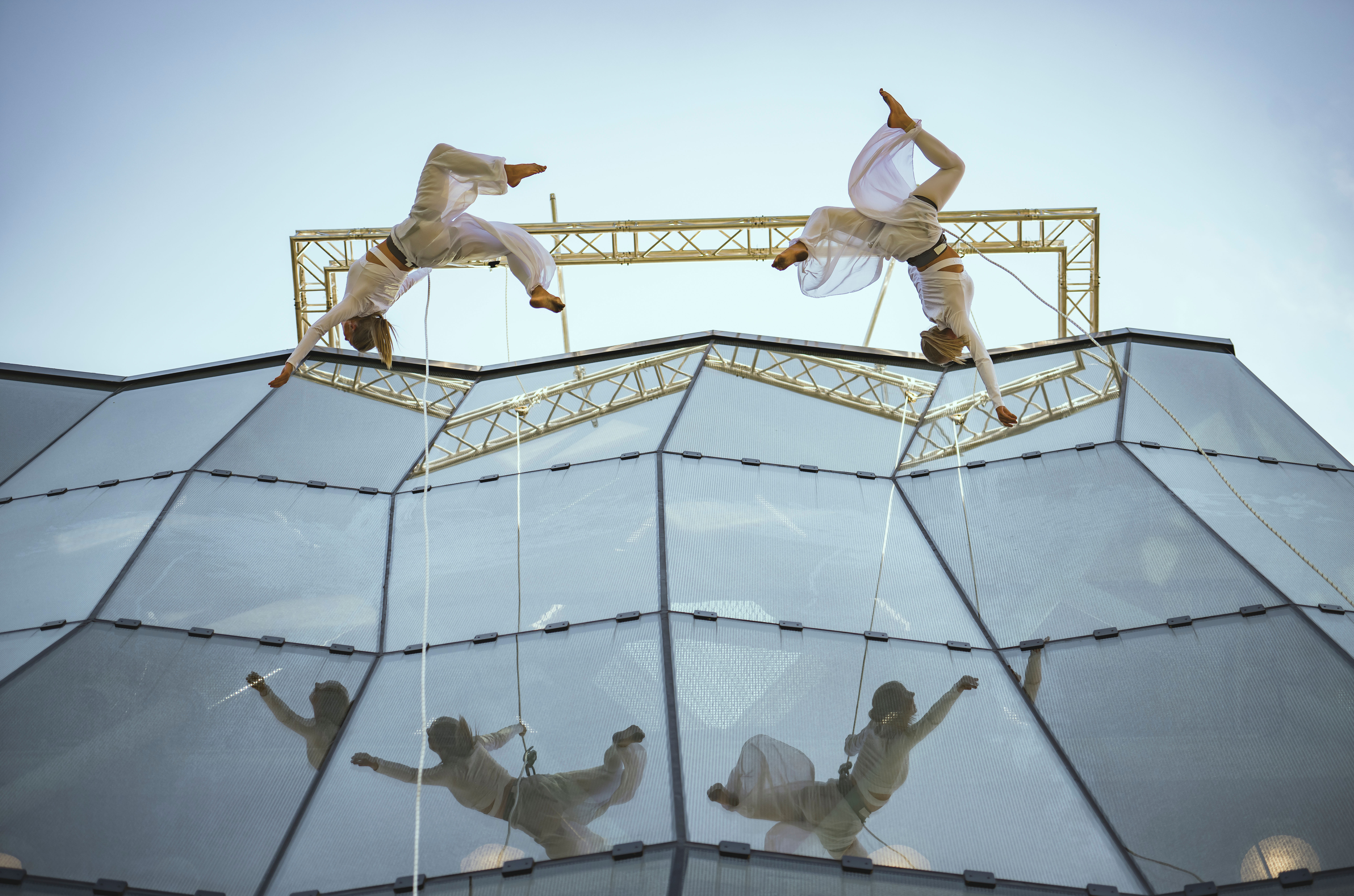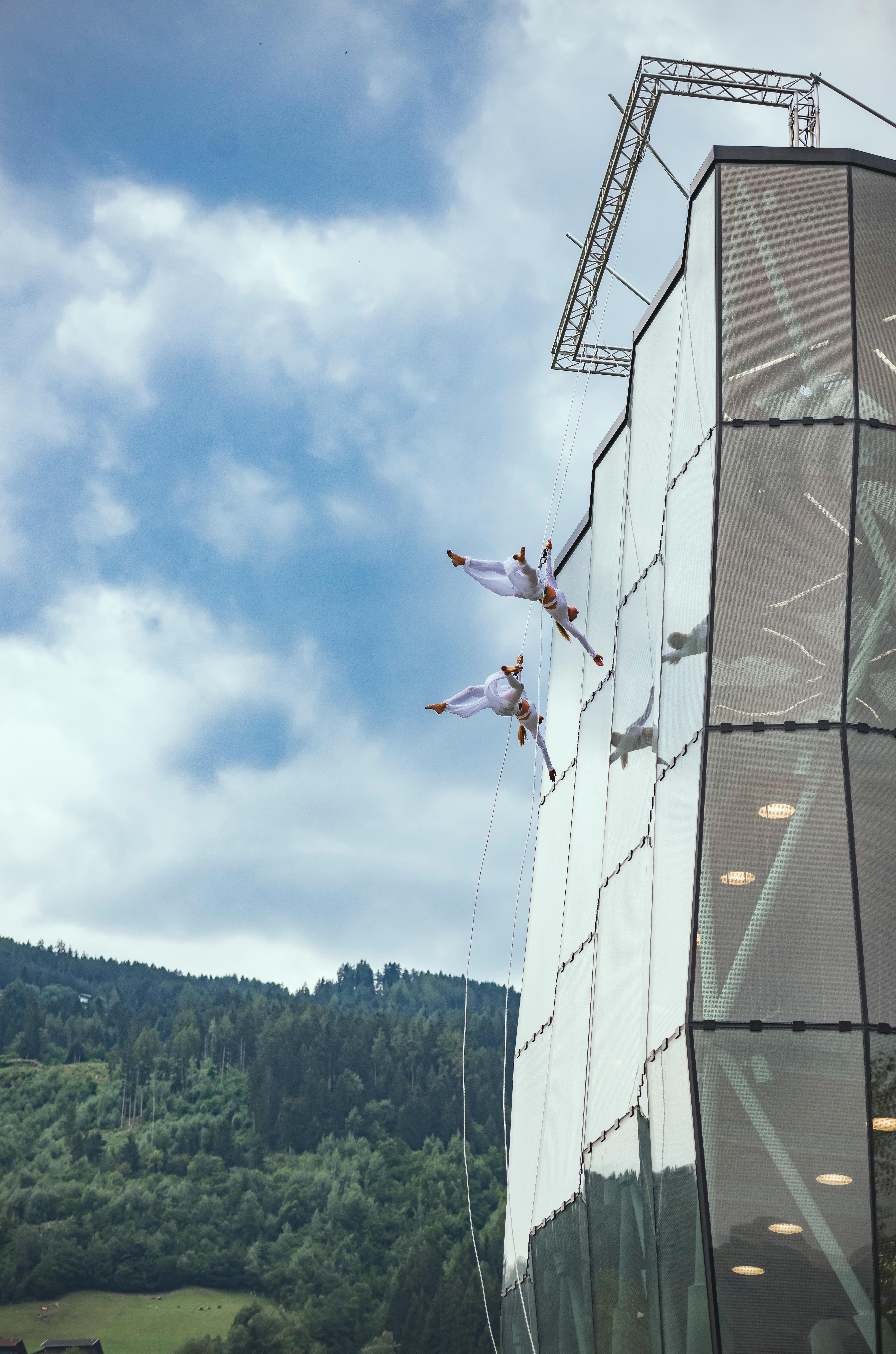 Dazzling Dancers: Schwer zu sagen, ob der Spielturm der Swarovski Kristallwelten die Tanzfläche für dieses Duo ist – oder ob sie gar in der Luft schweben. Es ist ein Meisterstück der Vertikalakrobatik und ein Tanz mit der Schwerkraft, die für wenige Momente wie aufgehoben scheint. Die Show beginnt in 20 Metern Höhe, und es geht steil bergab.