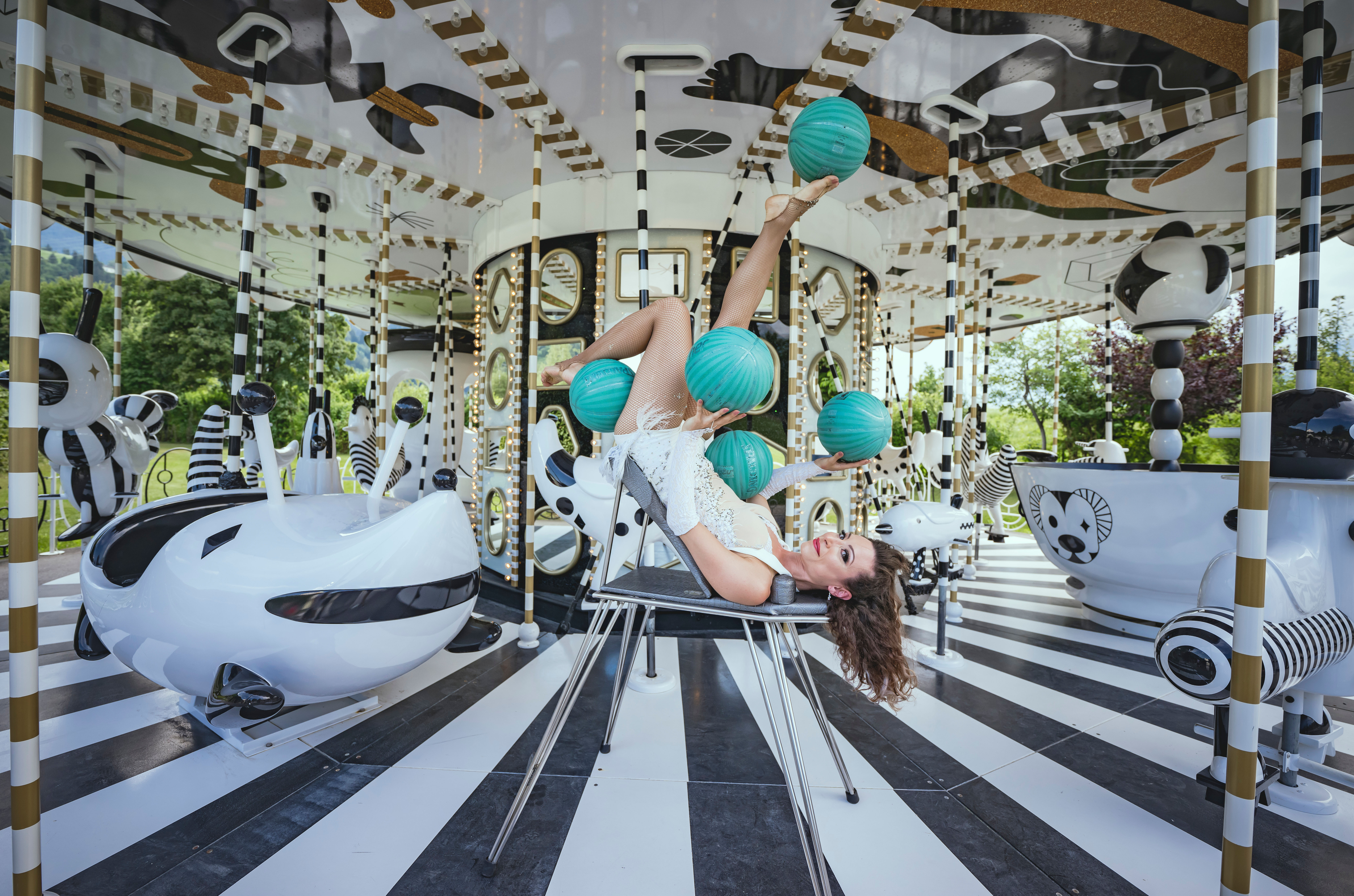 Marvel & Wonder: Eine wahre Multiartistin lässt die Besucher staunen. Ihre Accessoires sind Hula-Hoop Reifen, Rollen, Basketbälle, mit denen sie jongliert – und zwar mit ihren Füßen. Frisch ausgezeichnet beim Festival International des Artistes de Cirque in Frankreich, begeistert sie nun die Besucher:innen der Swarovski Kristallwelten.