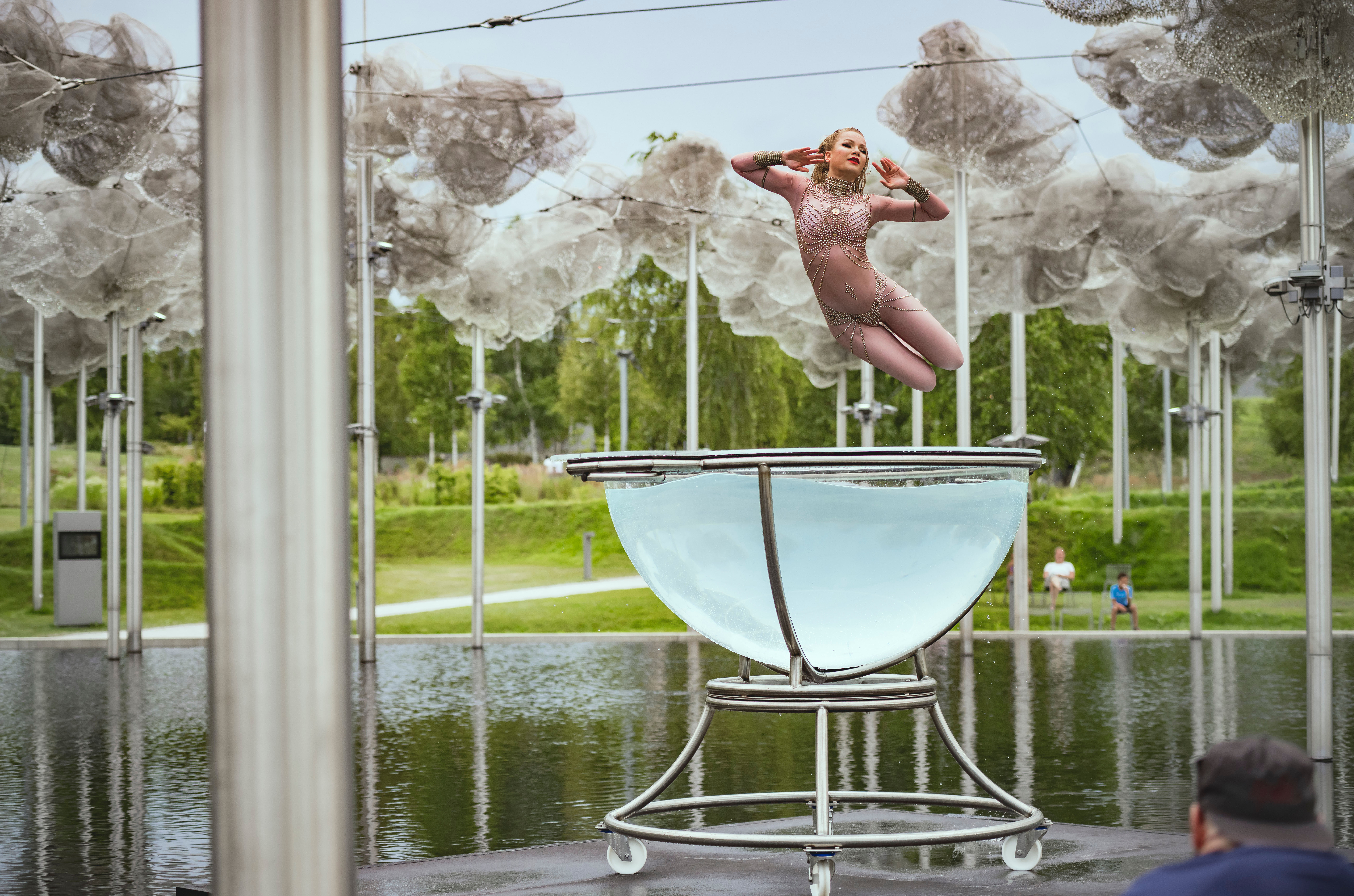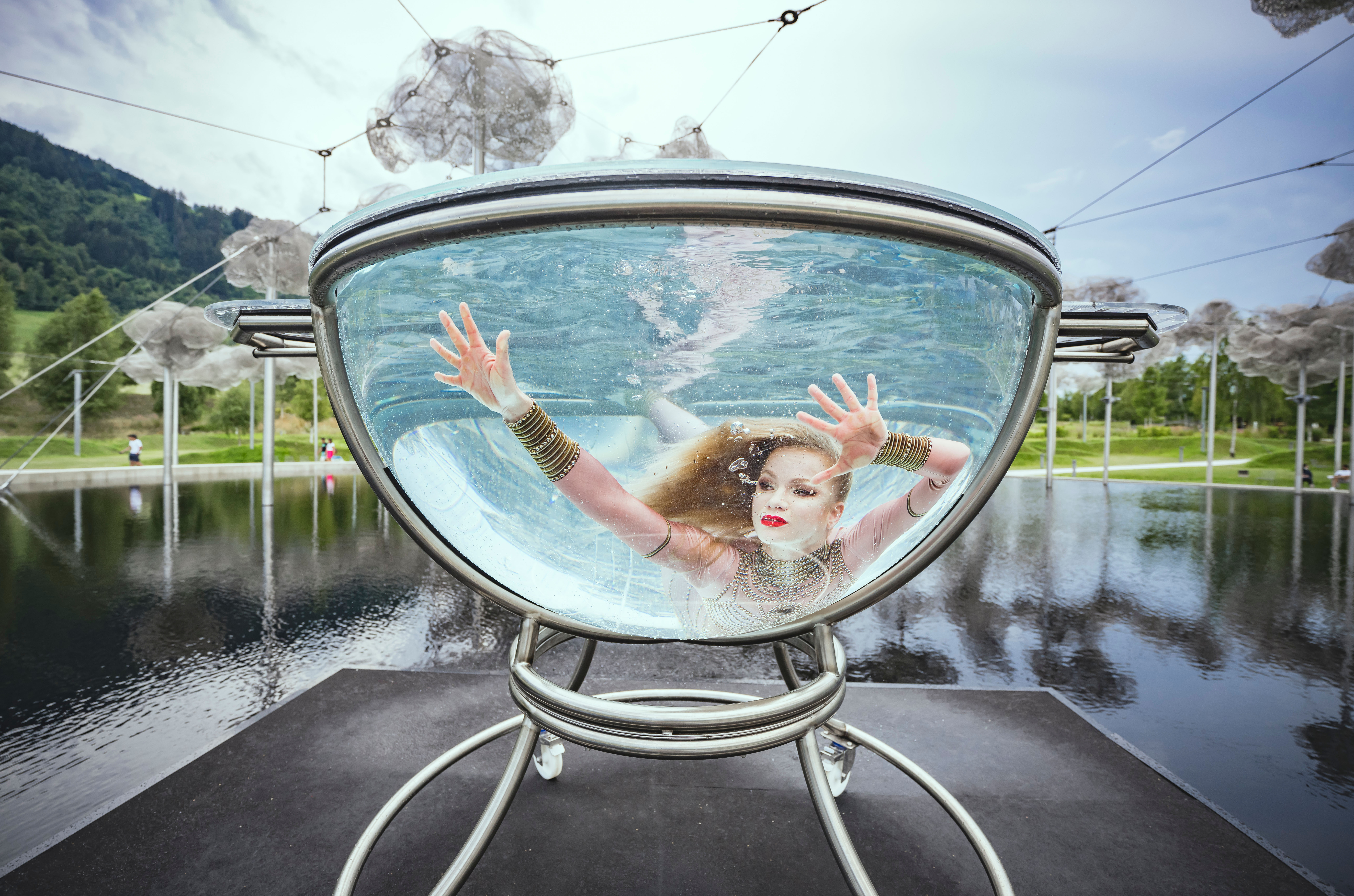 Water Ballet: Schwebend erhebt sich die Bühne dieser Akrobatin aus dem tiefschwarzen Spiegelwasser. Das Wasser ist ihr Element und funkelt mit den Kristallen der Kristallwolke um die Wette, während sie anmutig über und unter der Wasseroberfläche ihre Kunststücke zeigt.