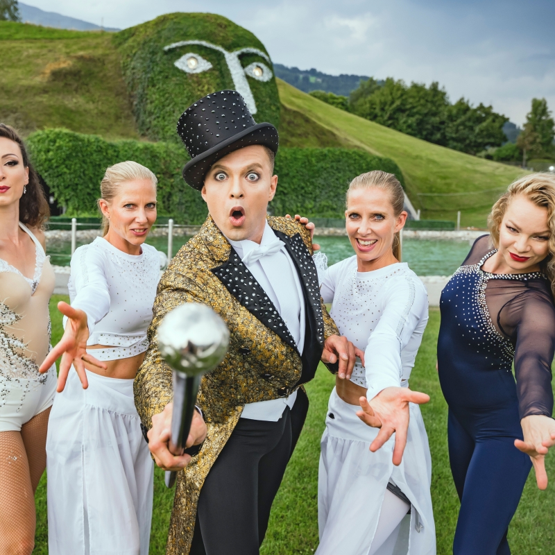 Freuen sich auf das Sommerprogramm im Garten des Riesen: In der Mitte v.l.: Lili Paul-Roncalli, Franz Hyden (Managing Director F&A, D. Swarovski Tourism Services) und Carla Rumler (Kuratorin Swarovski Kristallwelten) mit den Artisten, die bis 21. August 2022 täglich im „Garten des Riesen“ in den Kristallwelten auftreten werden.