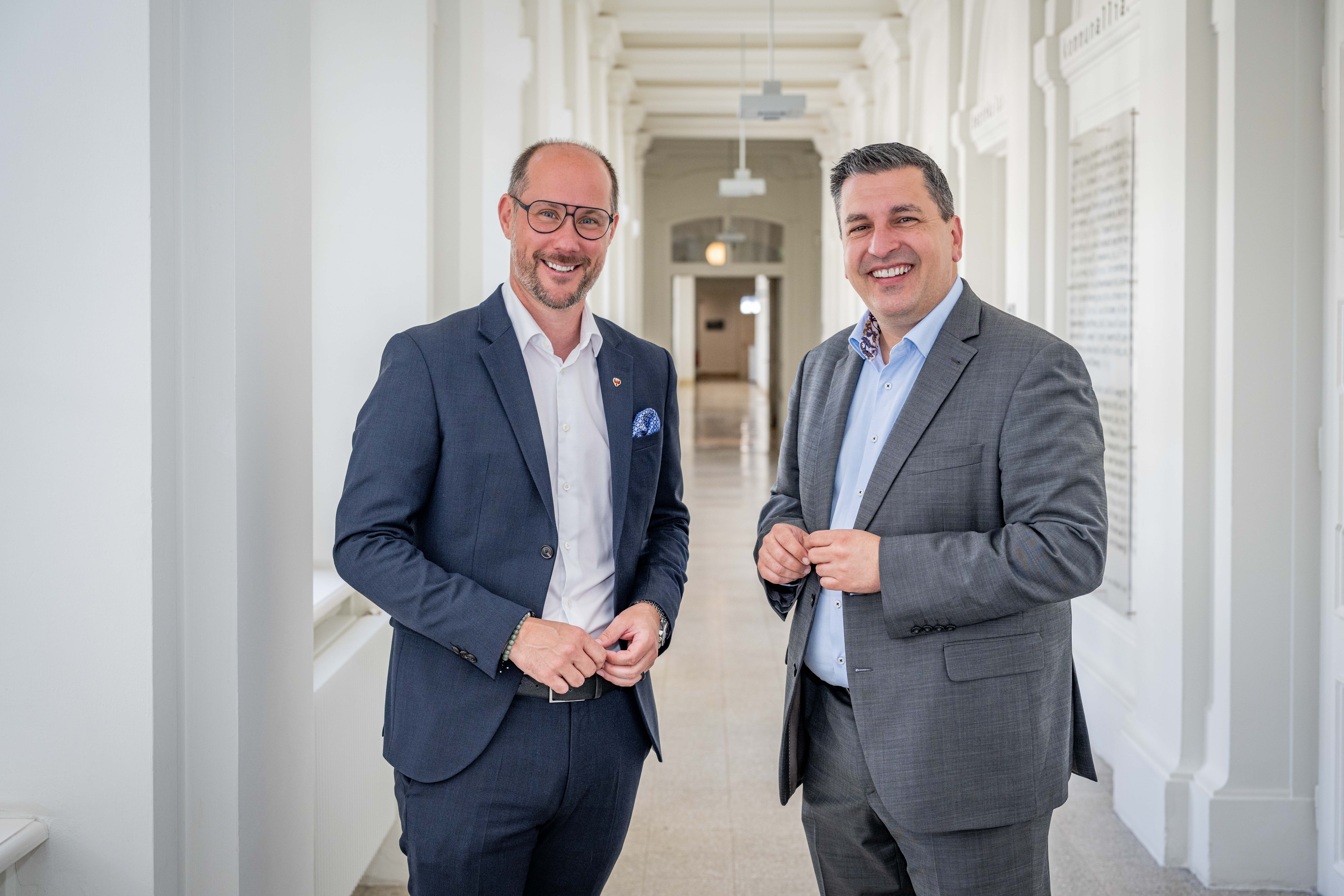 Mit 27 Betriebsansiedlungen und 13 -erweiterungen zeigt sich Tirols Wirtschaft auch 2025 als wachstumsorientiert und innovationsstark. Im Bild v.l.: Mario Gerber (Landesrat für Wirtschaft, Tourismus und Digitalisierung) und Marcus Hofer (Geschäftsführer der Standortagentur Tirol).
