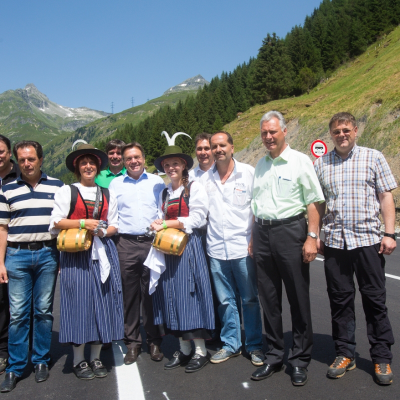 Feierten die offizielle Eröffnung der Felbertauern-Ersatzstraße, die im Urlauberreiseverkehr eine enorme Entlastung bedeutet (v. li.): Landeshauptmann Günther Platter, Marketenderin, Karl Popeller (Vorstandsdirektor der Felbertauernstraße AG) und der technische Leiter der Bauarbeiten, Michael Köll.